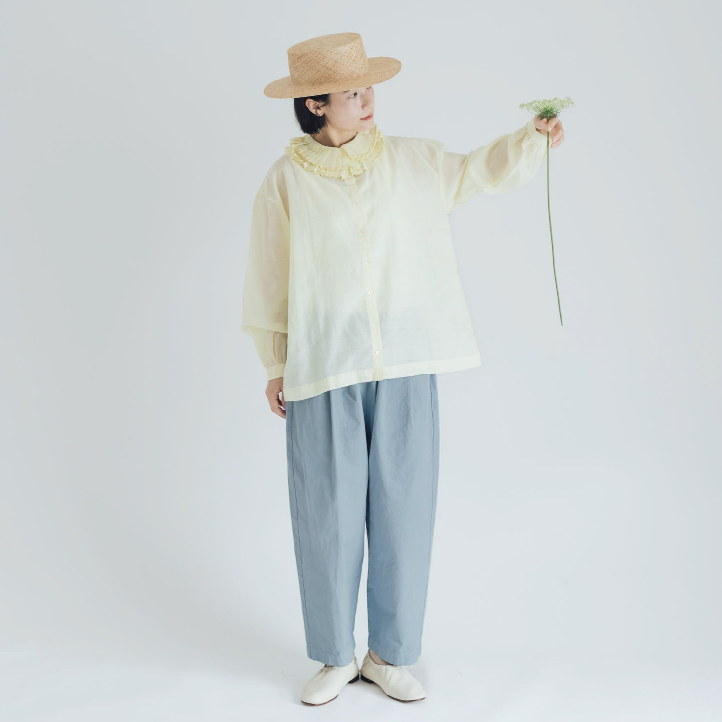 AMASISという甘撚りのオーガニック高級綿を原料に、ウェザー(高密度の平織り)に織り上げたオリジナルの生地を使用。しっかりとした厚みでハリ感がありながらも程よい柔らかさと膨らみがあり、軽やかな履き心地が特徴です。生地にある程度の厚みがあるため、透け感もほとんど気になりません。そこにカジュアルでこなれた雰囲気を出すために、仕上げは製品染めを施し風合い豊かに仕上げました。