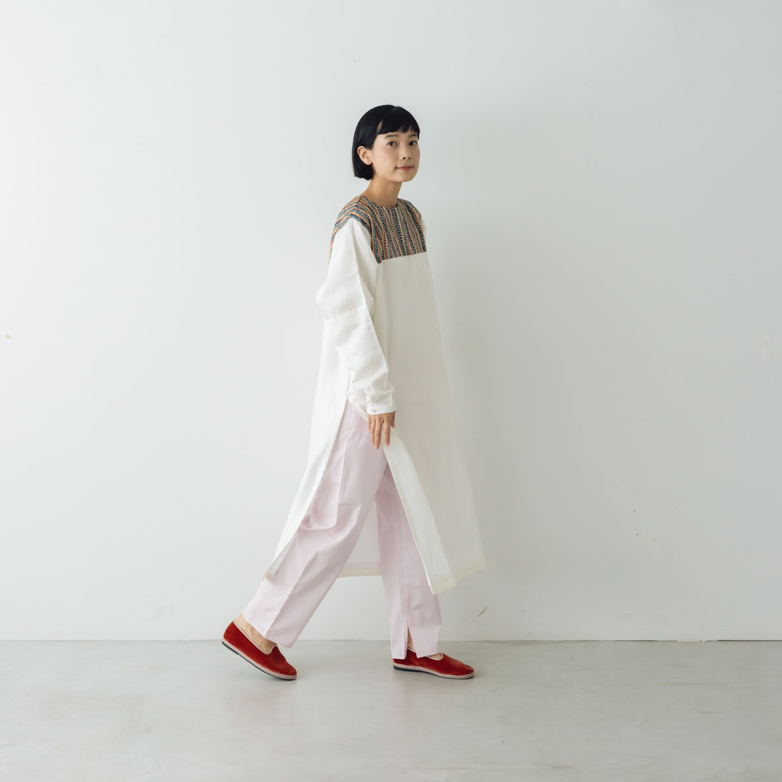 サイドには深めのスリットが入っているので、シルクパンツやコットンのロングスカートなどを合わせて。