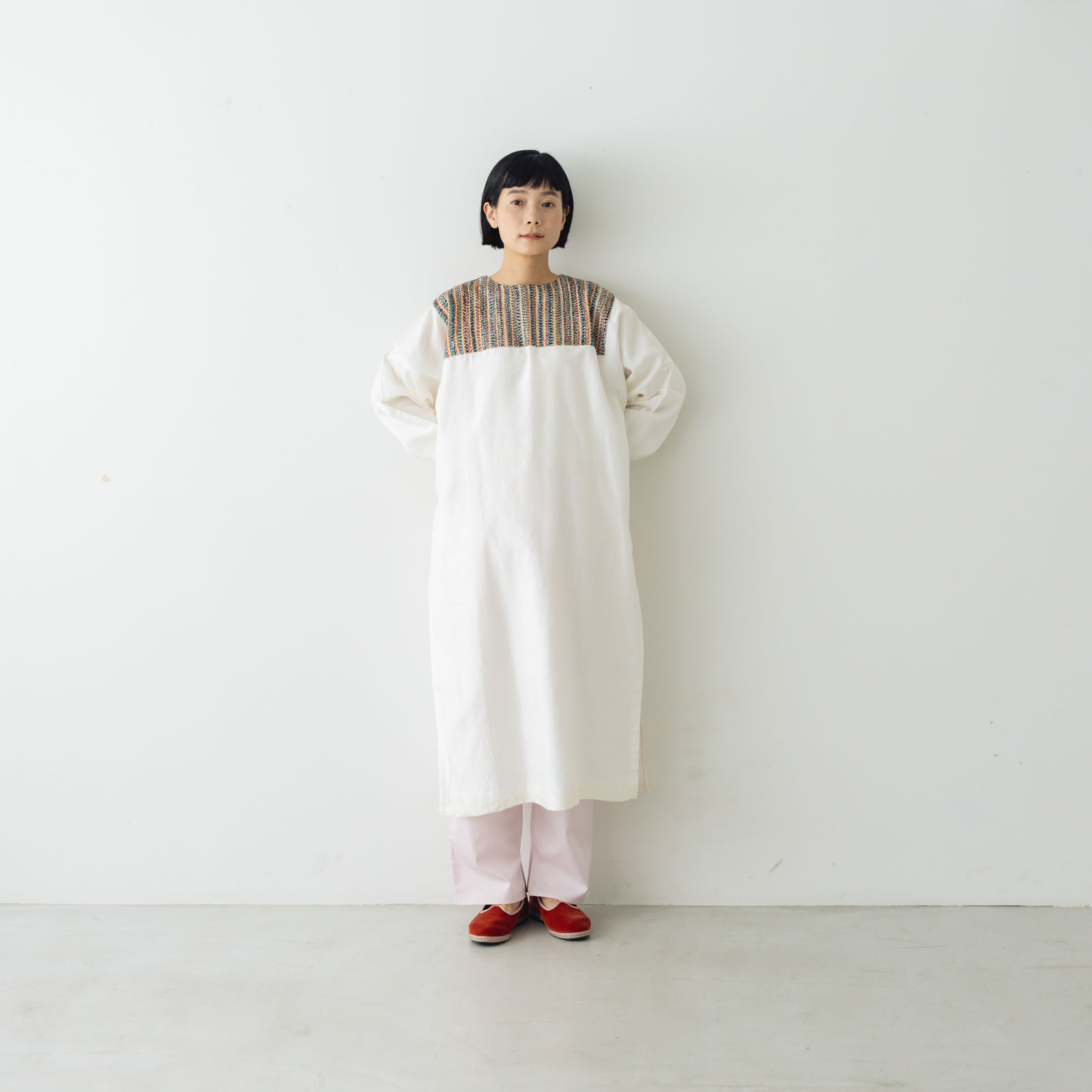 セーラーカラーの形に手刺繍を施したコットンドレス。色とりどりの糸を使用した細かいステッチがアジアやアフリカを彷彿させるエキゾチックな一枚。その一針一針刺されたステッチにインドの女性の手のぬくもりを感じます。