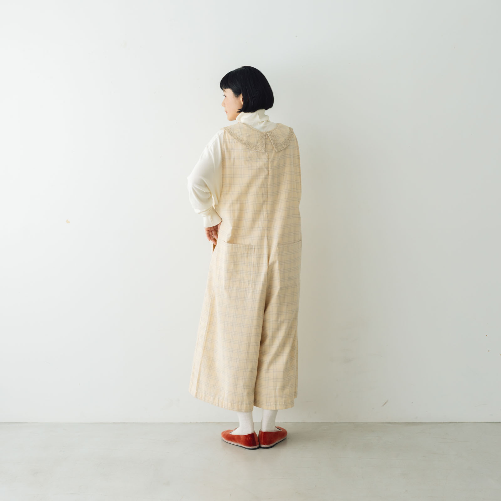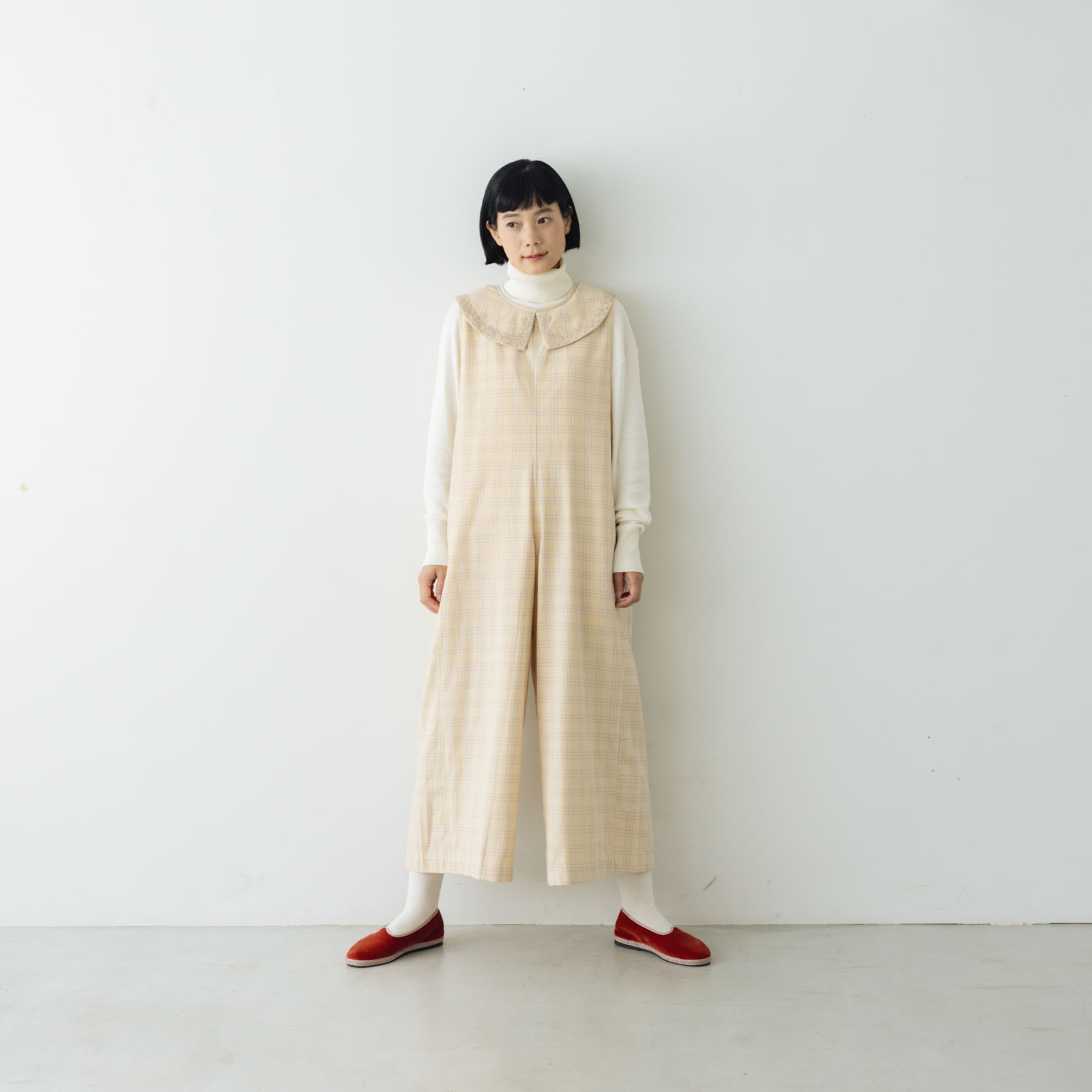 手刺繍で美しく飾られた大きめのえりが特徴的なオーバーオール。本体のファブリックにはチェック柄をチョイスし、えりには柄の上から大胆に刺繍を施しています。