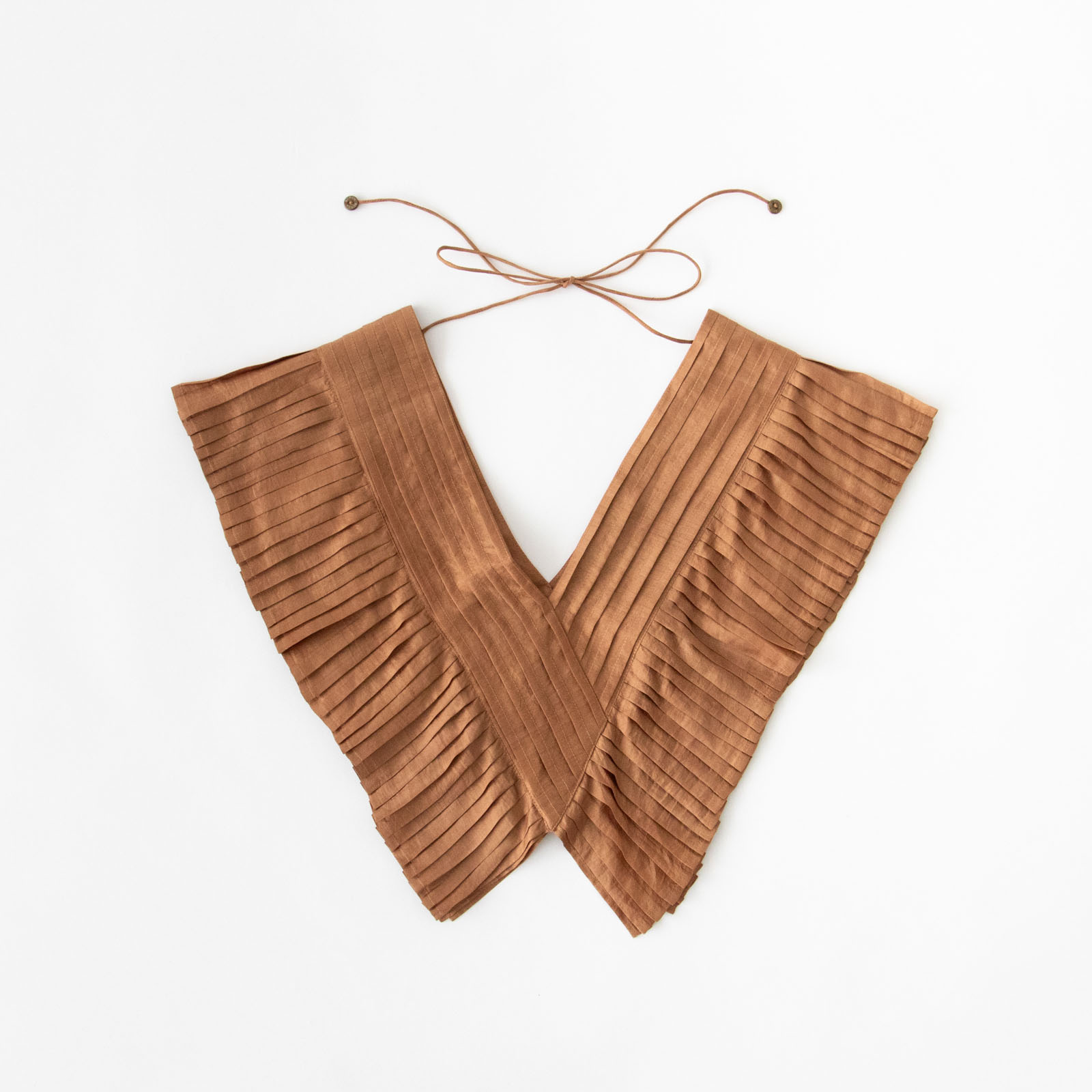 シンプルなお洋服に足すだけで、一気に華やかなコーデが完成する大きな付け襟。シルク素材で作られたいくつものプリーツが美しい一枚です。