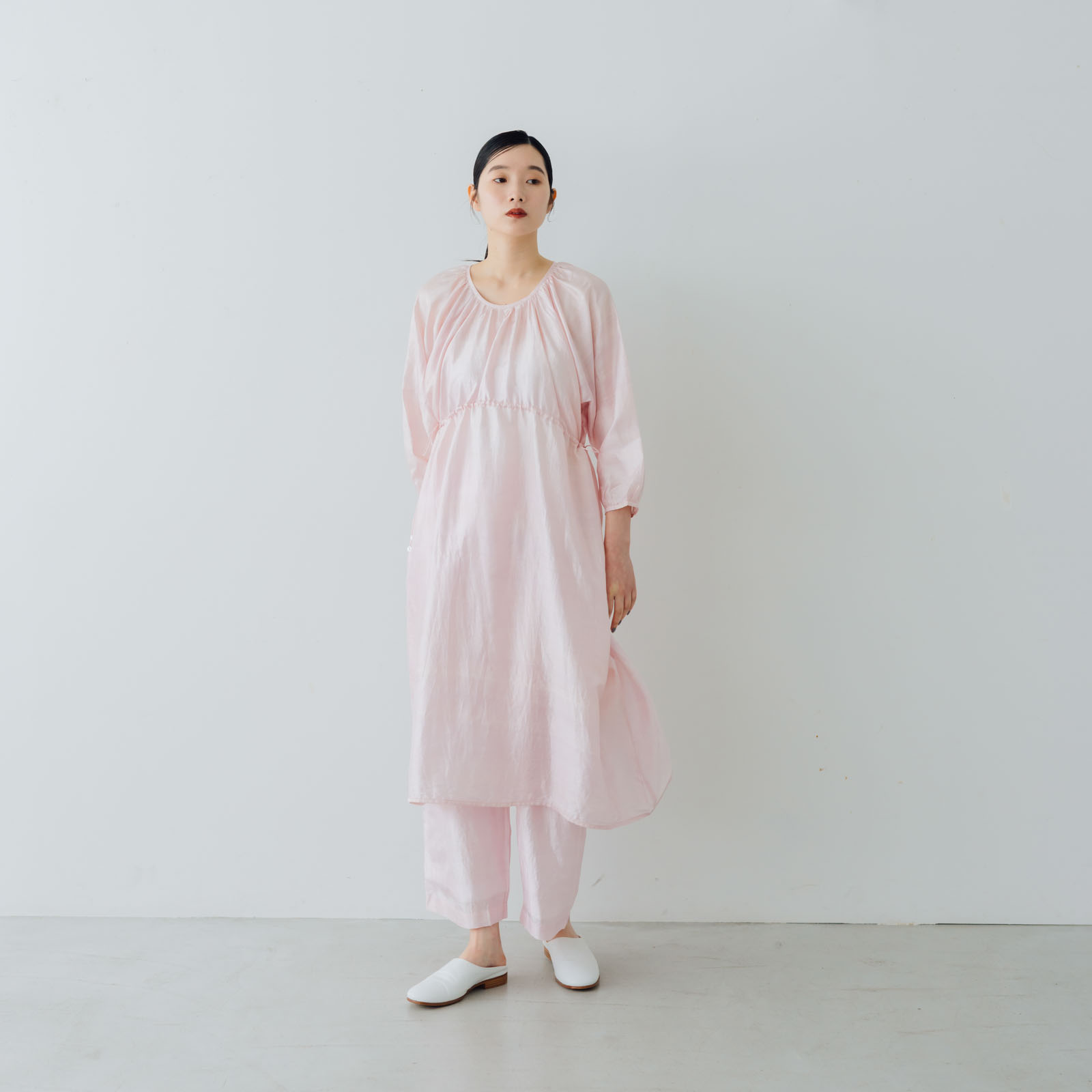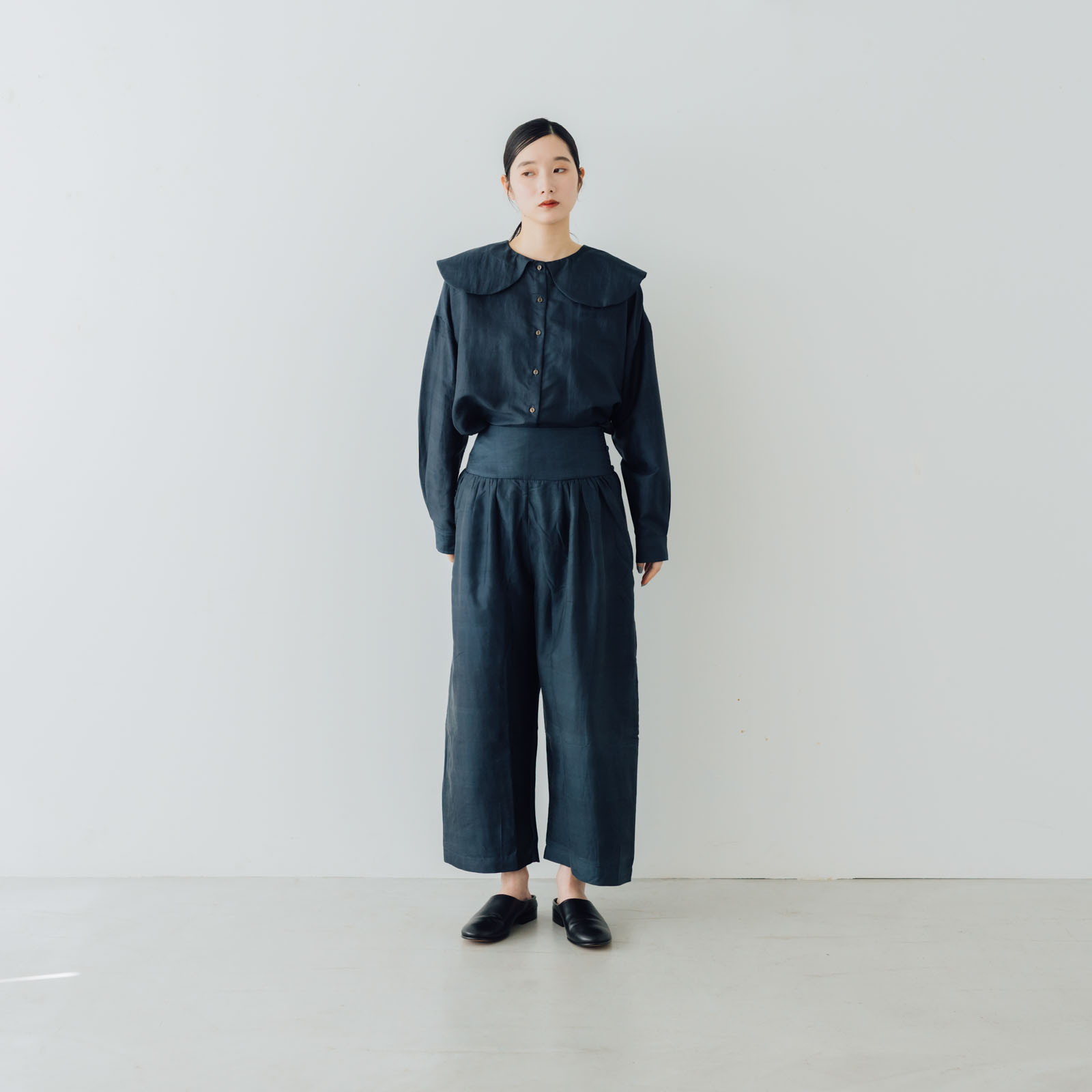 太いベルトのようなウエスト部分の下にはタックが施され、脚のラインを拾わないワイドシルエット。ウエストの左サイドには小さなくるみボタンがころころと縦に整列。