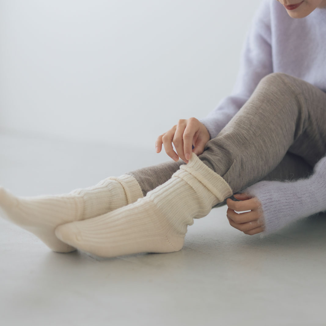 ふんわり柔らかな肌触りのjohaの靴下。シンプルなリブ編みは飽きがこず、定番アイテムとして長く着用して頂ける1足。