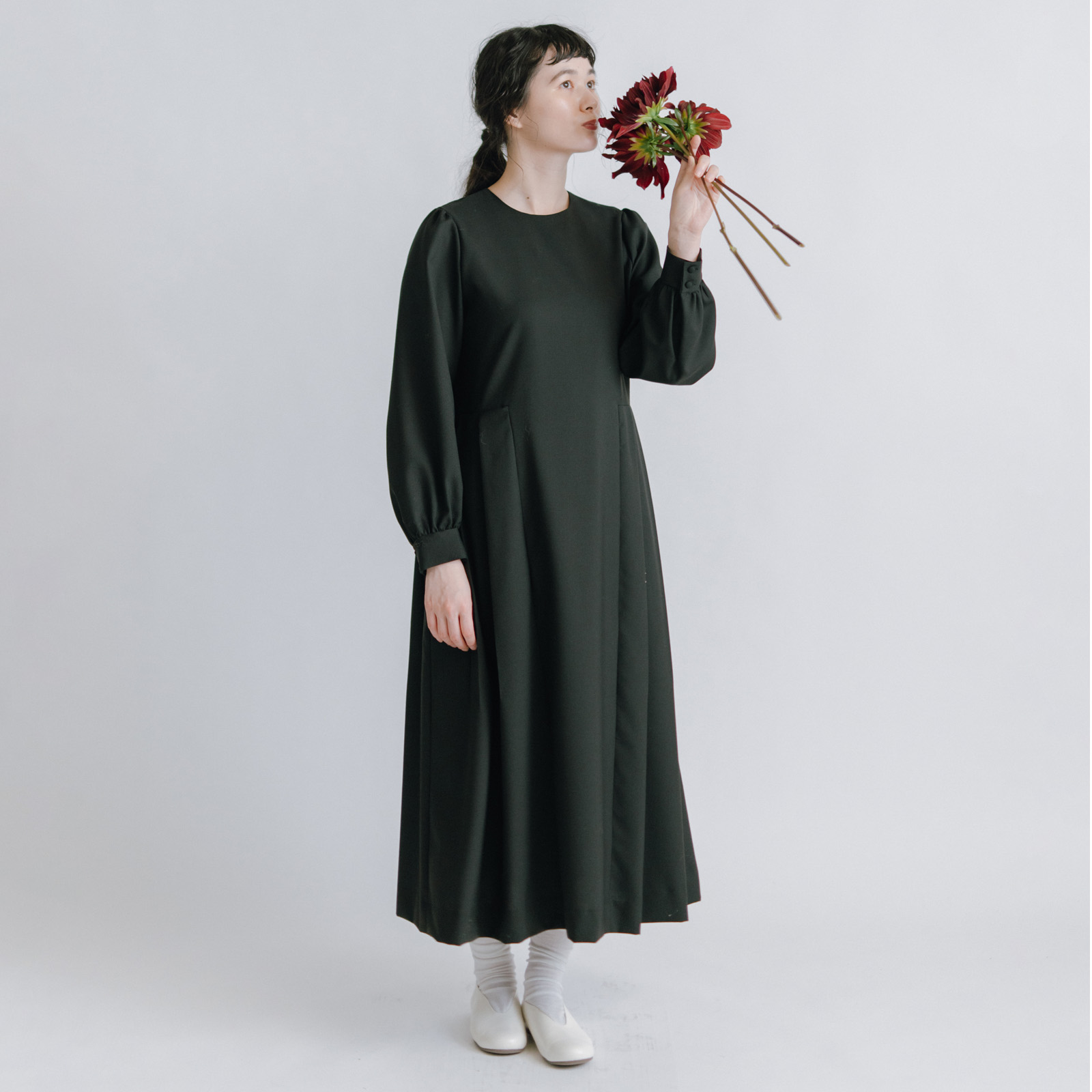 どんな人にも似合うプレーンなデザインながら、袖口に並んだボタンや、サイドから後ろにかけて入れたタックで美しいシルエットを生み出します。長袖のブラックワンピースは是非1枚は持っておきたいワードローブです。