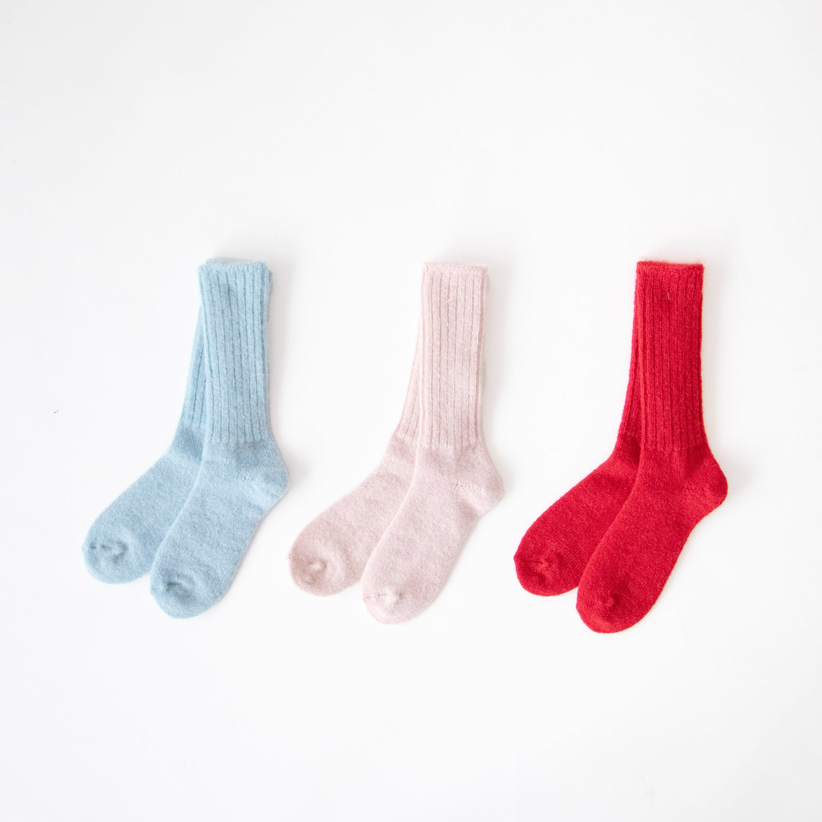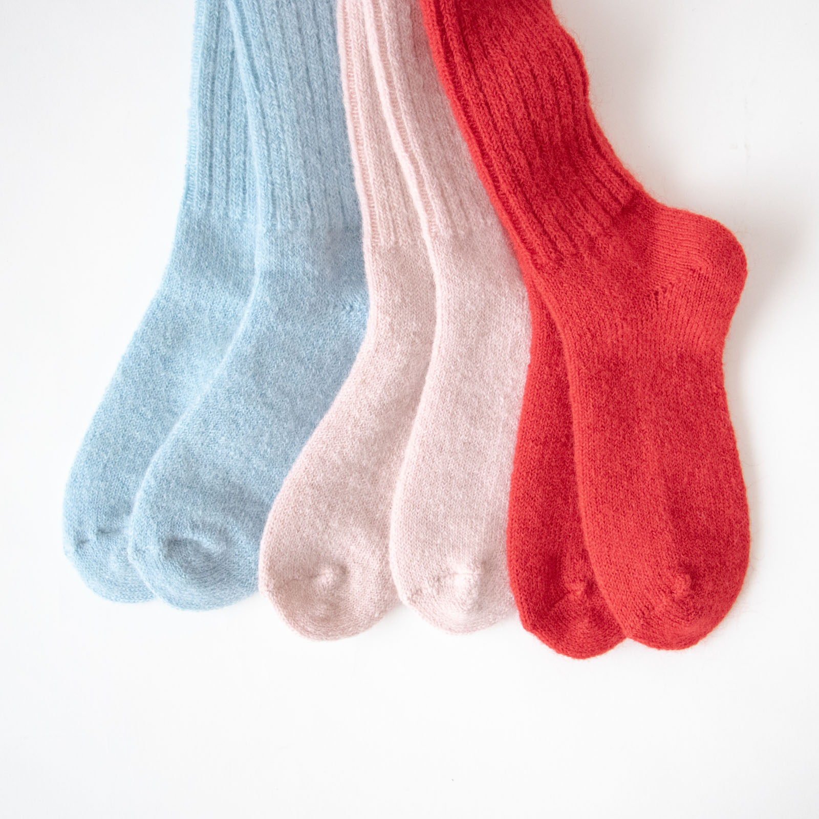 今季のカラーはサックス、ピンク、レッドの3色で冬のスタイリングのアクセントとしても◯。キャンディーのようなカラフルさで色違いで買いたくなる、文句なしの靴下です。
