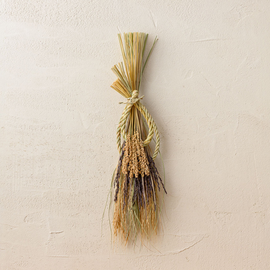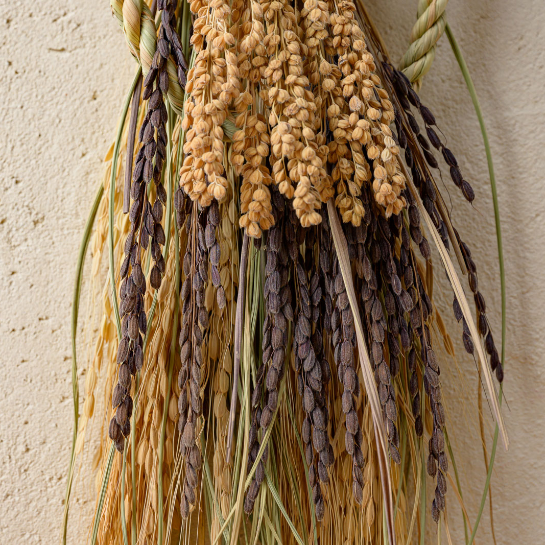 色合いの違う稲穂を重ねたしめ縄は、色味のコントラストが美しく、一般的なしめ飾りと一味違った雰囲気を纏っています。お部屋のインテリアとしてもお楽しみいただけます。