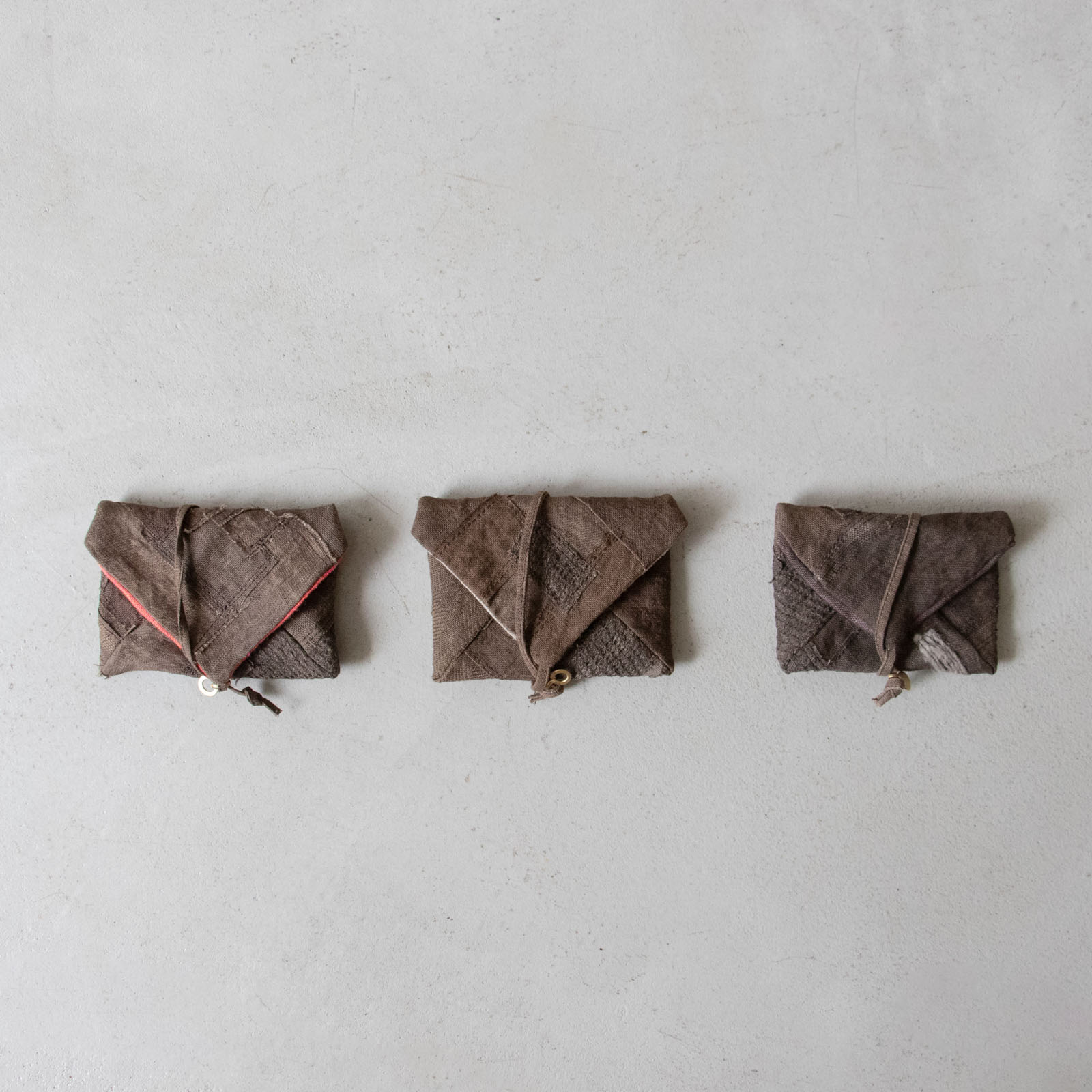 小さな布片を丁寧に縫い合わせてつくられた、パッチワークのひもをくるくると巻いて留めるポーチ。