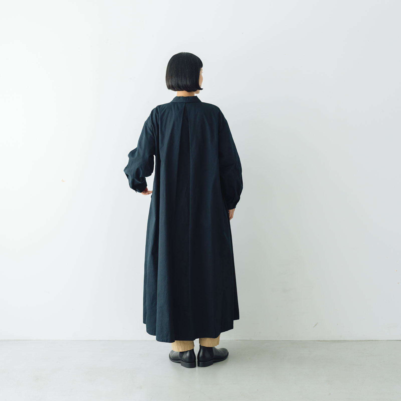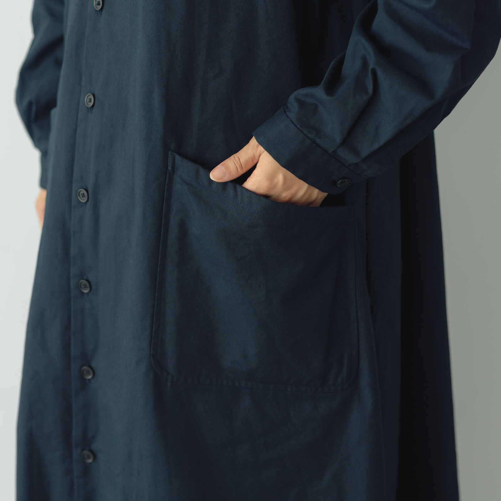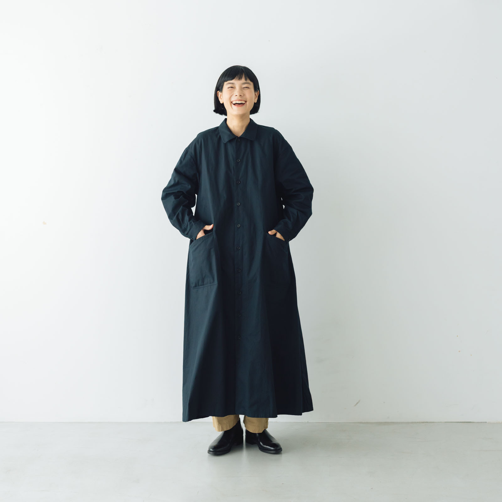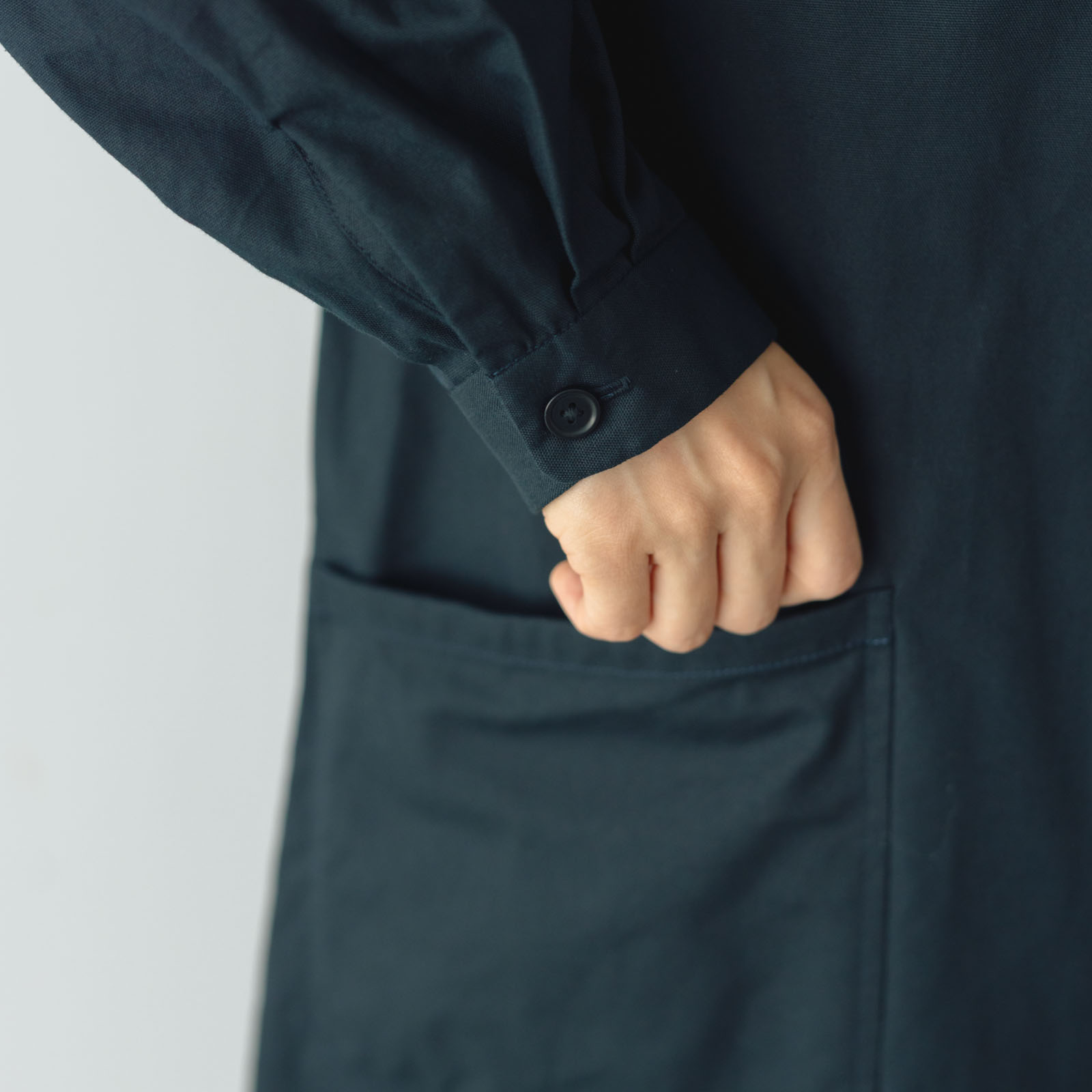 作業着をモチーフに仕立てられたワークシャツドレス。 アーティストが作業するときに着るアトリエコートのような雰囲気の一着です。