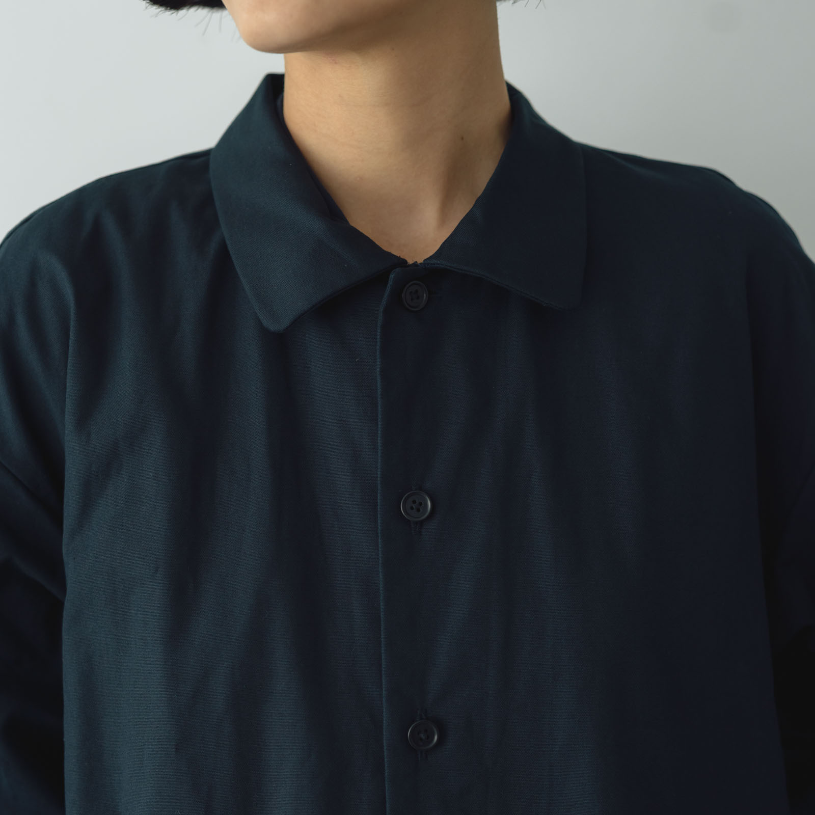 高品質なコットンで作ったオリジナルのチノクロスは、程よい厚みがあり、やわらかく、なめらかな肌触りの生地。フロントには小さめのえりと、その下には生地と同色のボタンがずらりと並びます。