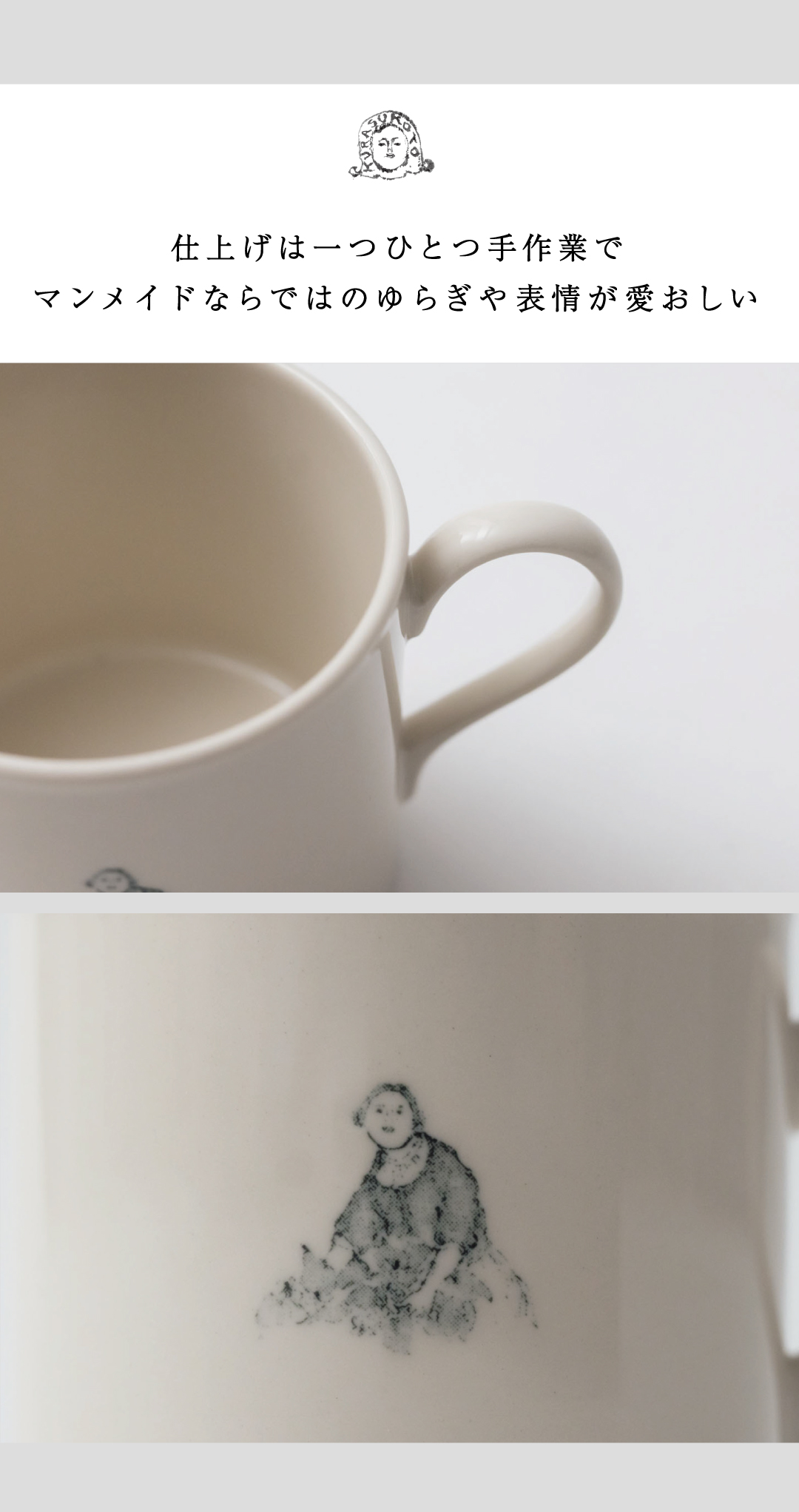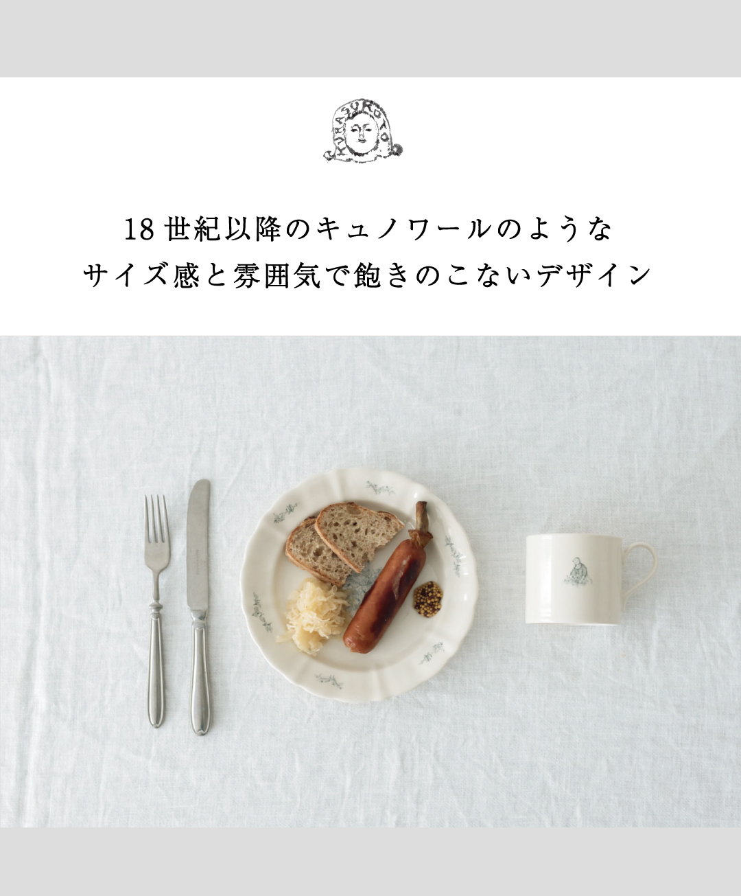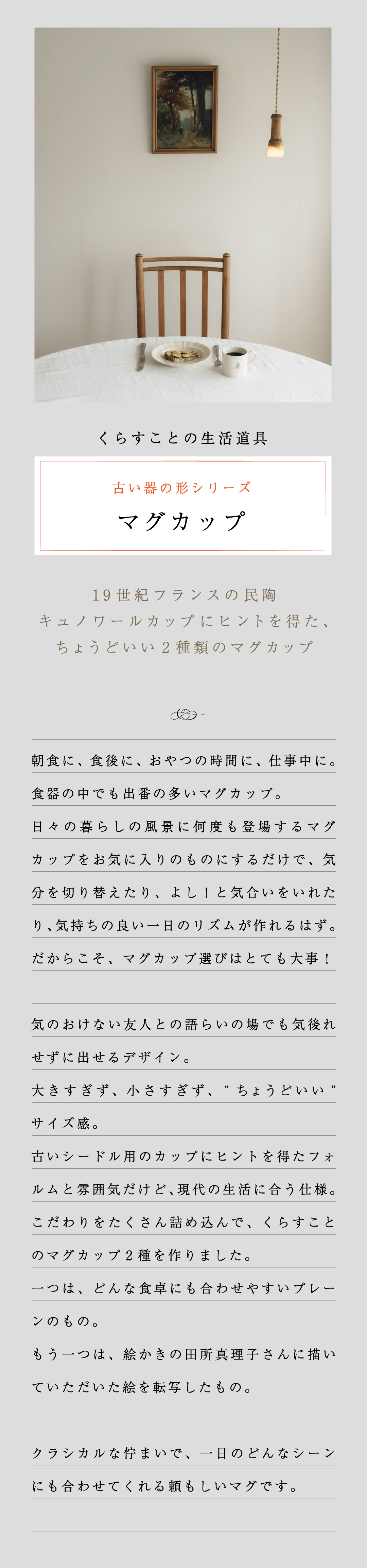 18世紀以降フランスでシールド用に作られたキュノワールのマグカップをヒントに、ストレートボディに小さめのサイズ感を採用。すっきりとしたボディに、大きめのハンドルを付けてよりクラシカルな印象に。やさしいお色味なので、古いお皿とも違和感なく並べていただけます。どのシーンにおいても目立ちすぎることはありませんが、その凛とした佇まいは特別な空気を纏っています。