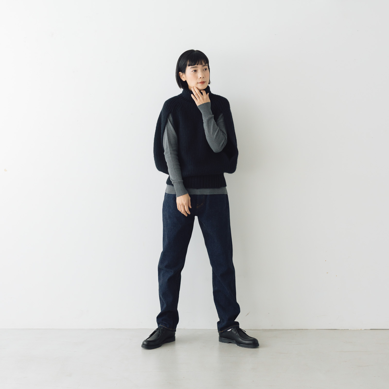 進化系のニットベストをいつものコーデに重ねるだけでおしゃれな着こなしに!一枚持っておくとコーデに変化を付けられて重宝します。