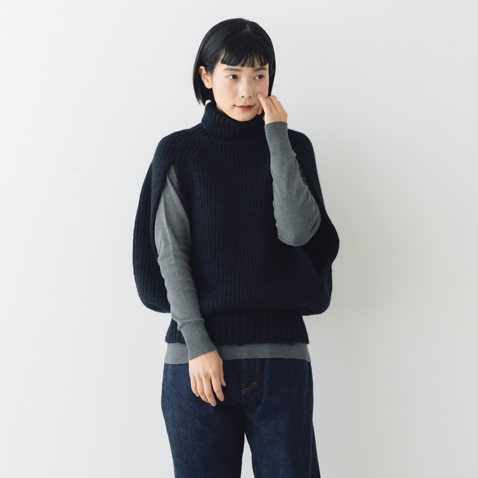 腕を出すベスト型なので、家事やお仕事の時にニットの袖が邪魔になったり、袖が汚れたりすることもありません。