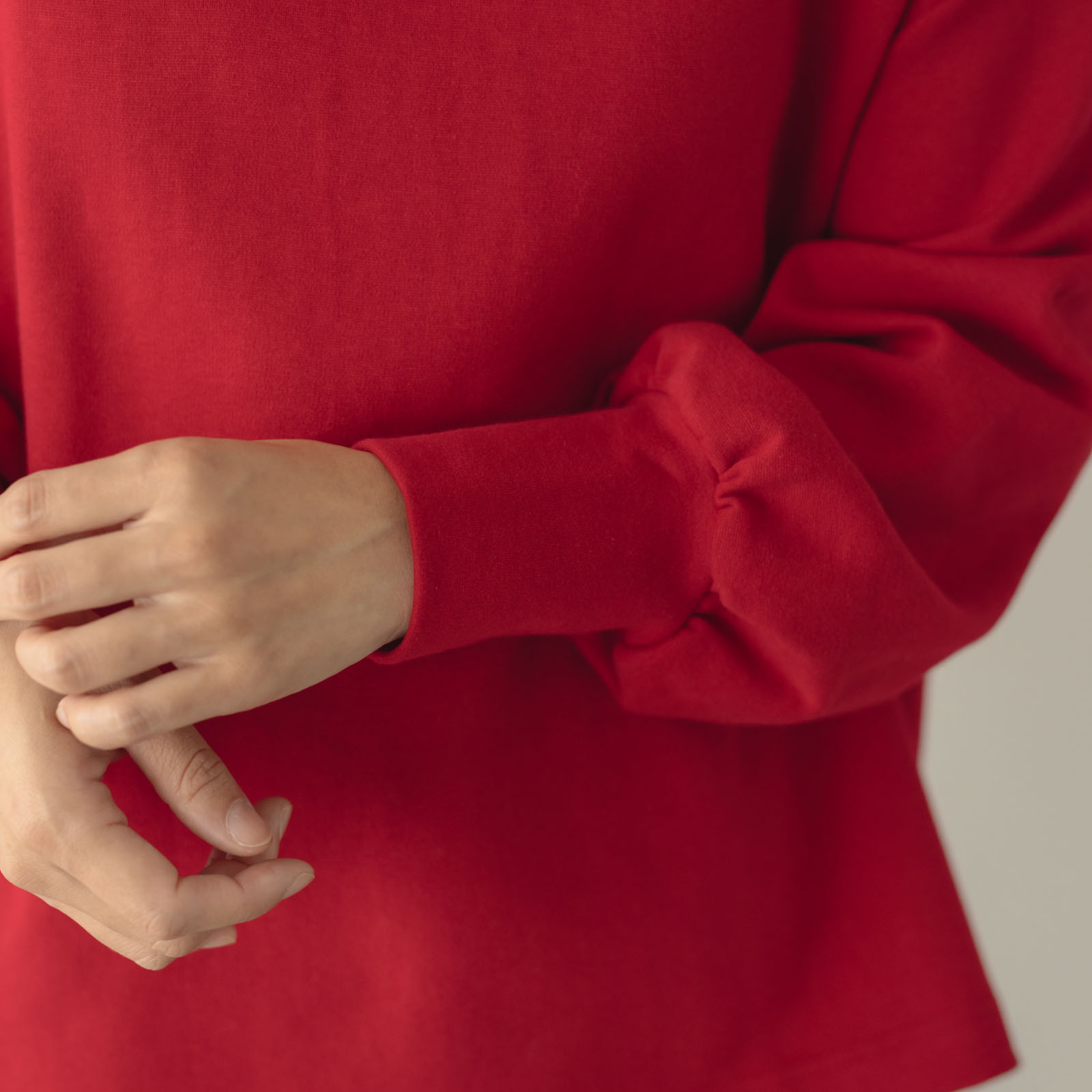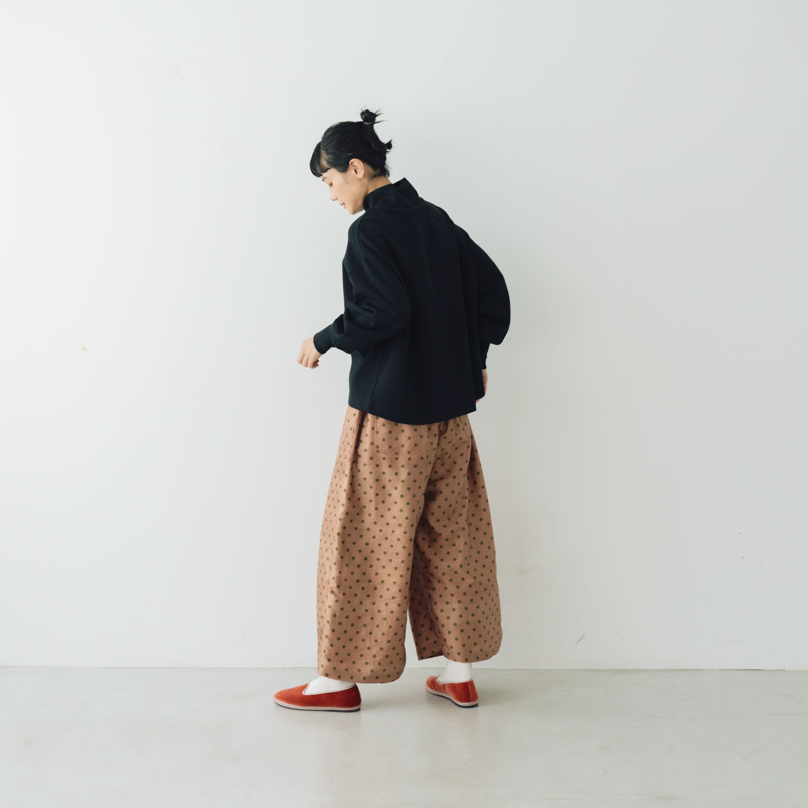 肩のラインが落ちたドロップショルダーに、袖口にギャザーが入ったふんわりボリュームのある袖で、リラックスして着られるのに、品良くまとまります。肌寒い時期には、中に薄手のインナーの重ね着も◎。