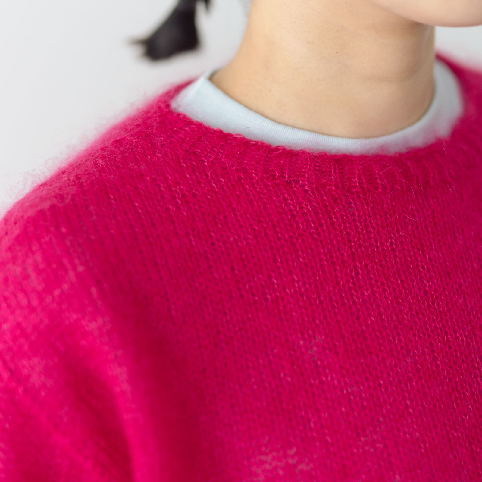 女性の憧れ、シルクとアンゴラ山羊のモヘアで編み立てた上質ニット。アンゴラ山羊のふわふわとしたモヘア糸とシルク糸で編み立てられているから肌触りがとても滑らか。