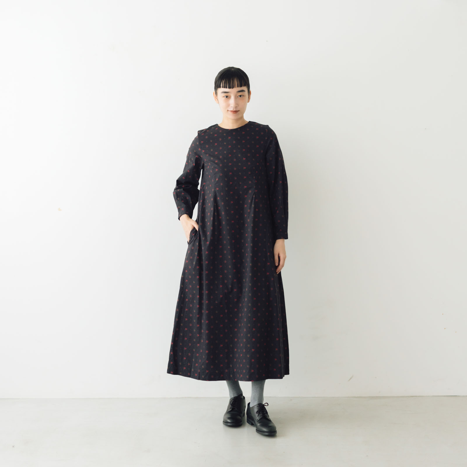 今季のYAECAのAラインドレスは、小さな赤いお花が散りばめられたリバティ柄。