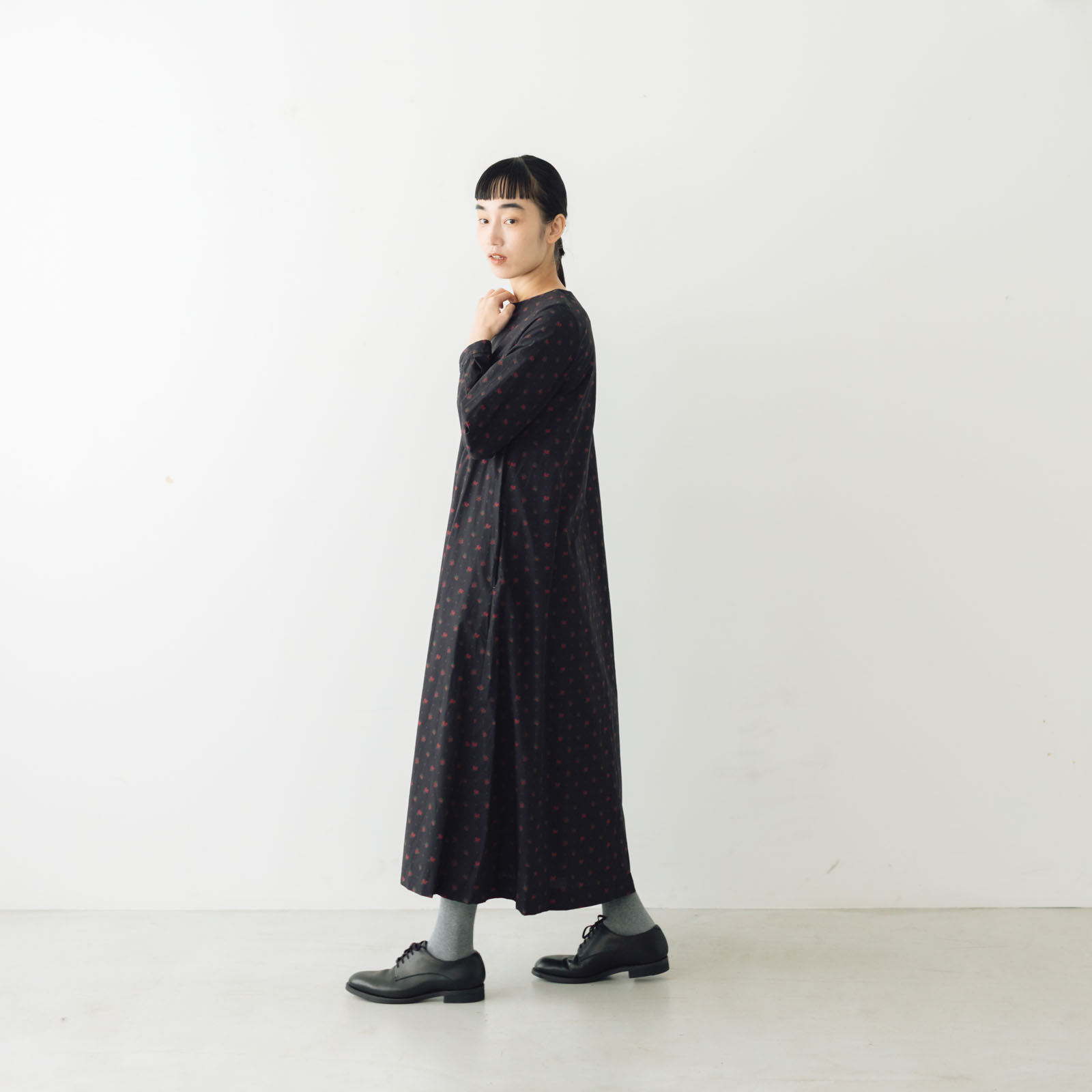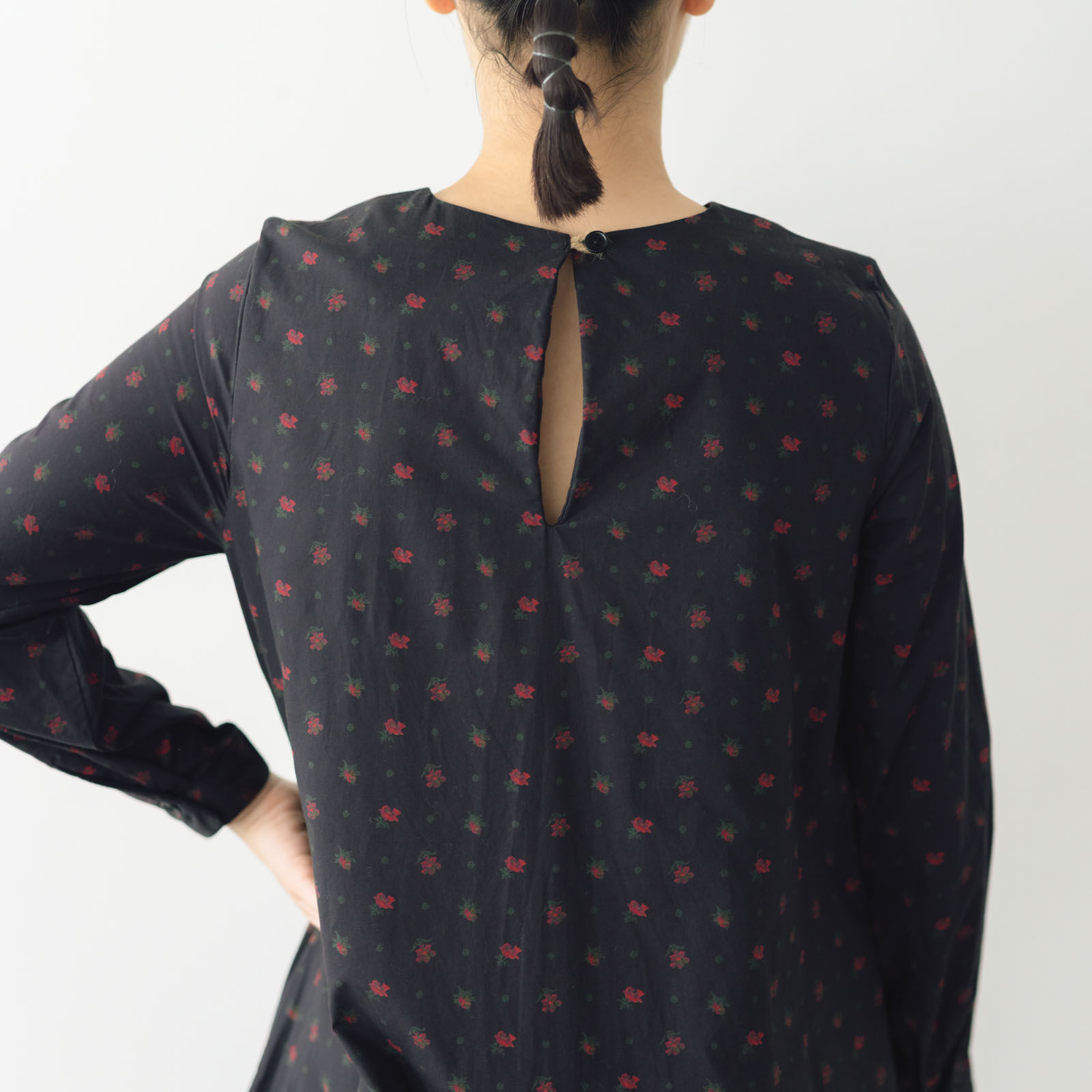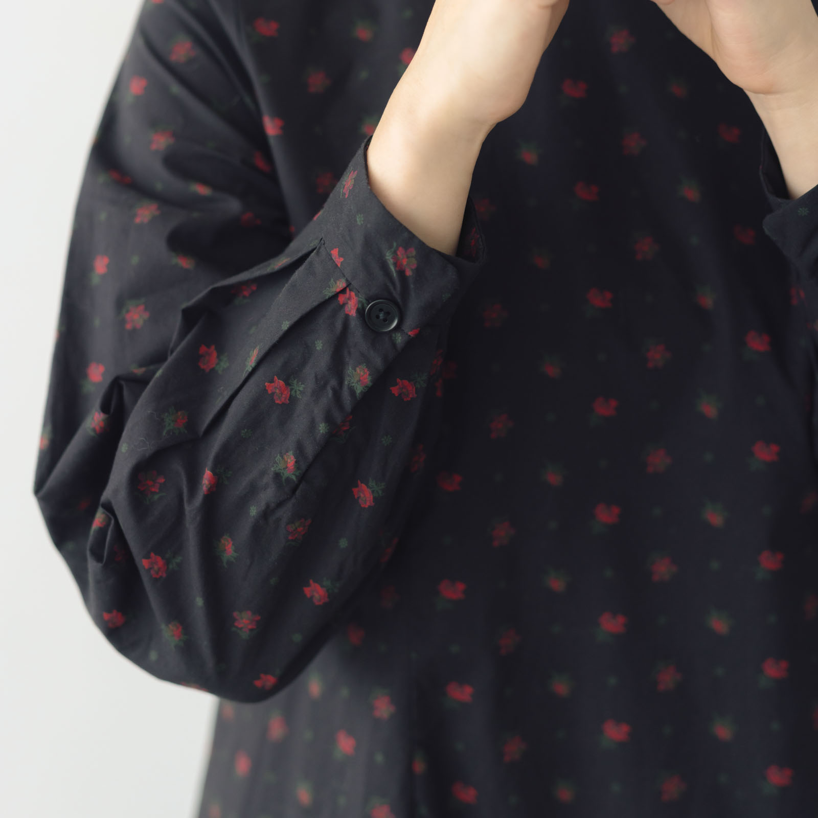 黒地に赤いフラワーモチーフを配した、気品高く大人の雰囲気のあるファブリックは、YAECAのオリジナルコットンに、英国リバティ社のお花柄をプリントした特別なもの。シルクのようなさらりとした生地感なので、季節を問わずシーズンレス、着る場所を選ばないシーンレスにお召しいただけます。