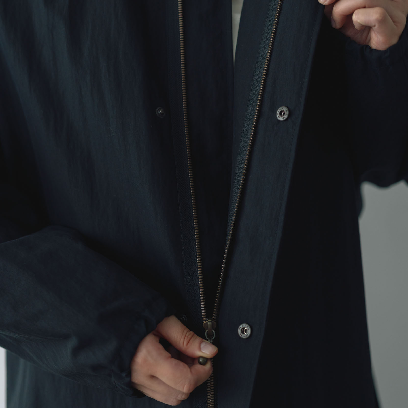 軽くさっと羽織れるロングコート。コットンナイロン生地を使用したスポーティなカジュアルさをシルエットやデザインでモードな雰囲気の1枚に仕上げてあります。