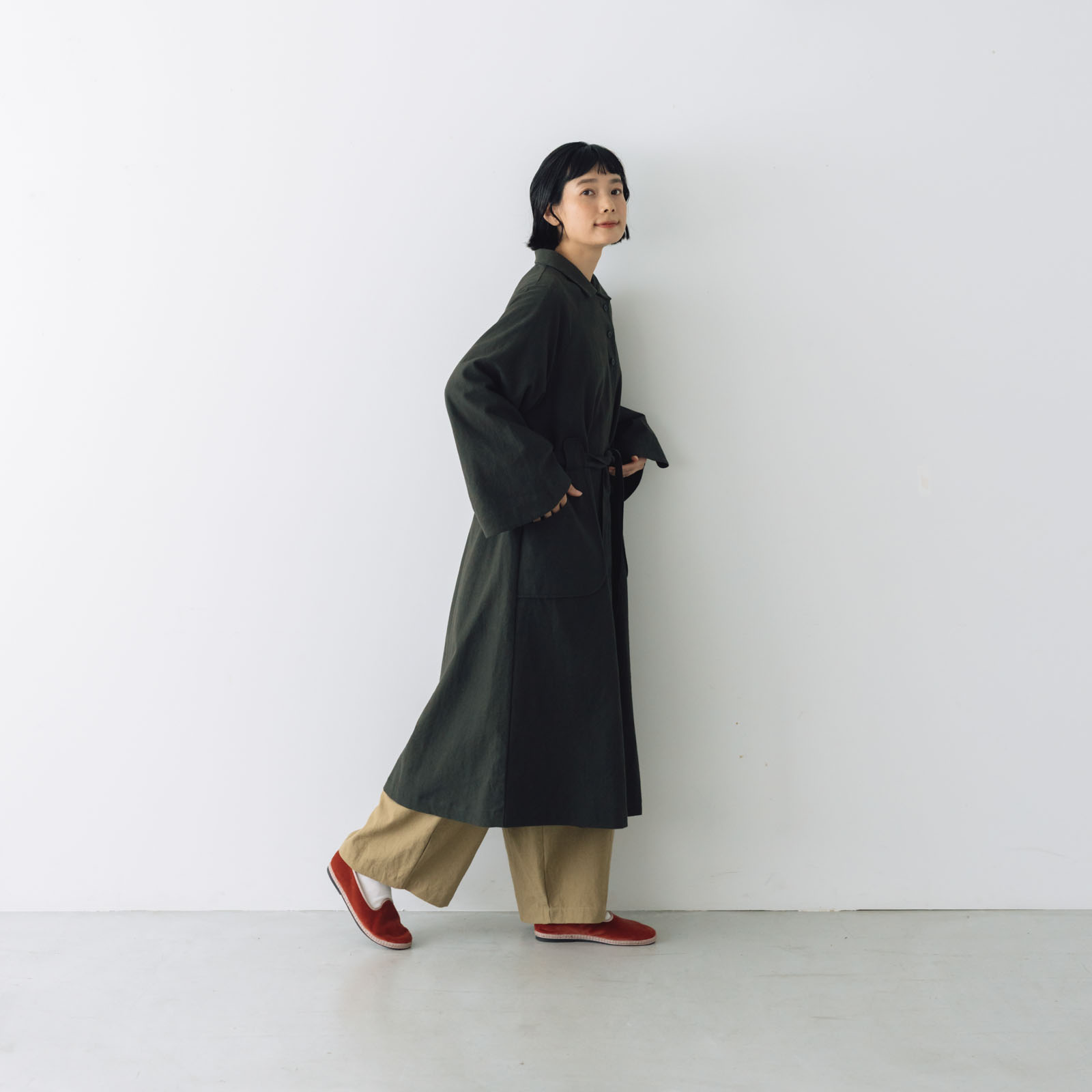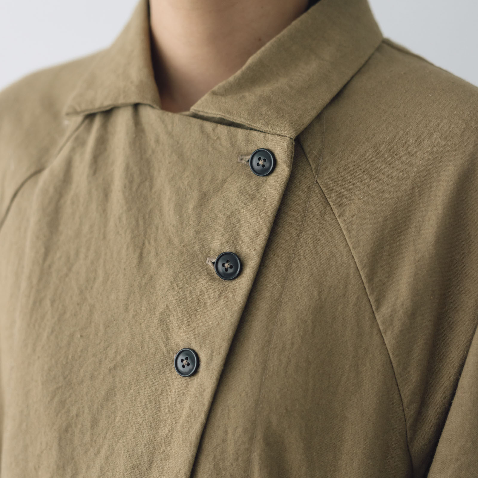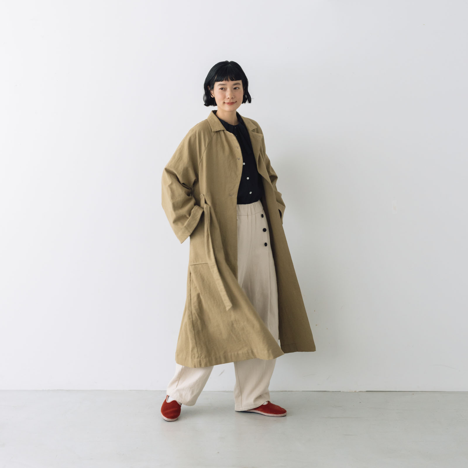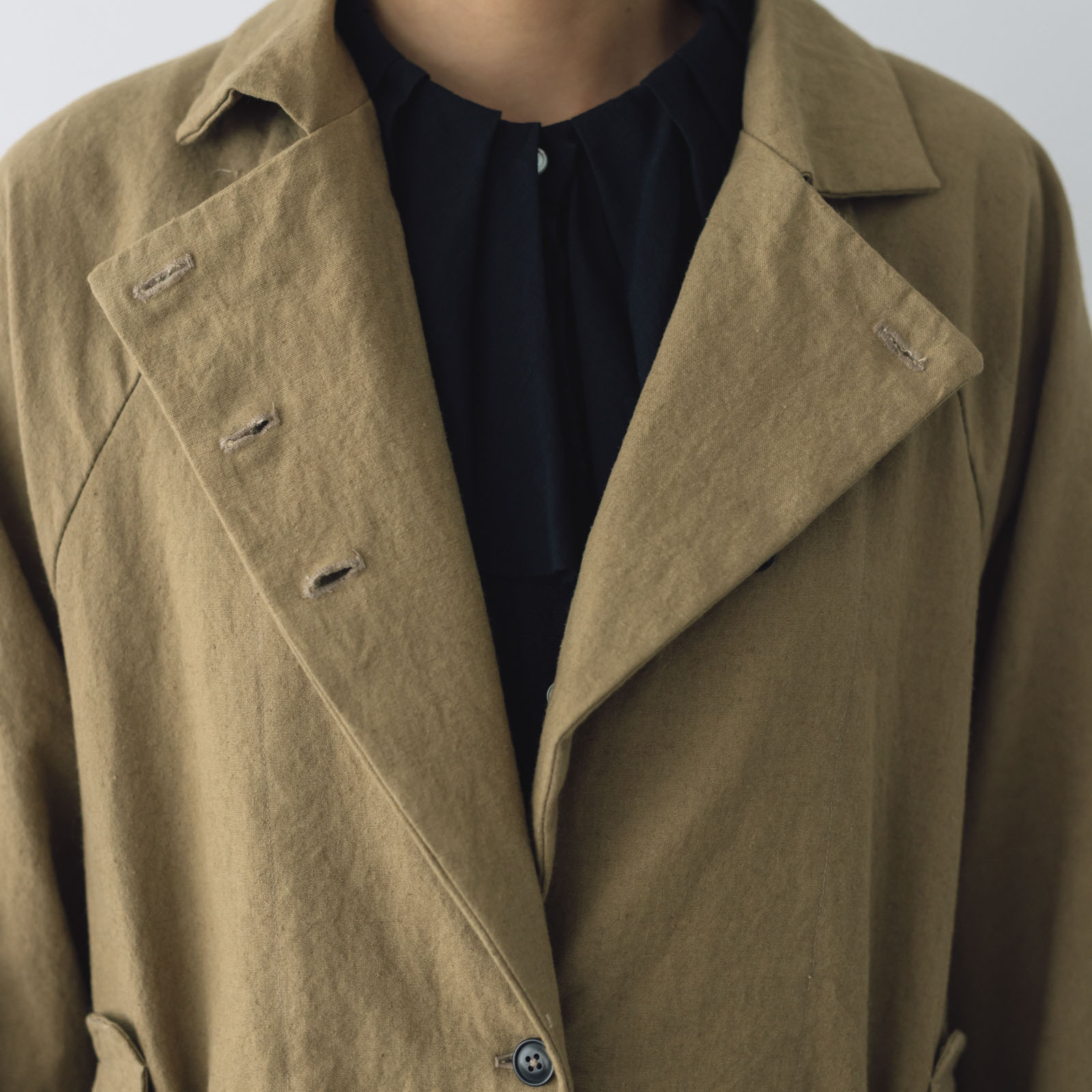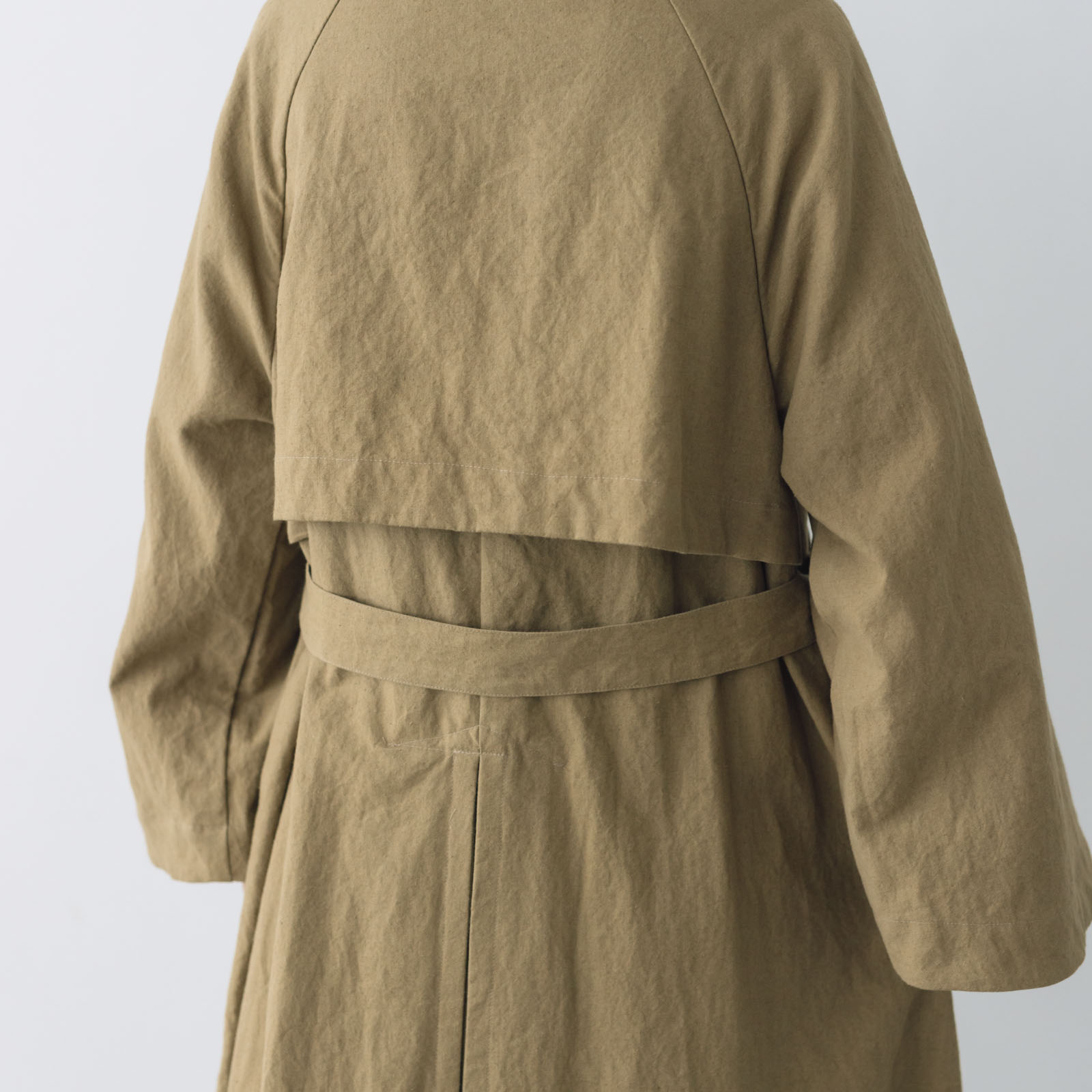 素材には、洗い加工を施したコットンリネンを使用。程よい厚みと程よいシワ感が風合い豊かに仕上がっています。腕の動かしやすさとトレンチコートのトラッドさを表現したラグランスリーブの袖は、袖口にしたがってやや広がりを見せるのでクラシカル。