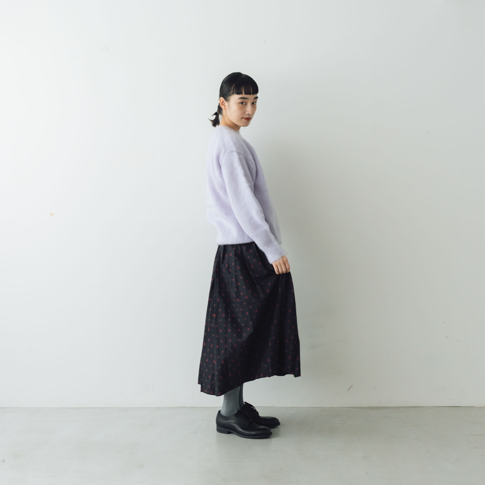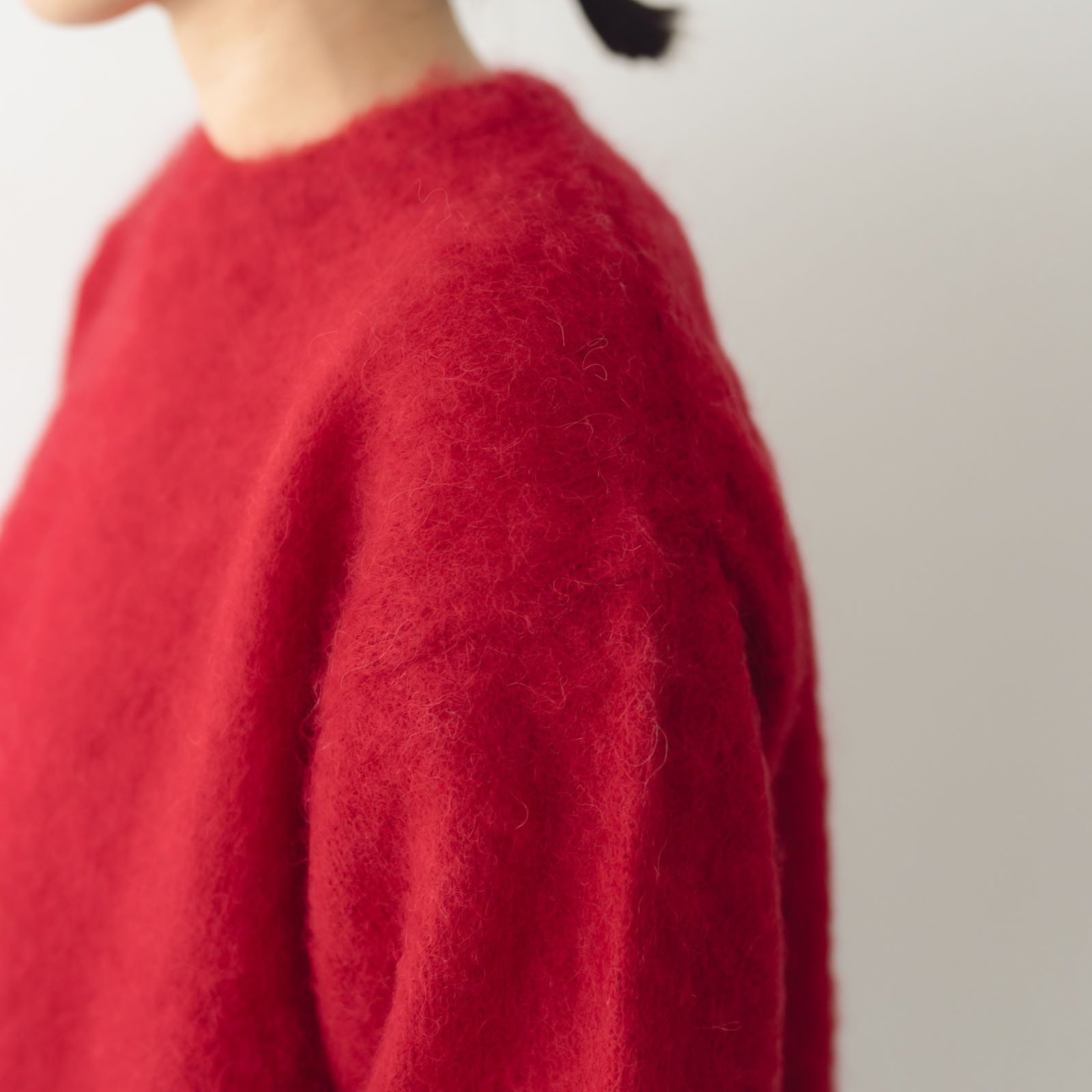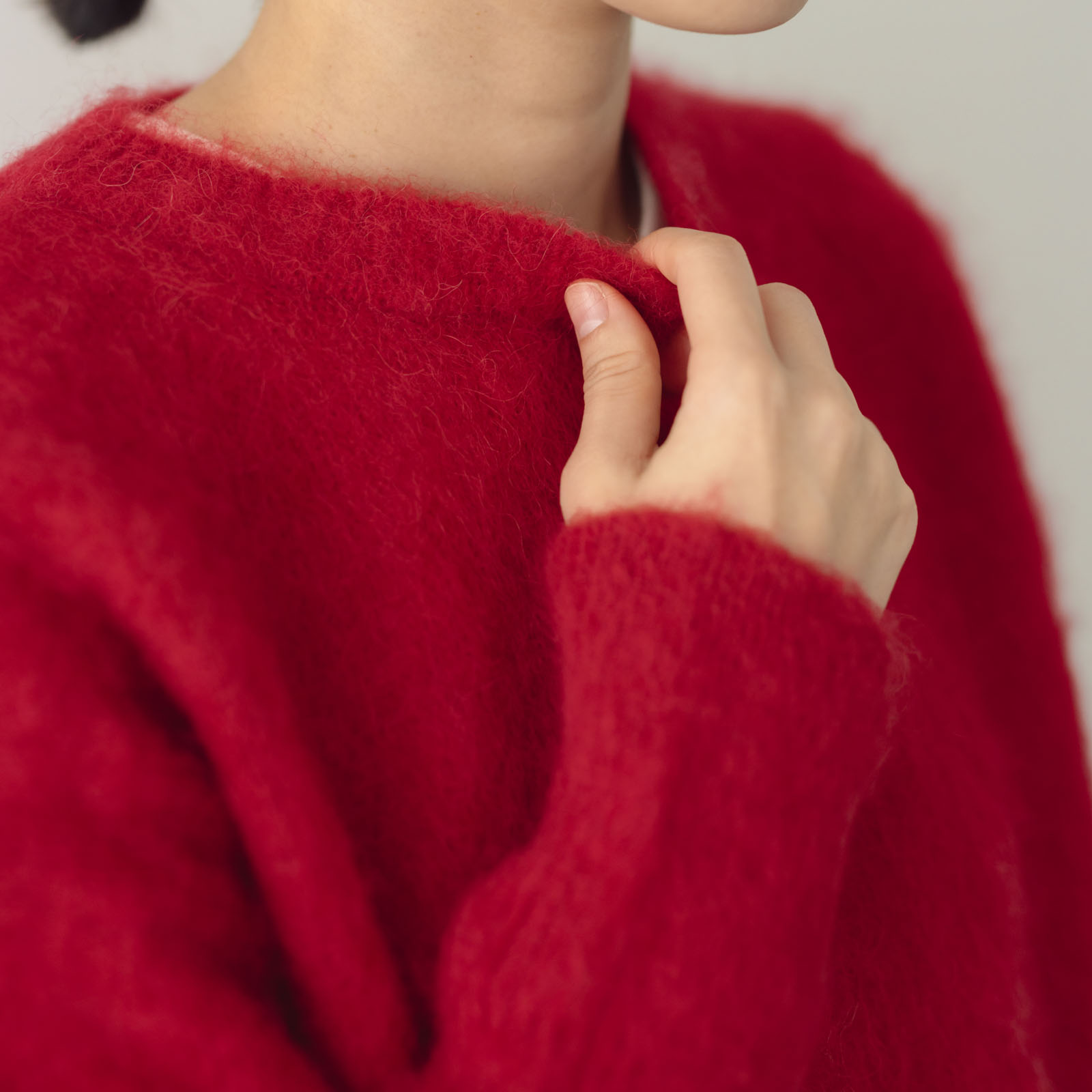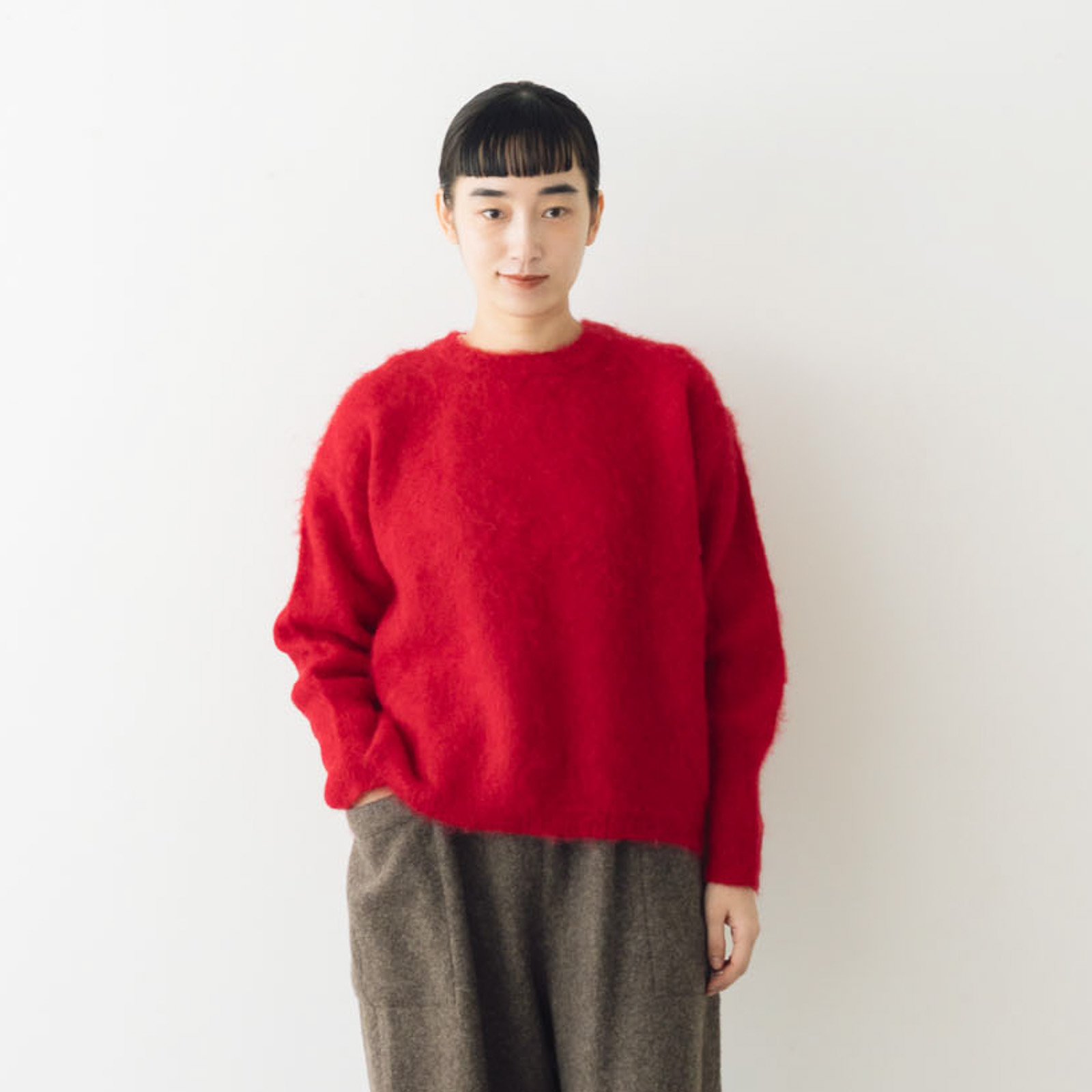 通常のモヘアニットは化繊が混紡されていることが多いけれど、こちらのニットはモヘア、ウール、アルパカと天然素材だけで編み立てられているのが特徴。化繊が苦手な方にも安心してご着用いただけます。