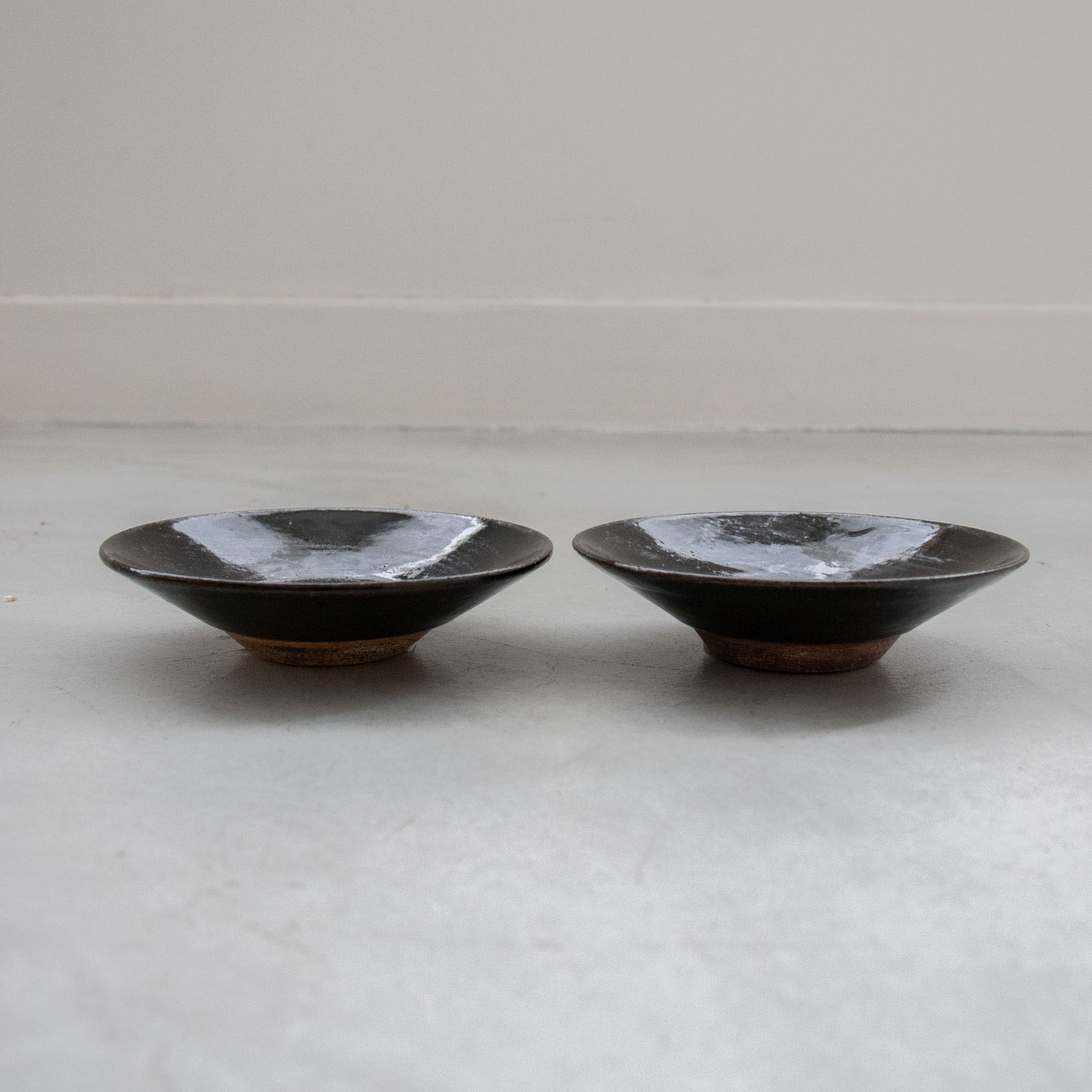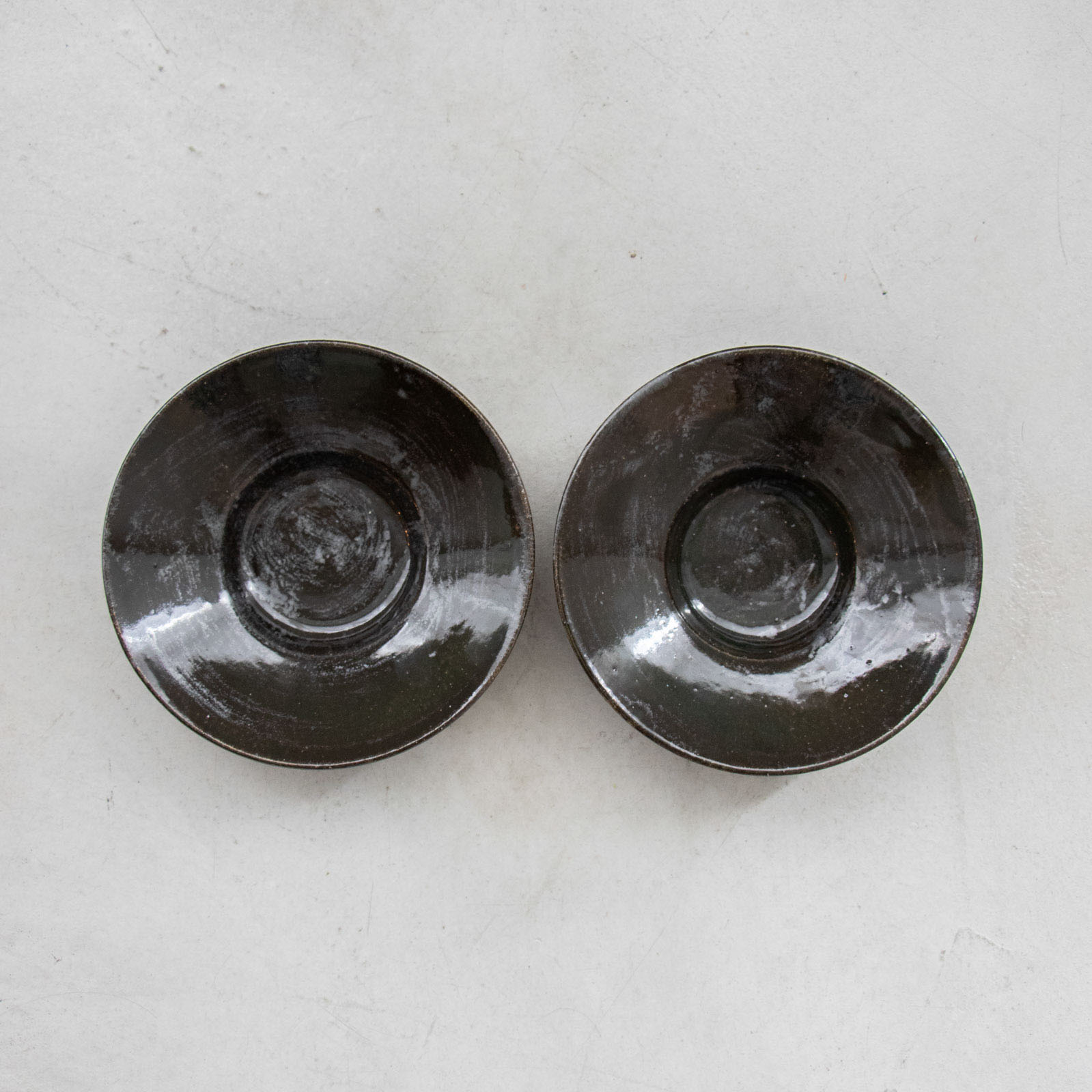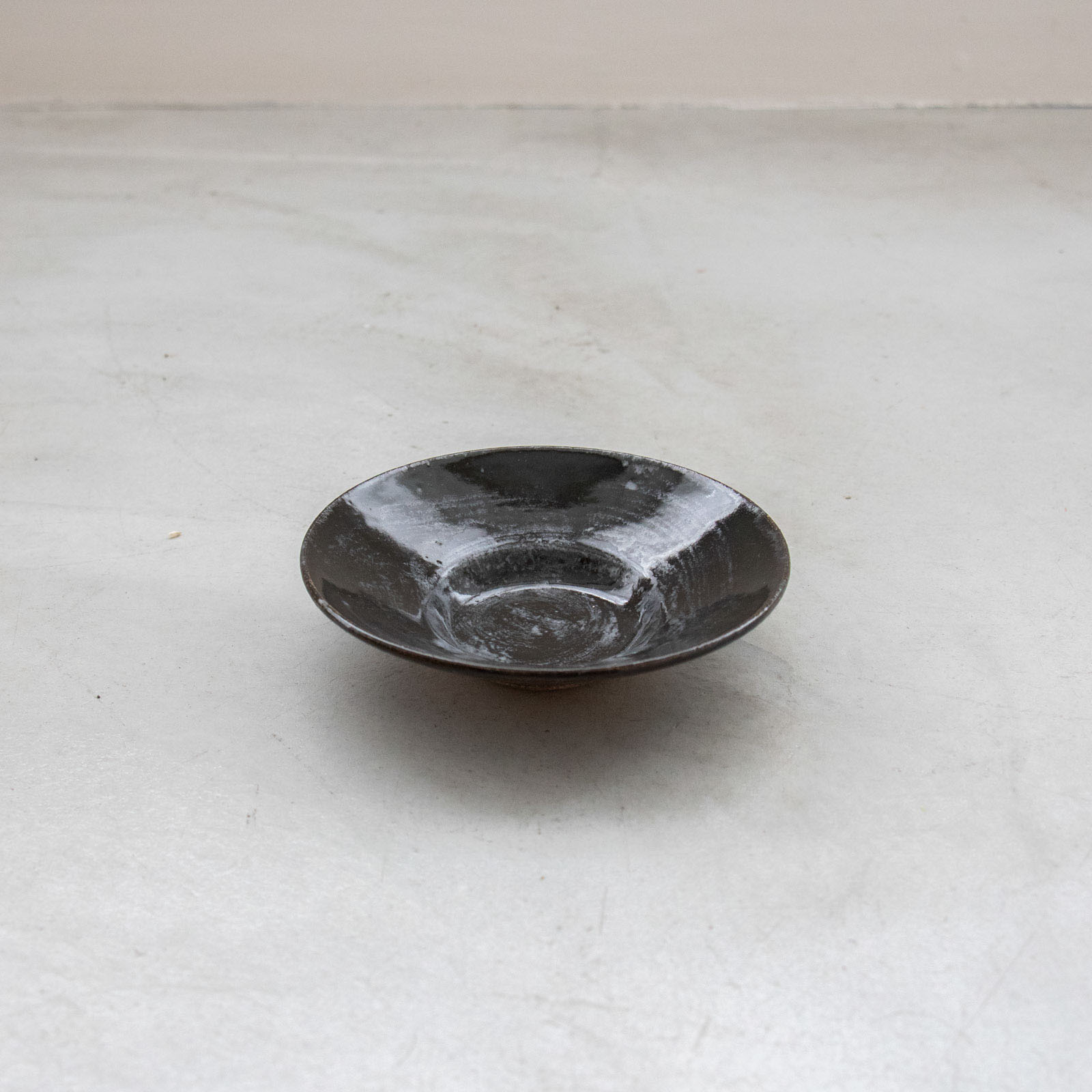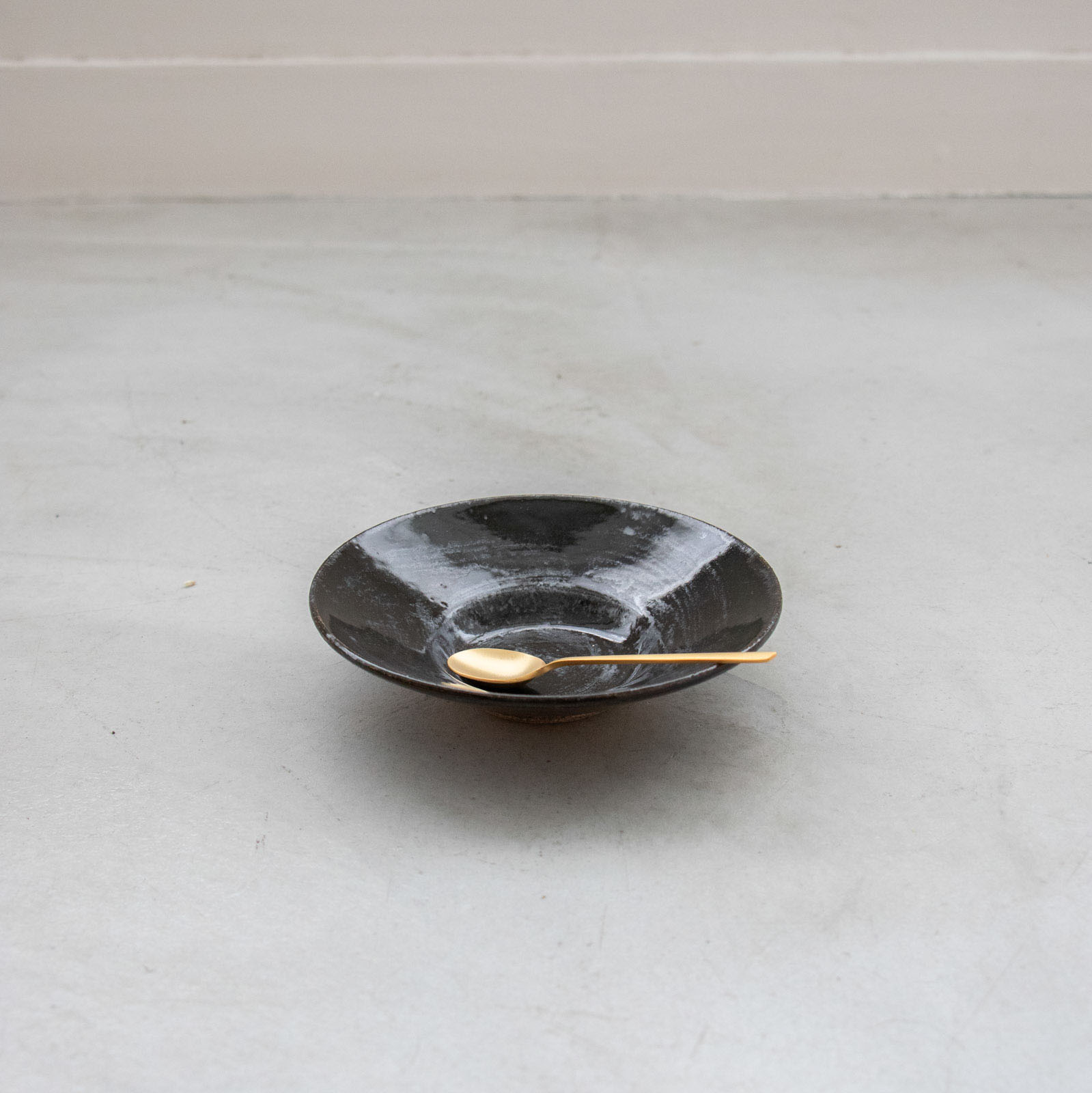 黒ガラス釉の器について、黒ガラス釉薬の下はマンガンを下塗りしているのでうっすら刷毛模様が覗き見えます。作品の風合いとしてお楽しみください。また、ガラス釉は柔らかいため表面に傷が入りやすく、特に黒などの濃い色は傷が目立ちやすいため、小さな傷などのあるものも良品の範囲となります。ご理解の上お買い求めください。金属カトラリーやたわしなどで傷が増えることもあるのでご注意ください。