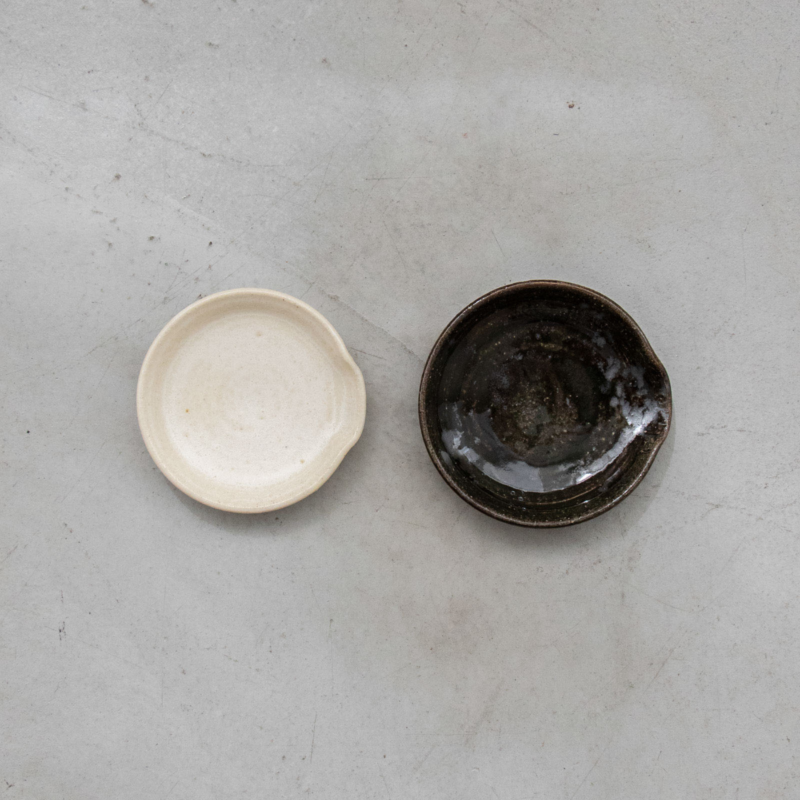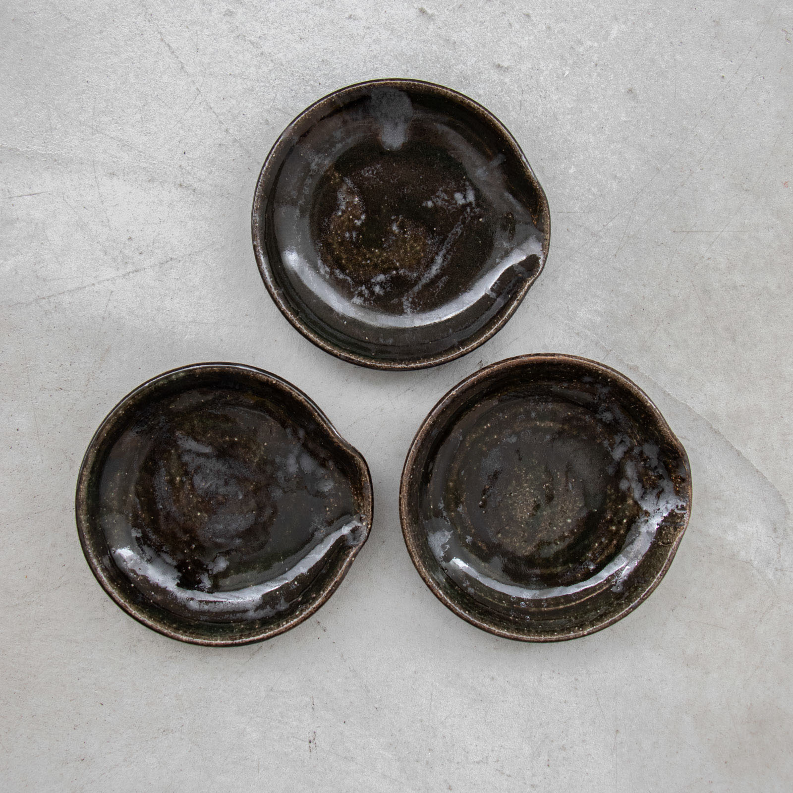 黒ガラス釉の器について、黒ガラス釉薬の下はマンガンを下塗りしているのでうっすら刷毛模様が覗き見えます。作品の風合いとしてお楽しみください。また、ガラス釉は柔らかいため表面に傷が入りやすく、特に黒などの濃い色は傷が目立ちやすいため、小さな傷などのあるものも良品の範囲となります。ご理解の上お買い求めください。金属カトラリーやたわしなどで傷が増えることもあるのでご注意ください。