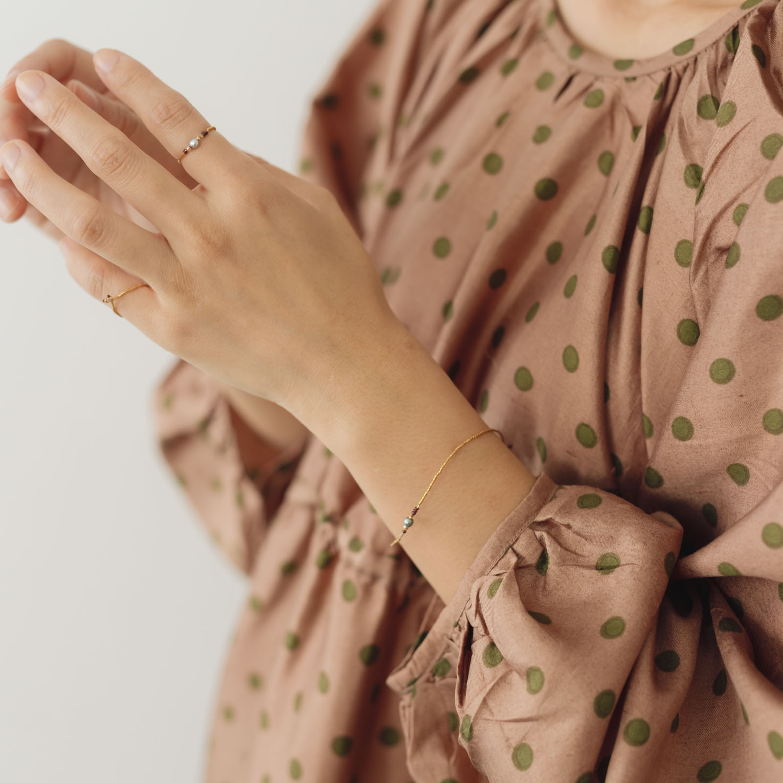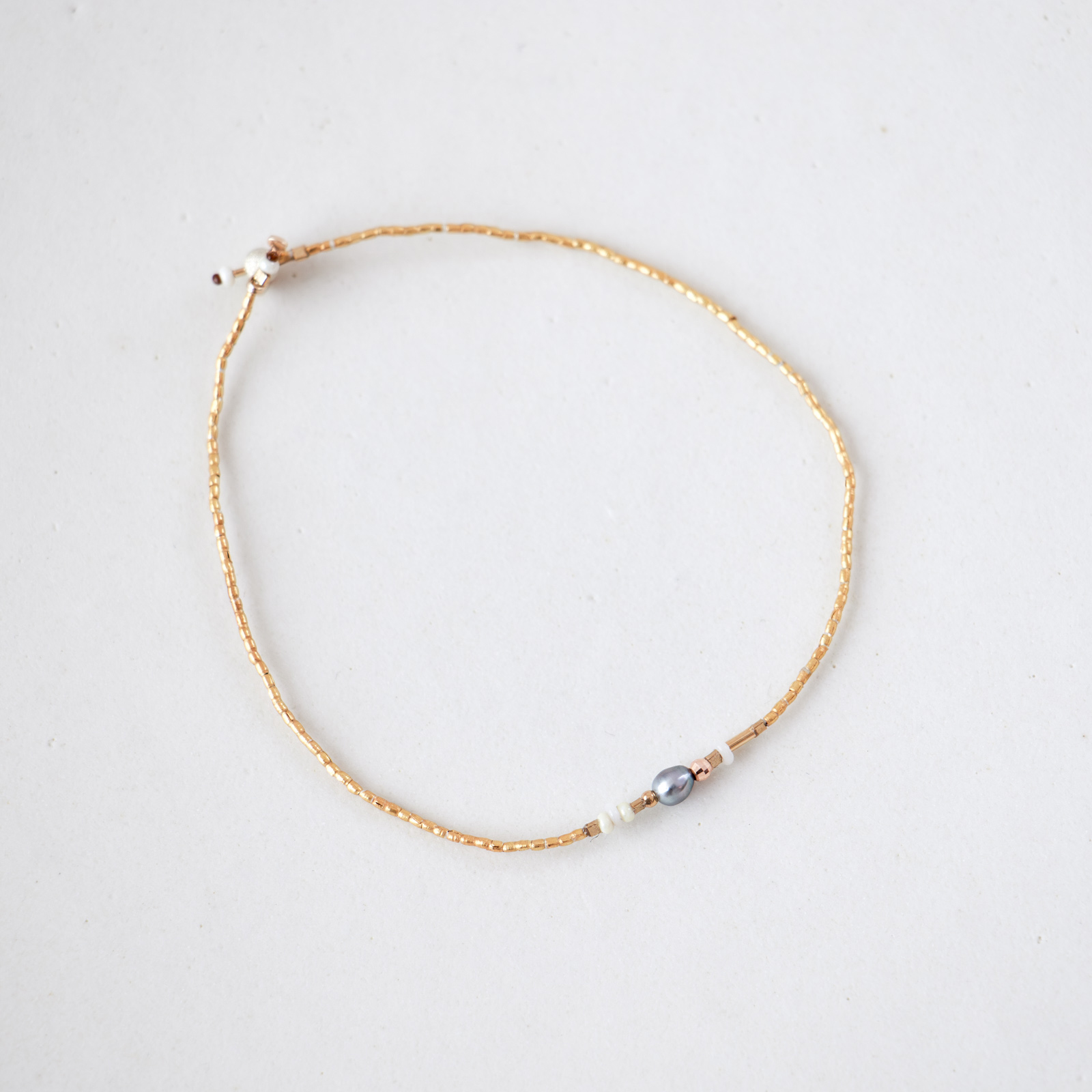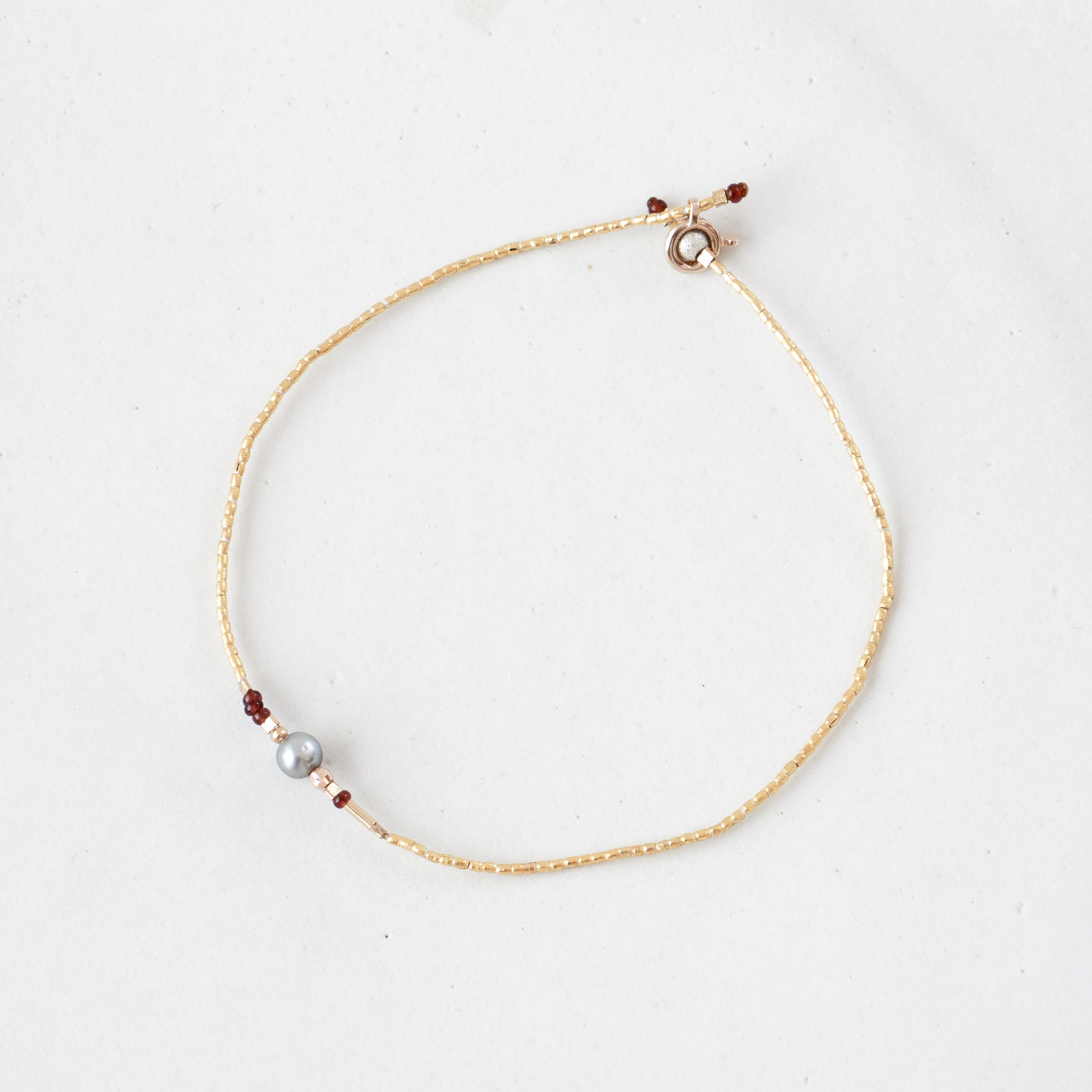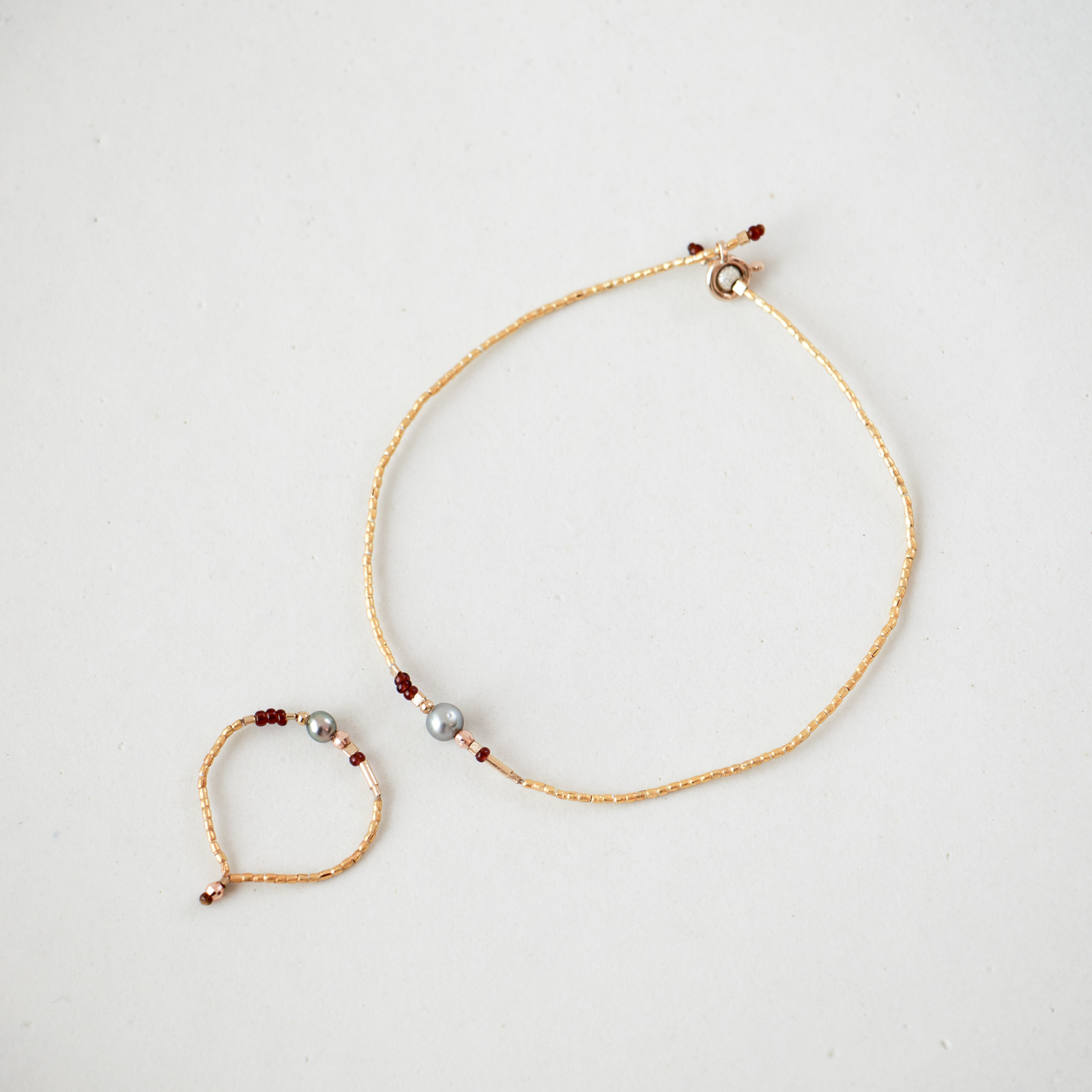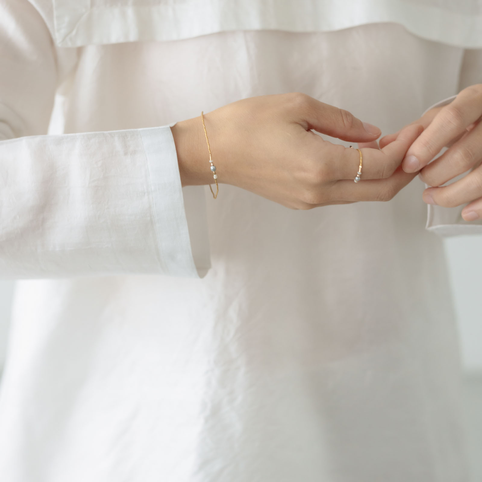 立田暁子さんにくらすことオリジナルデザインで作っていただいた、小粒で美しいタヒチパールを中心に、貴金属とシルバーで紡いだブレスレット。