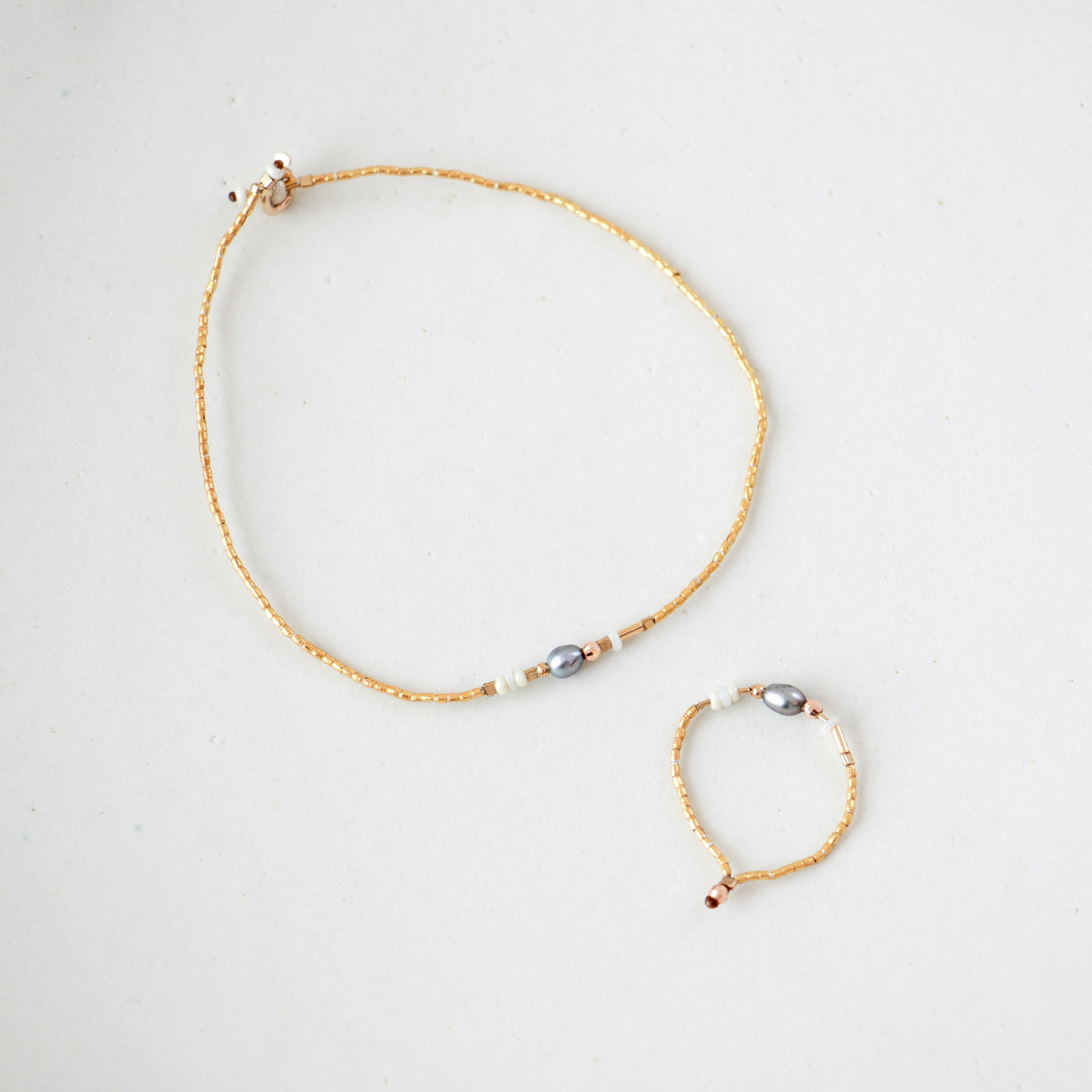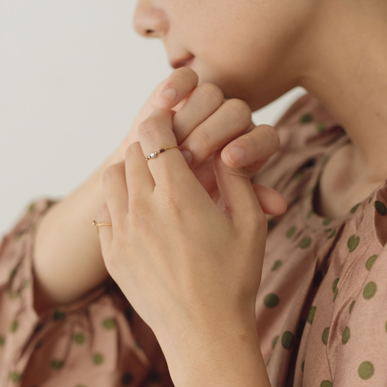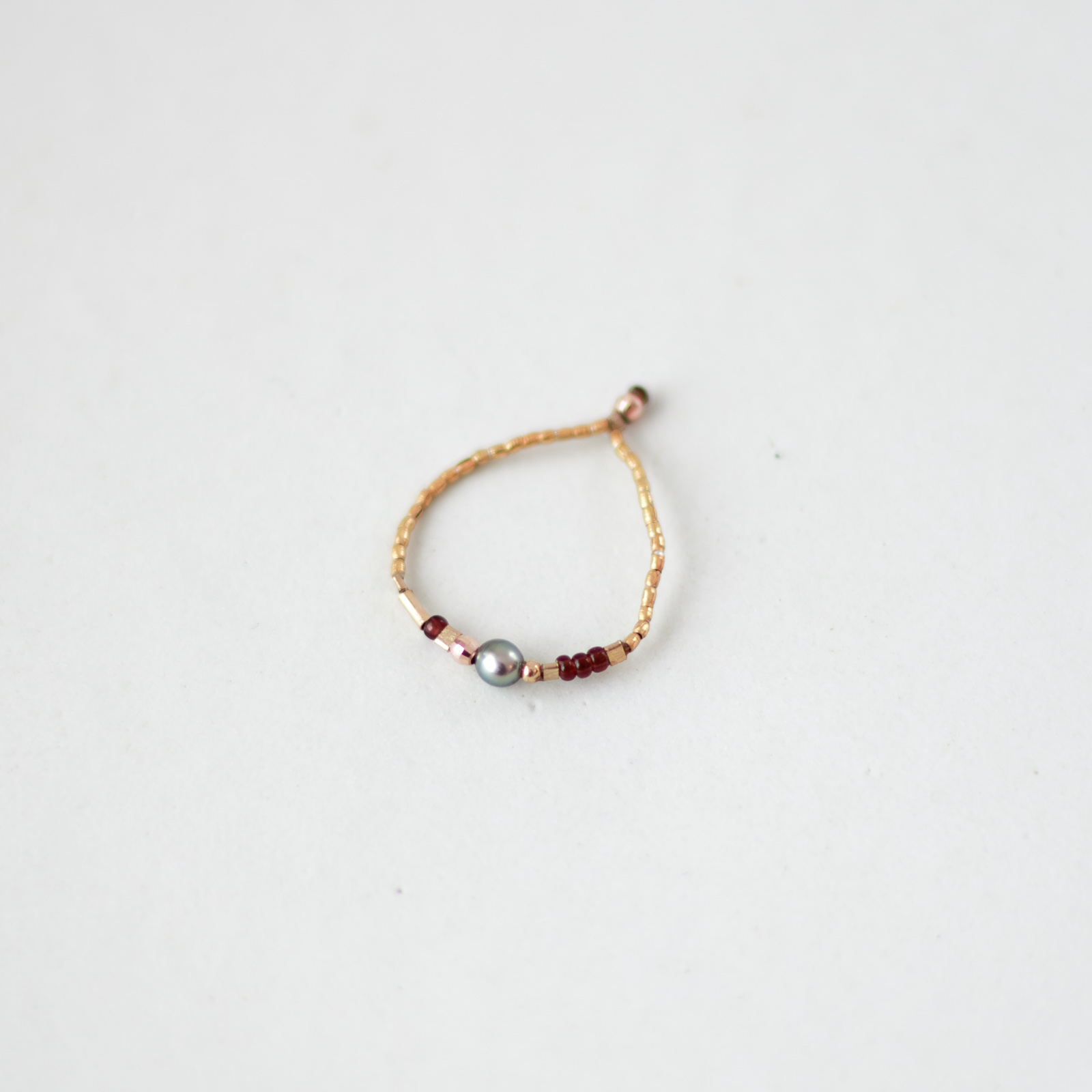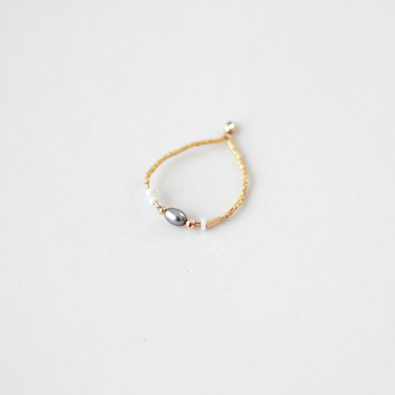 立田暁子さんにくらすことオリジナルデザインで作っていただいた、小粒で美しいタヒチパールを中心に、貴金属とシルバーで紡いだリング。