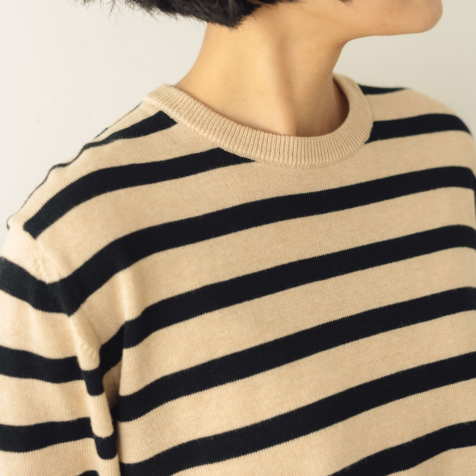カットソーだとカジュアルにな印象のボーダーも、ニット仕立てになることで上品に着こなせる1枚に。