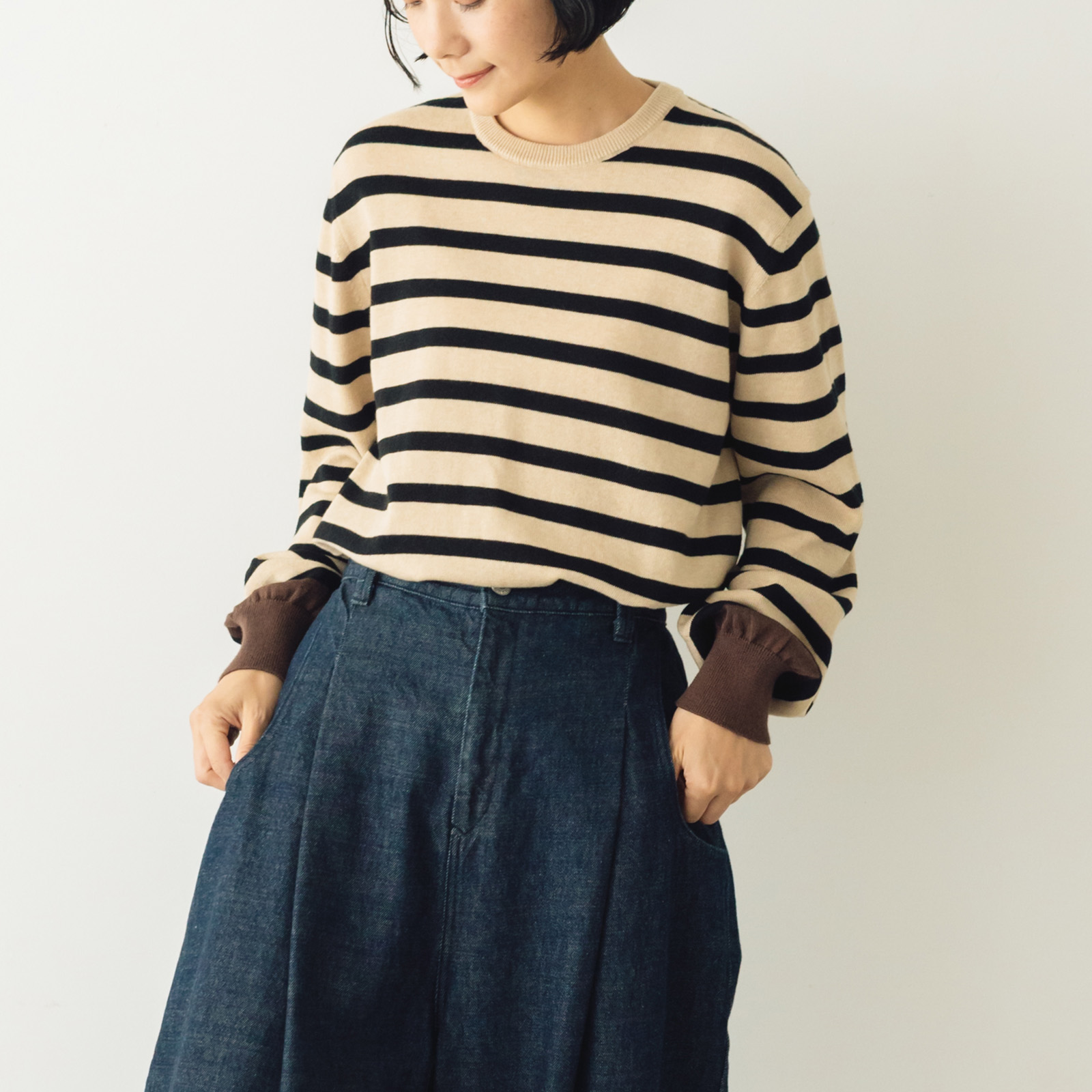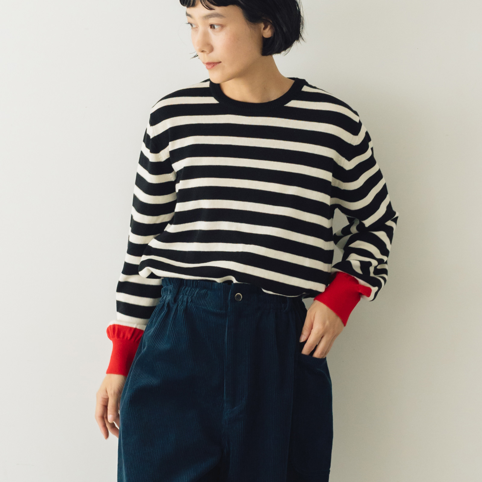 袖口のバイカラーがアクセント。品良く着られるボーダーニット