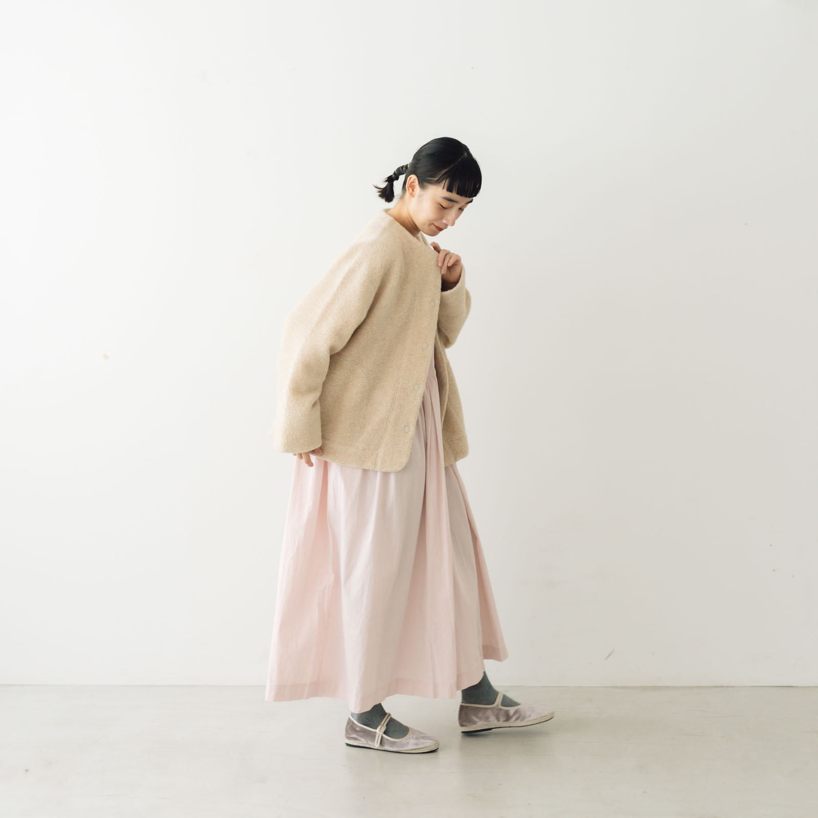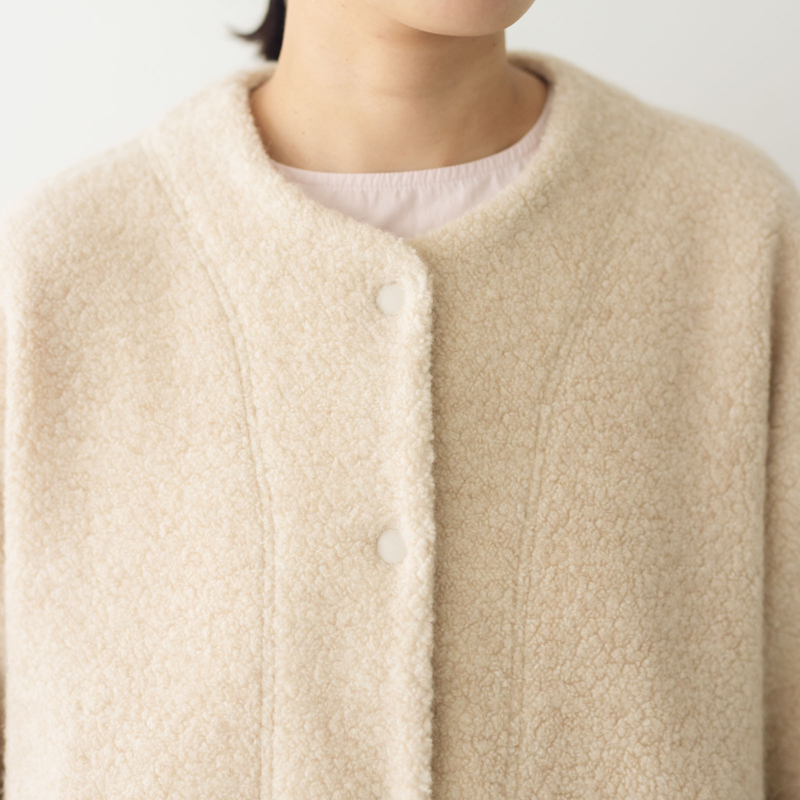 アームホールやボディにゆとりを持たせているので、中にインナーやニットを着込んでも動きやすく窮屈さを感じません。フロントのスナップボタンで開閉を。生地と同色のボタンで、余計な飾りのないすっきり上品な印象です。