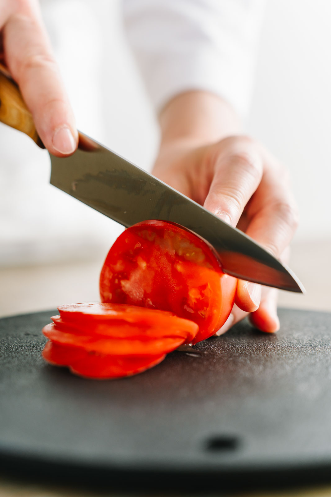 「まっすぐな包丁」の最大の特徴は、和包丁と洋包丁のいいとこどりをした独自の刃付け。家庭で扱いやすい洋包丁の「両刃」をベースにしながら、和包丁の「片刃」の形状を取り入れた、オリジナルの刃付けになっています。鋭さが際立つ絶妙な刃の形状に仕上げることで、お刺身やトマトなどの切りにくい素材も気持ちよくカットできます。