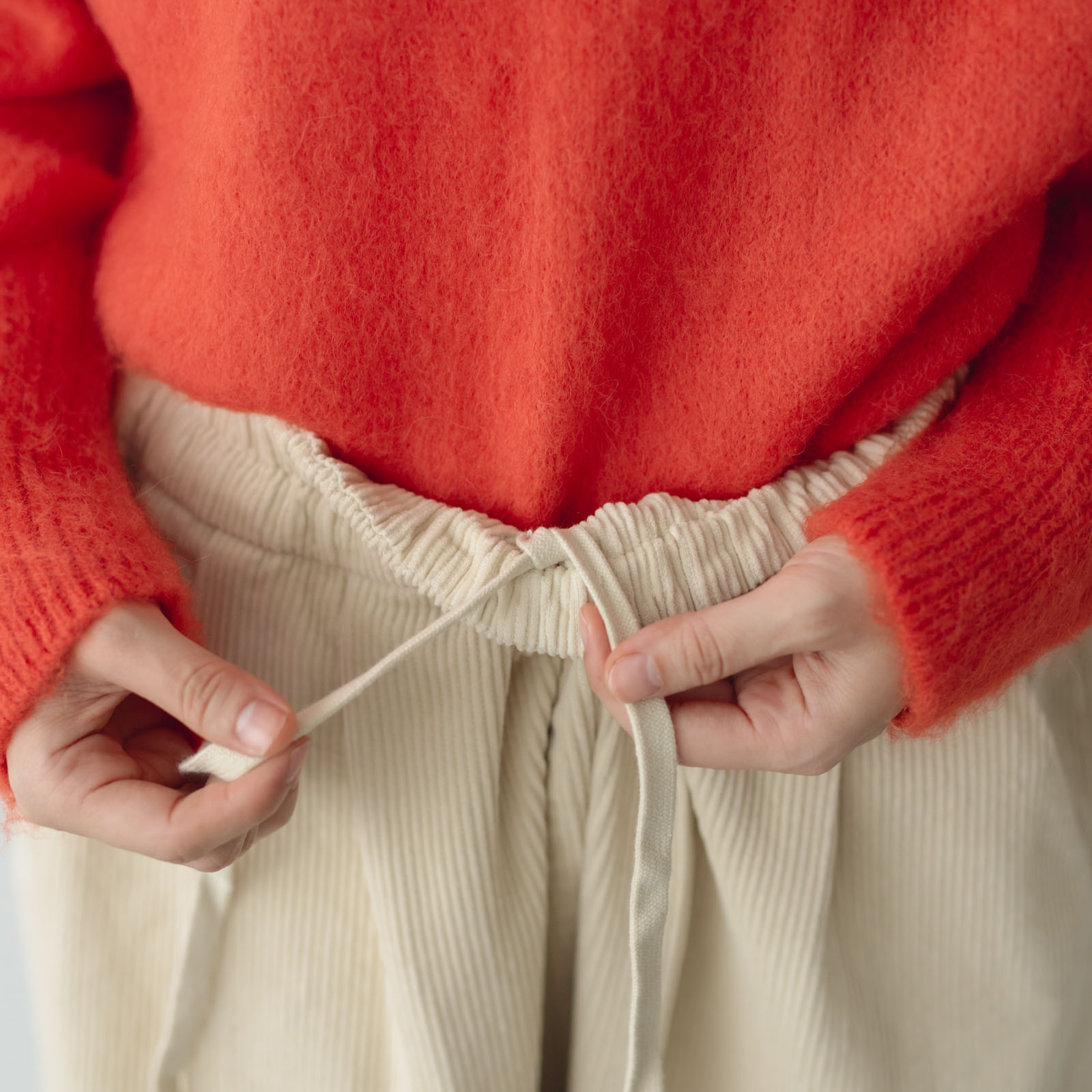 「くらすこと定番の“くらすことの日常生活着オーガニックパンツ”に冬っぽい素材があったらいいな。」「腰回りや足全体を温かく包んでくれるようなパンツが欲しい!」というリクエストから生まれたコーデュロイパンツ。