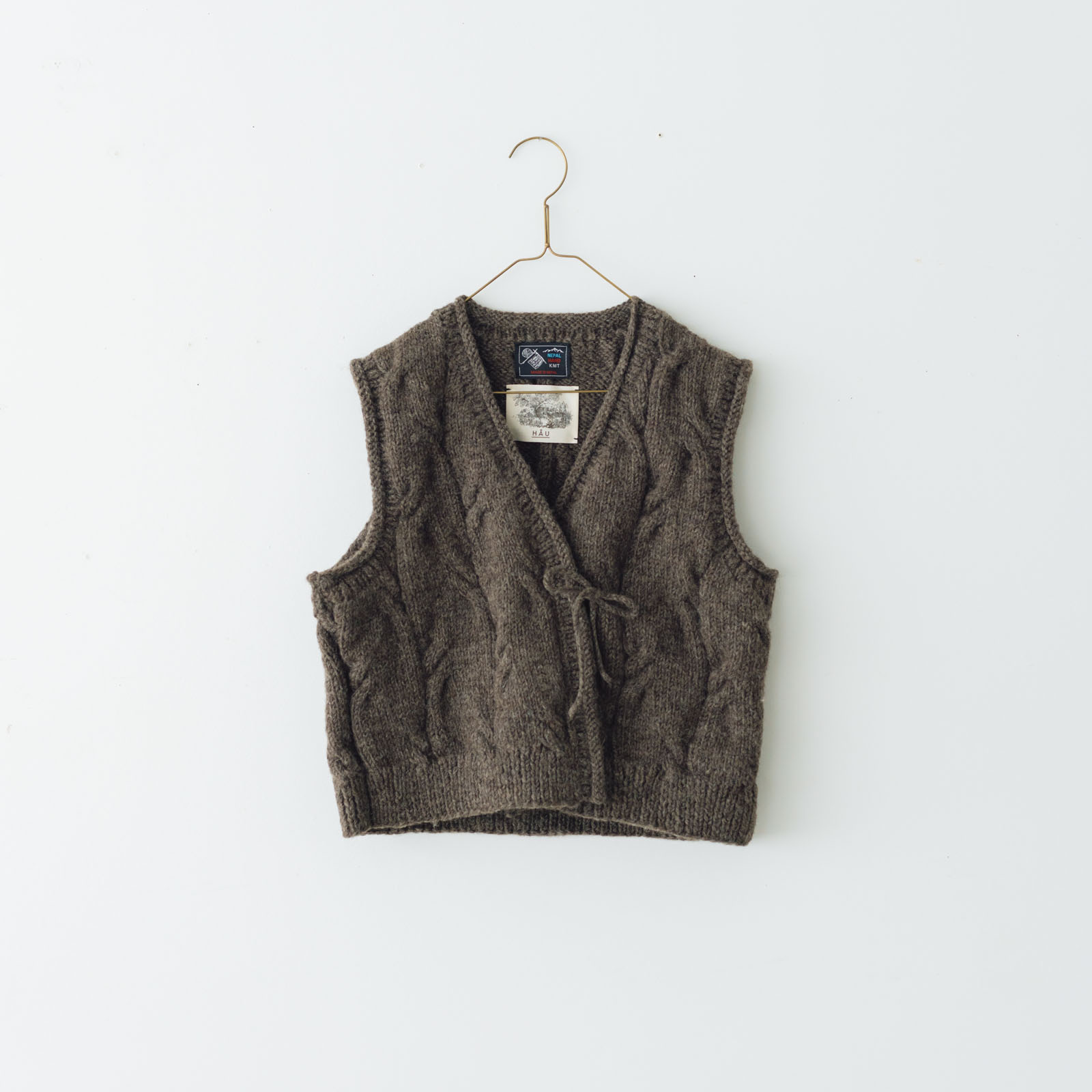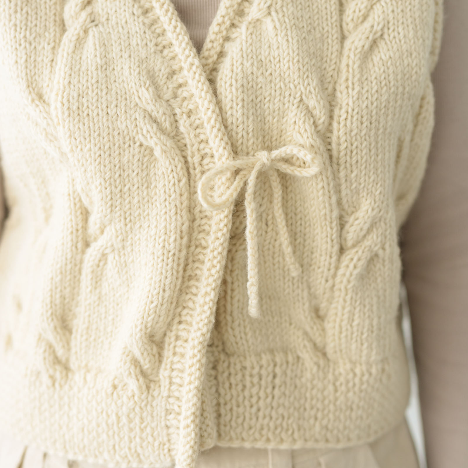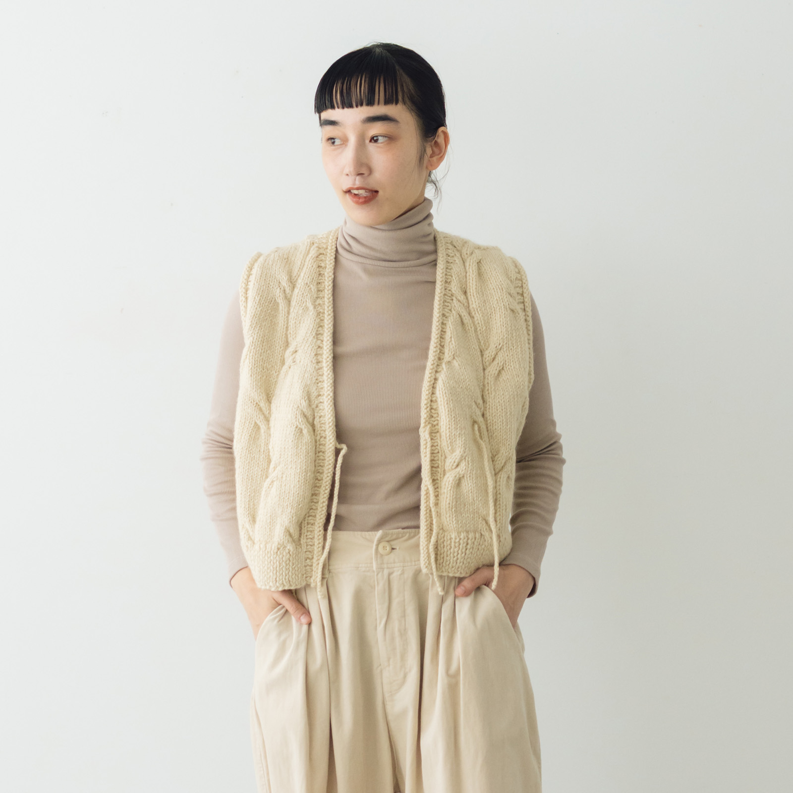 太番手の毛糸をざっくりと編んであり、どこか素朴な雰囲気を感じさせます。フロントはボタンではなく紐で結ぶ仕様で、ハンドメイド感たっぷり。