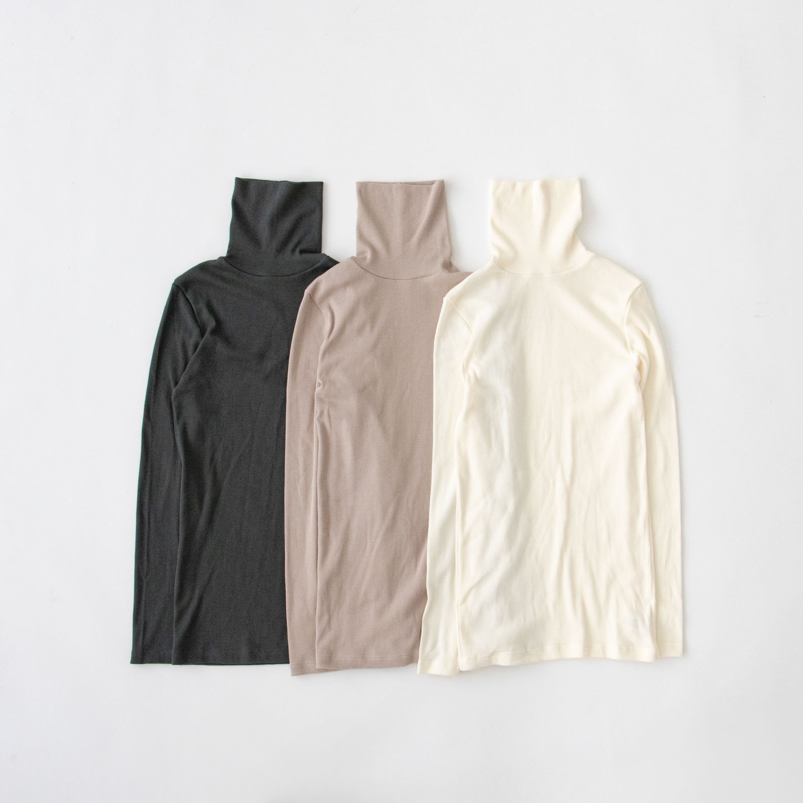同じ素材、同じ色展開でタートルネックタイプもご用意しています。
