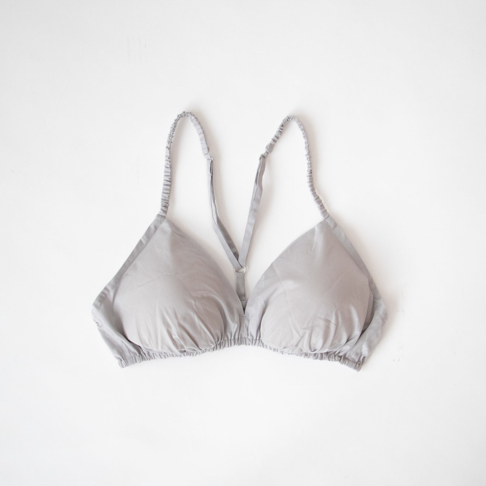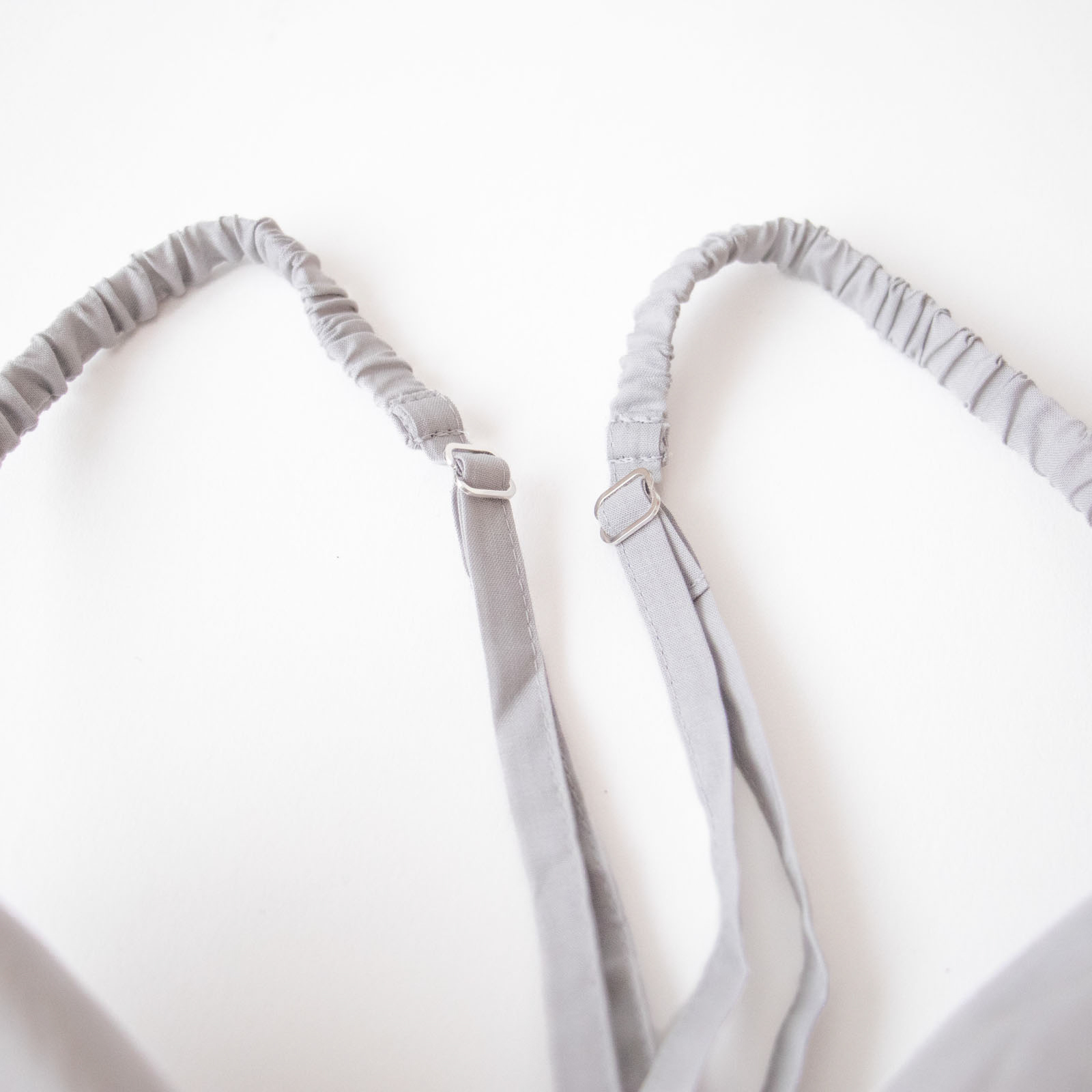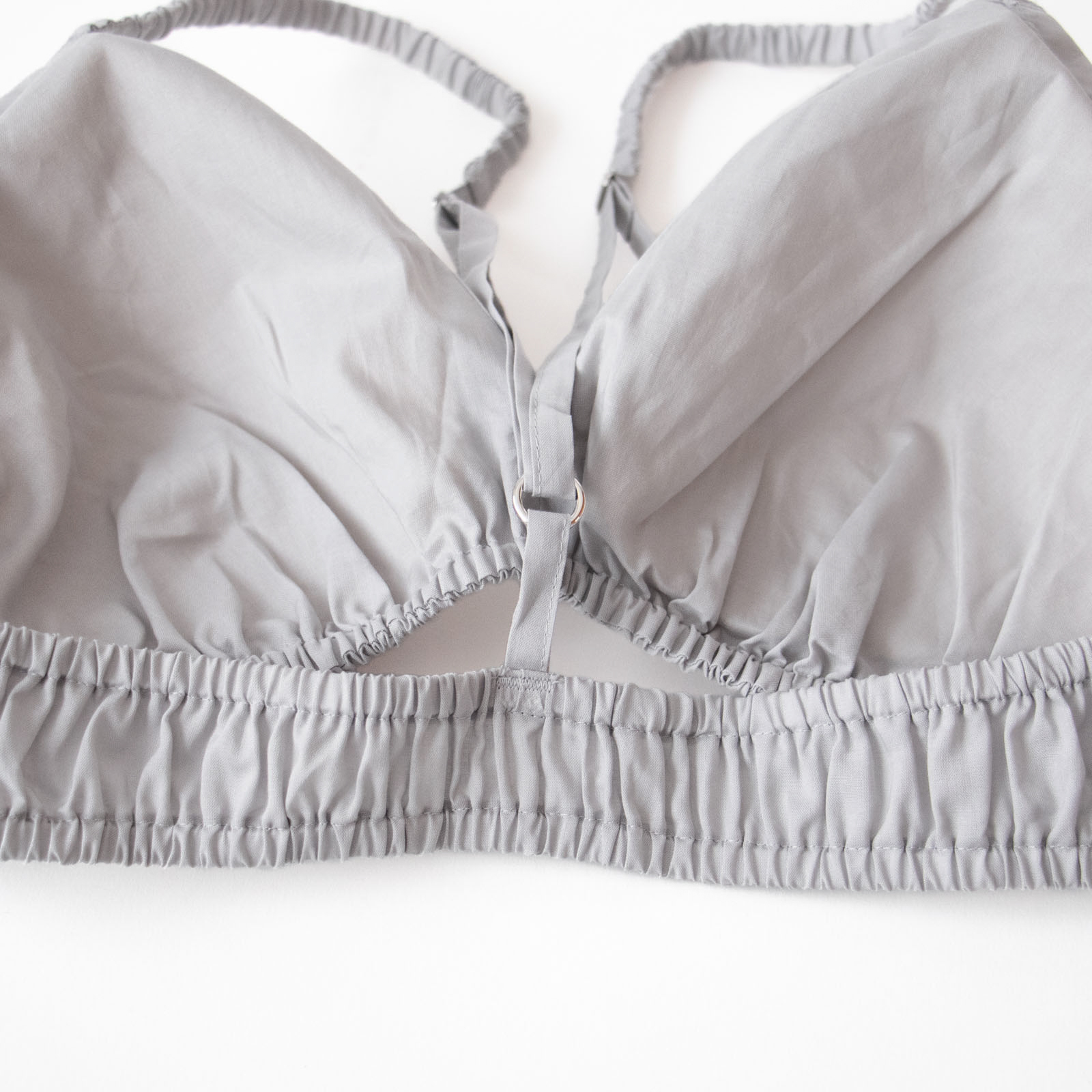軽くて肌触りがさらりとしたコットン布帛素材で仕立てられたTESHIKIのブラ。「DOLPHIN」と名づけられたその色は、のびやかに泳ぐイルカのように、どこかやさしい透明感のあるグレーです。