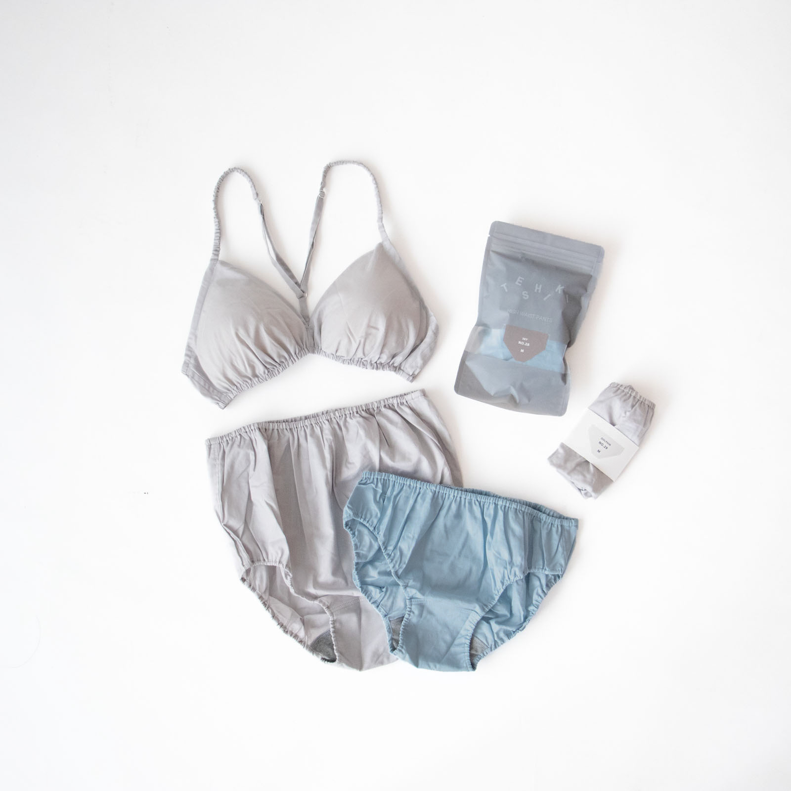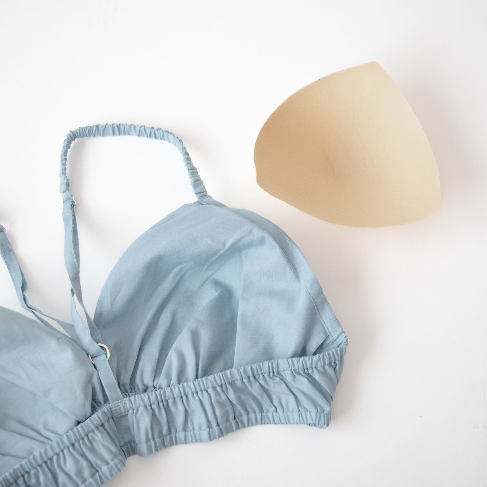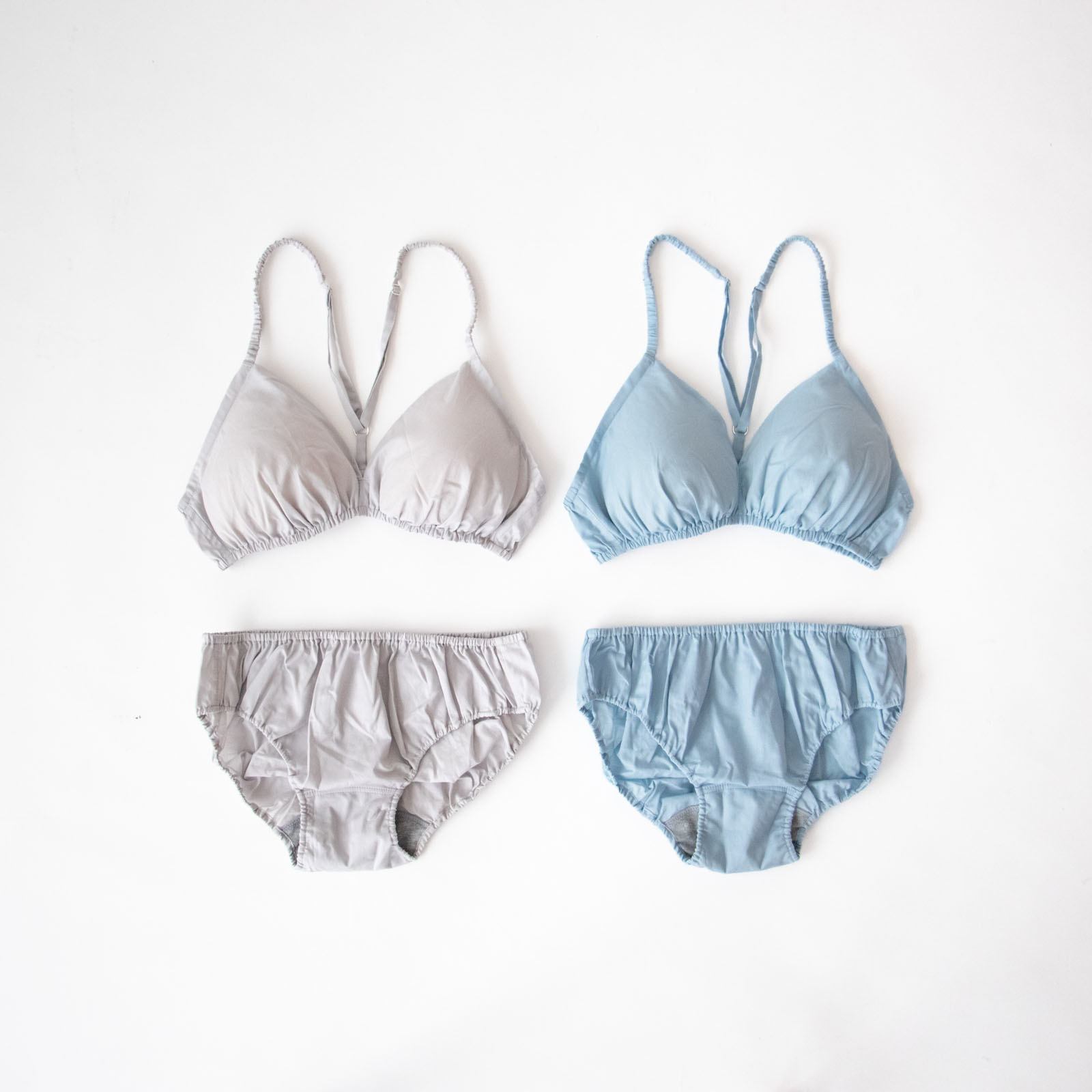 軽くて肌触りがさらりとしたコットン布帛素材で仕立てられたTESHIKIのブラ。「SKY」は、澄んだ空のようなやわらかなスカイブルー。