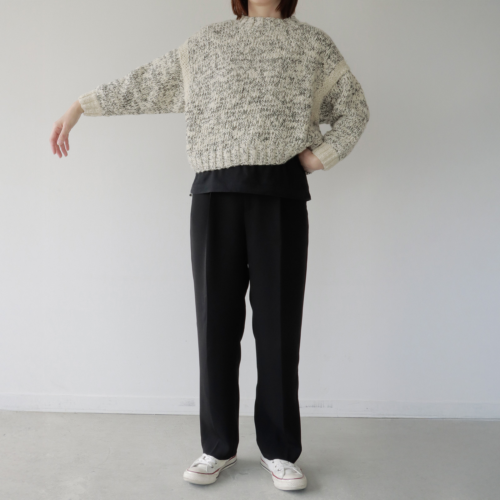 細い繊維を使った柔らかな肌ざわりと、抑揚のある“手紡ぎ糸”ならではのぽこぽことした凹凸のある編み地。白と黒の糸を引き揃えて編んだモノトーンの色合いは、静かな華やかさがあり、合わせるボトムやコートで表情が変わって楽しめます。