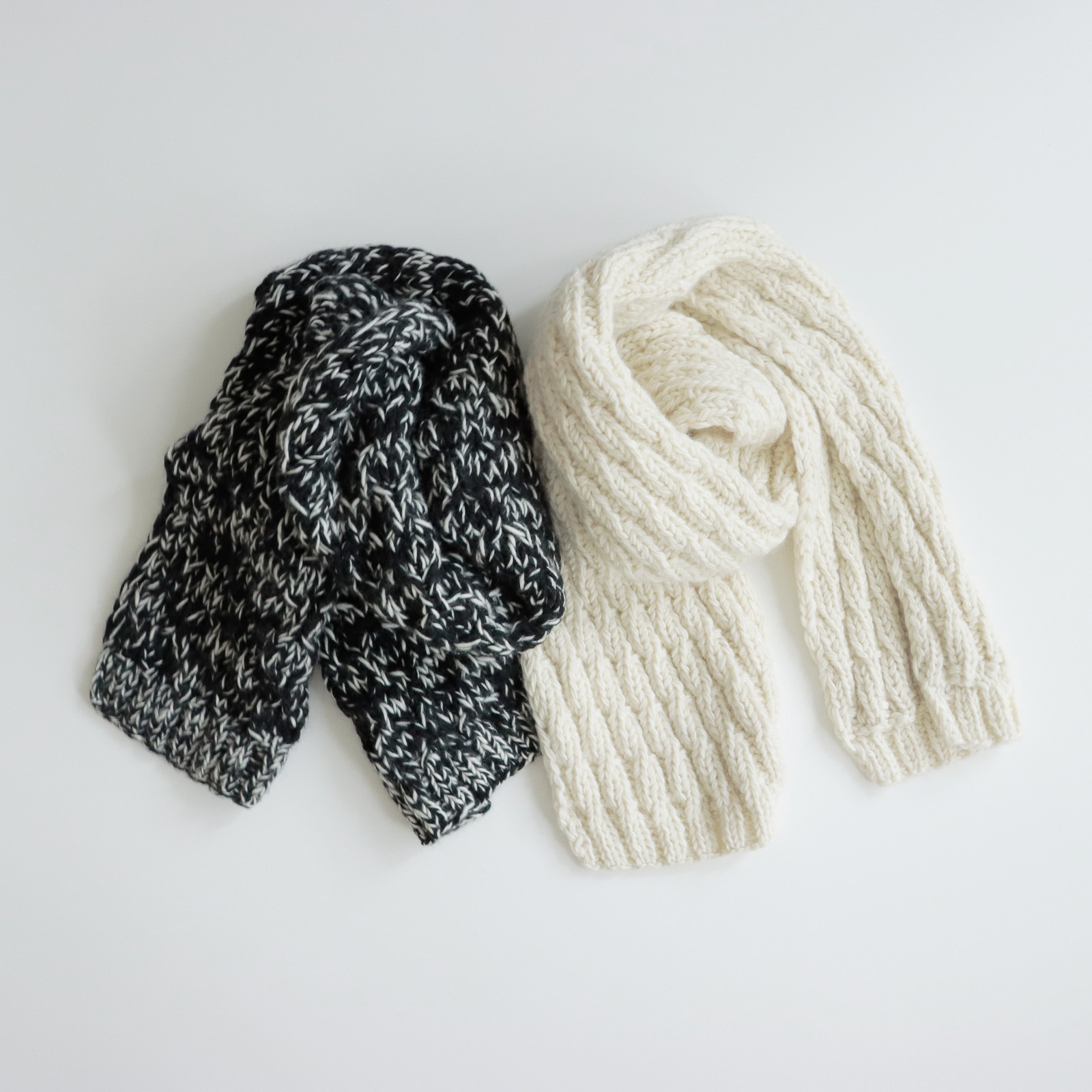 ホワイトは、ダークトーンの抜け感づくりに、ブラック&ホワイトはキリリとコーデを引き締しめたい時にと、どちらも合わせる服を選びません。手しごとの素朴さと、モノトーンの洗練されたデザインが絶妙で、ずっと大切にしたいマフラーです。