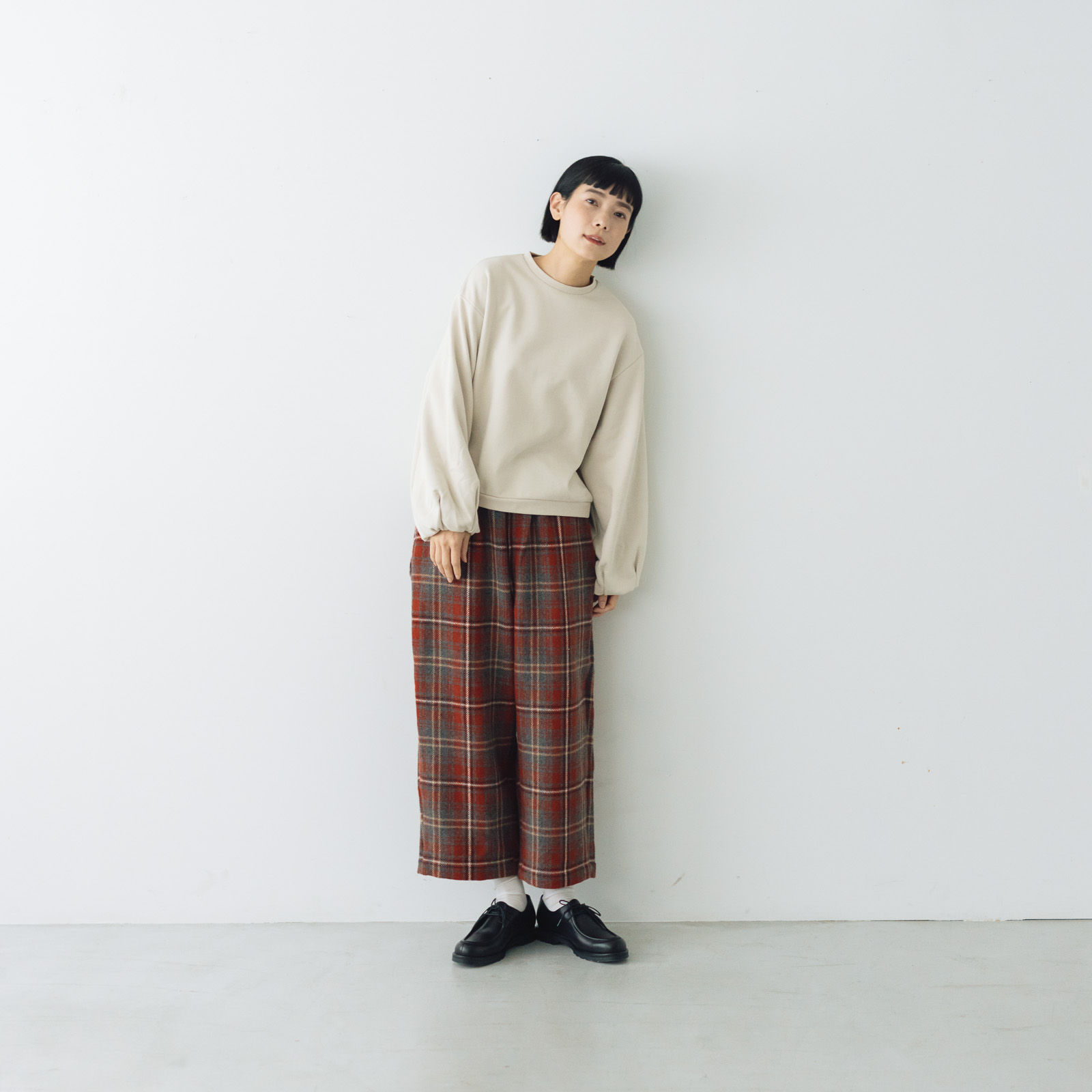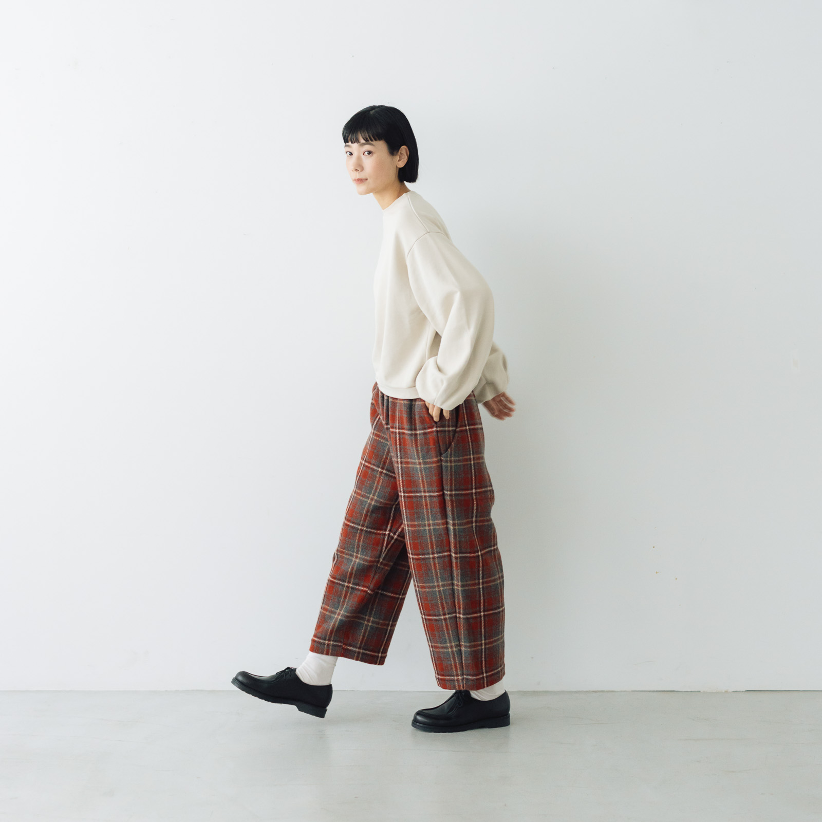 kotonで定番人気のバックワードパンツに、寒い季節にぴったりのウール混素材が登場。膨らみと起毛感のあるチェック柄で、あたたかを感じさせる1本です。