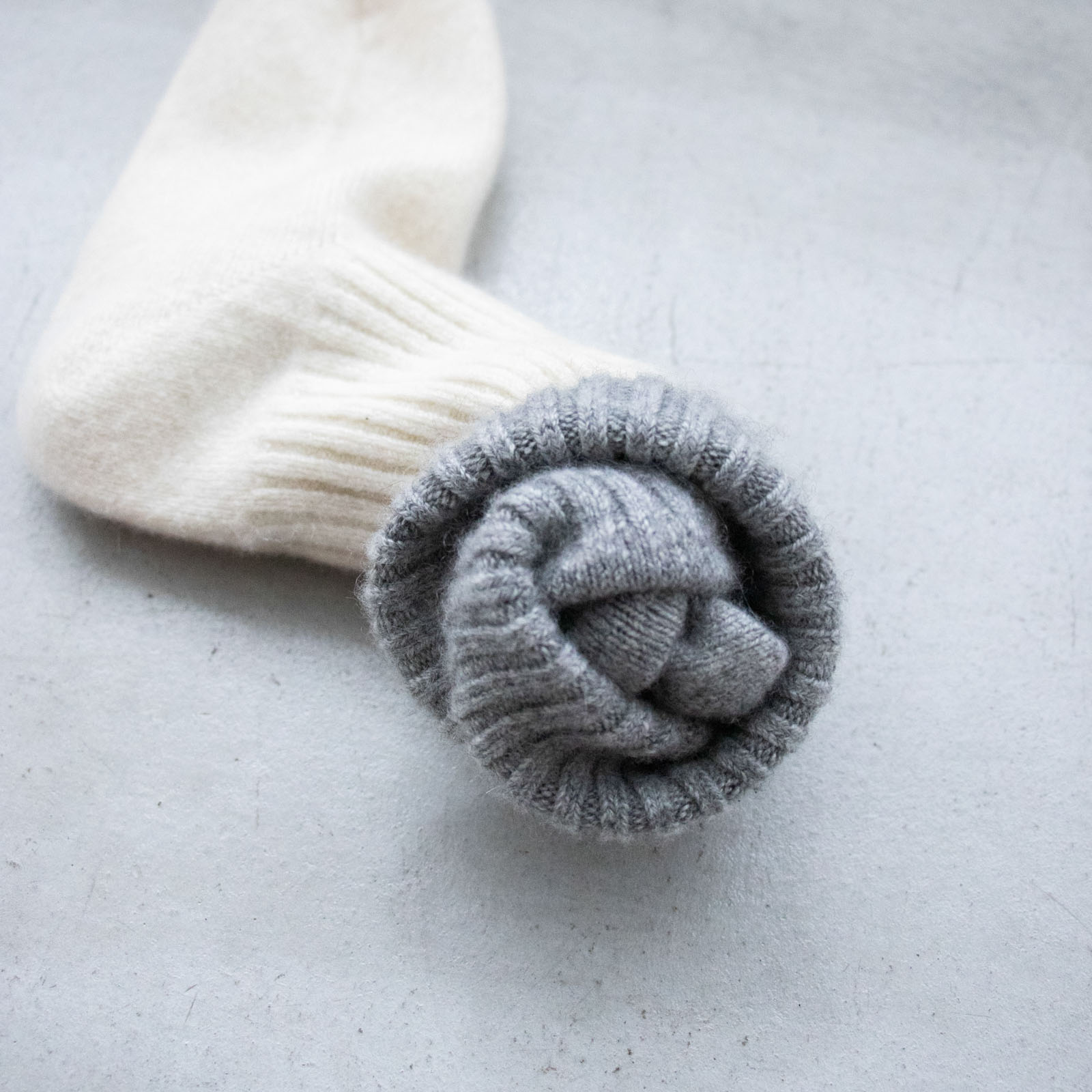 2足分のカシミヤを使って仕立てたふくらみのあるソックスは、オフホワイトとグレーのリバーシブル仕様。どちらの面も履けるので、気分やコーディネートに合わせて楽しめます。