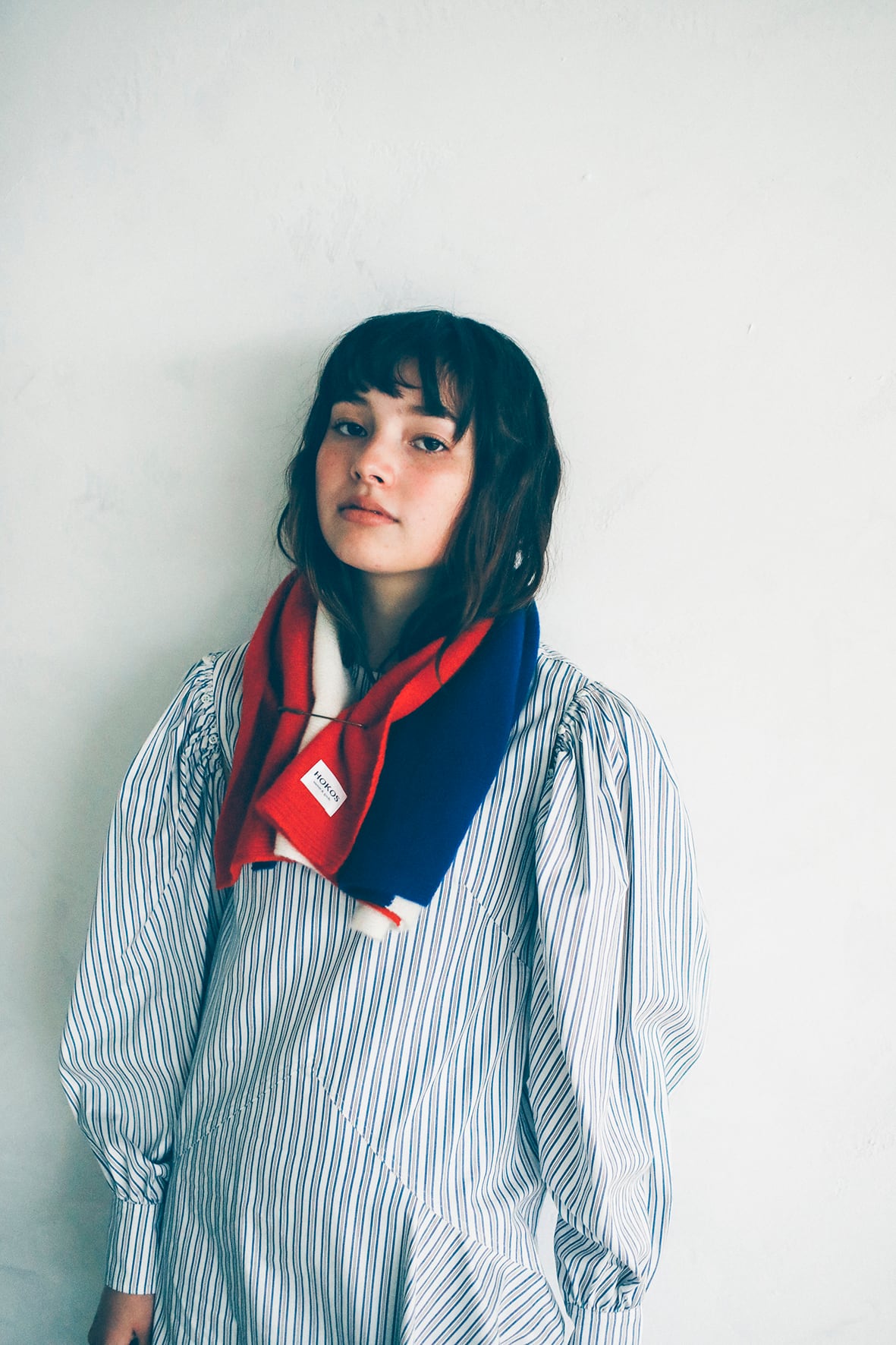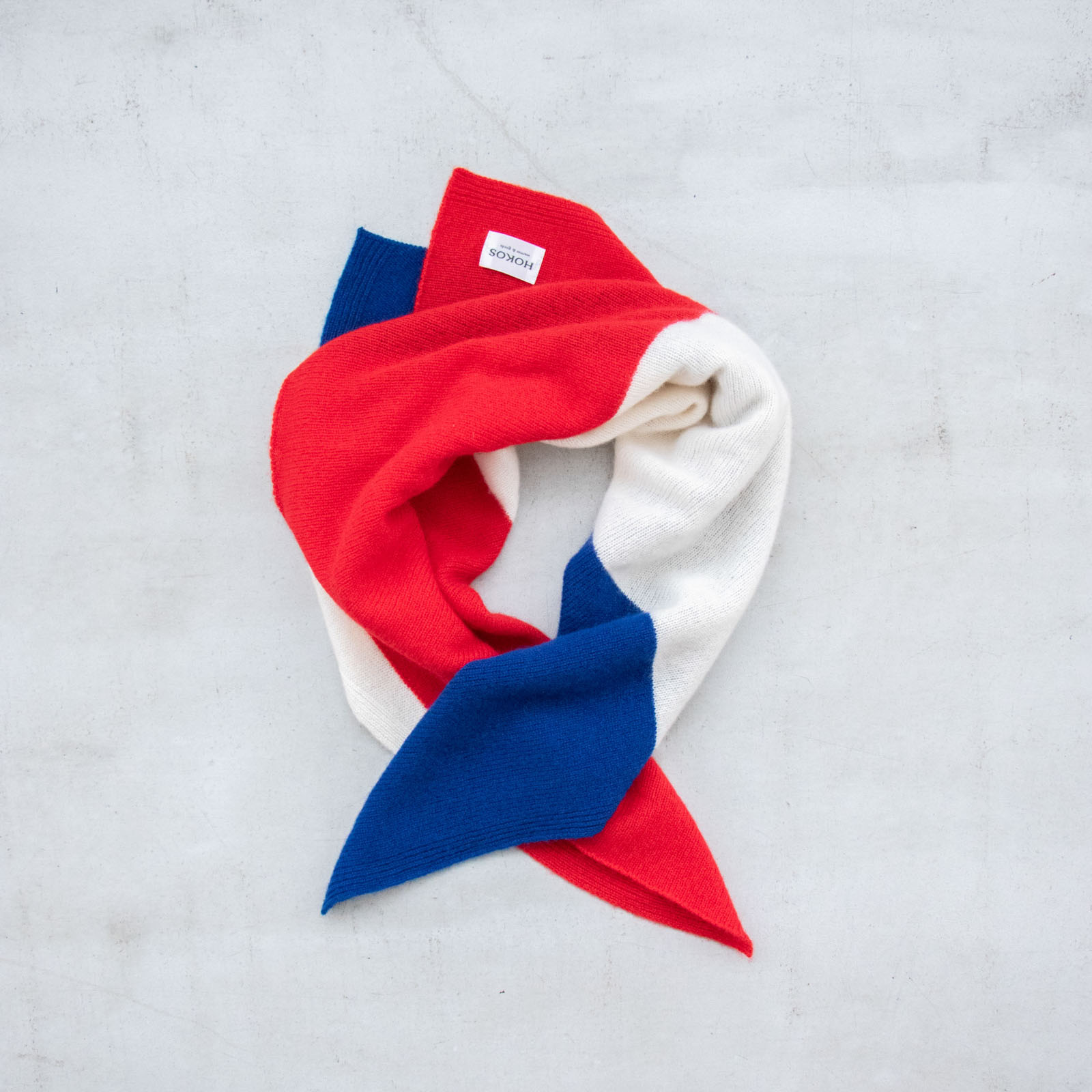 対角線で折って、3色それぞれが見える巻き方。背中側は三角に、タグもアクセントになりキャッチーな印象です。