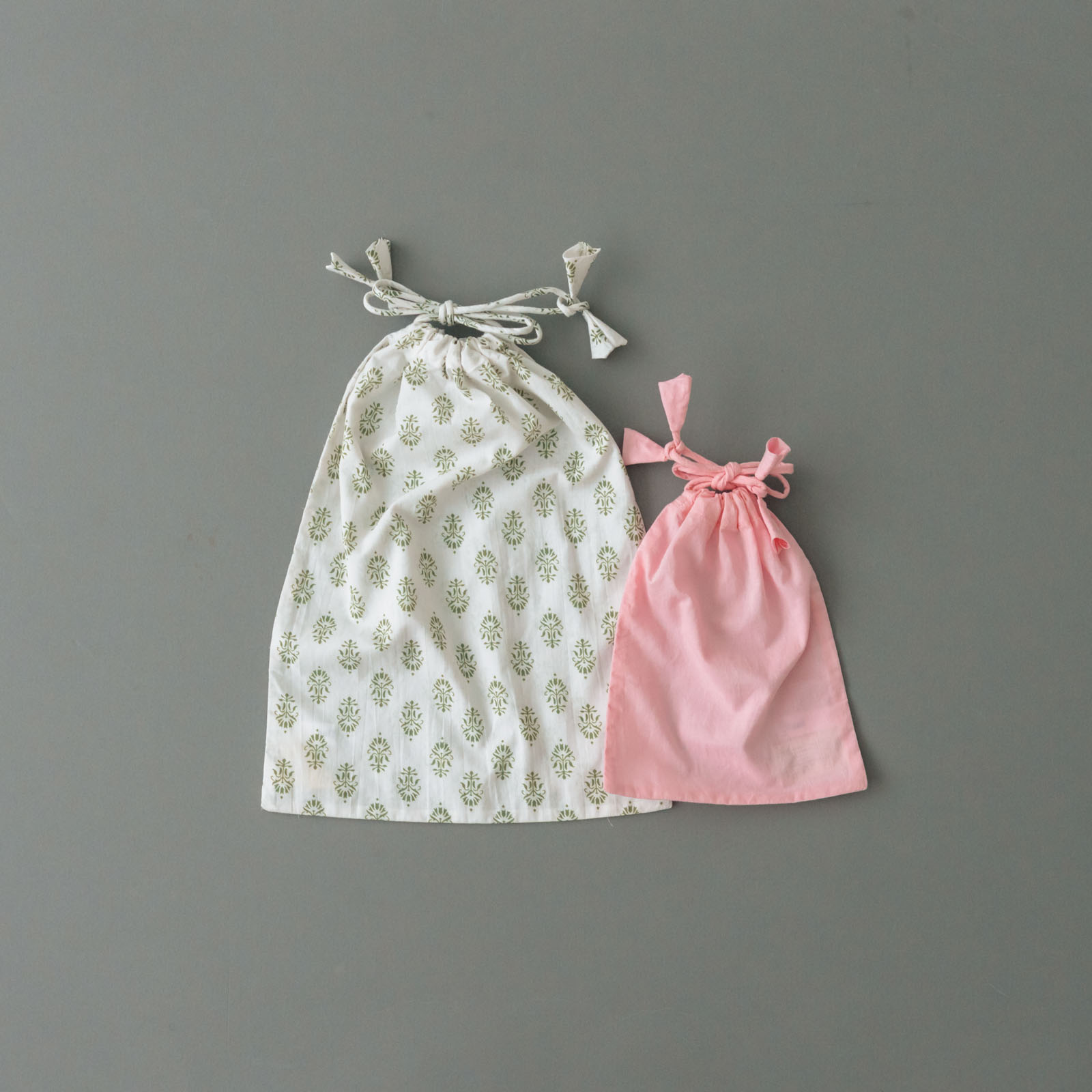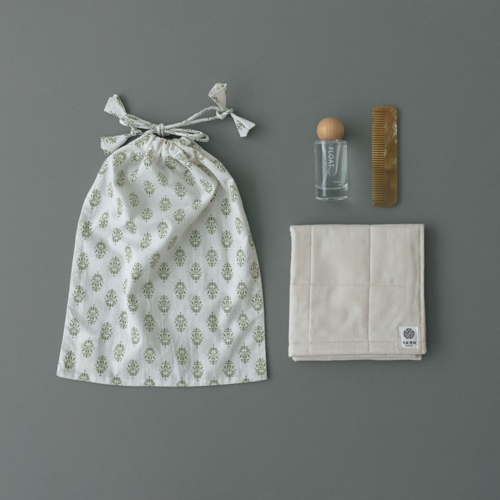 今回、リリーセージの柄や発色の美しい無地のドローストリングバッグのセットを、くらすこと別注で作っていただきました。