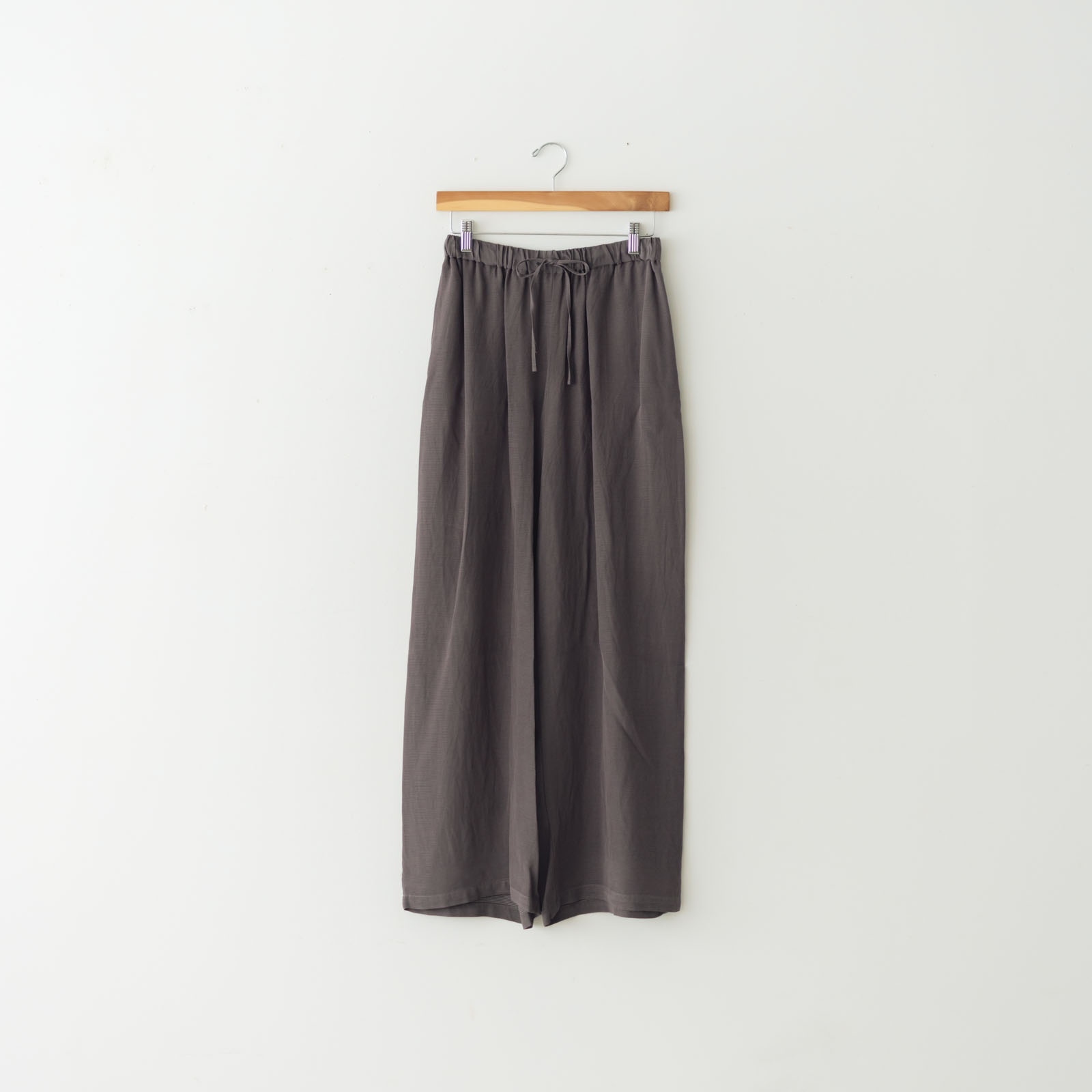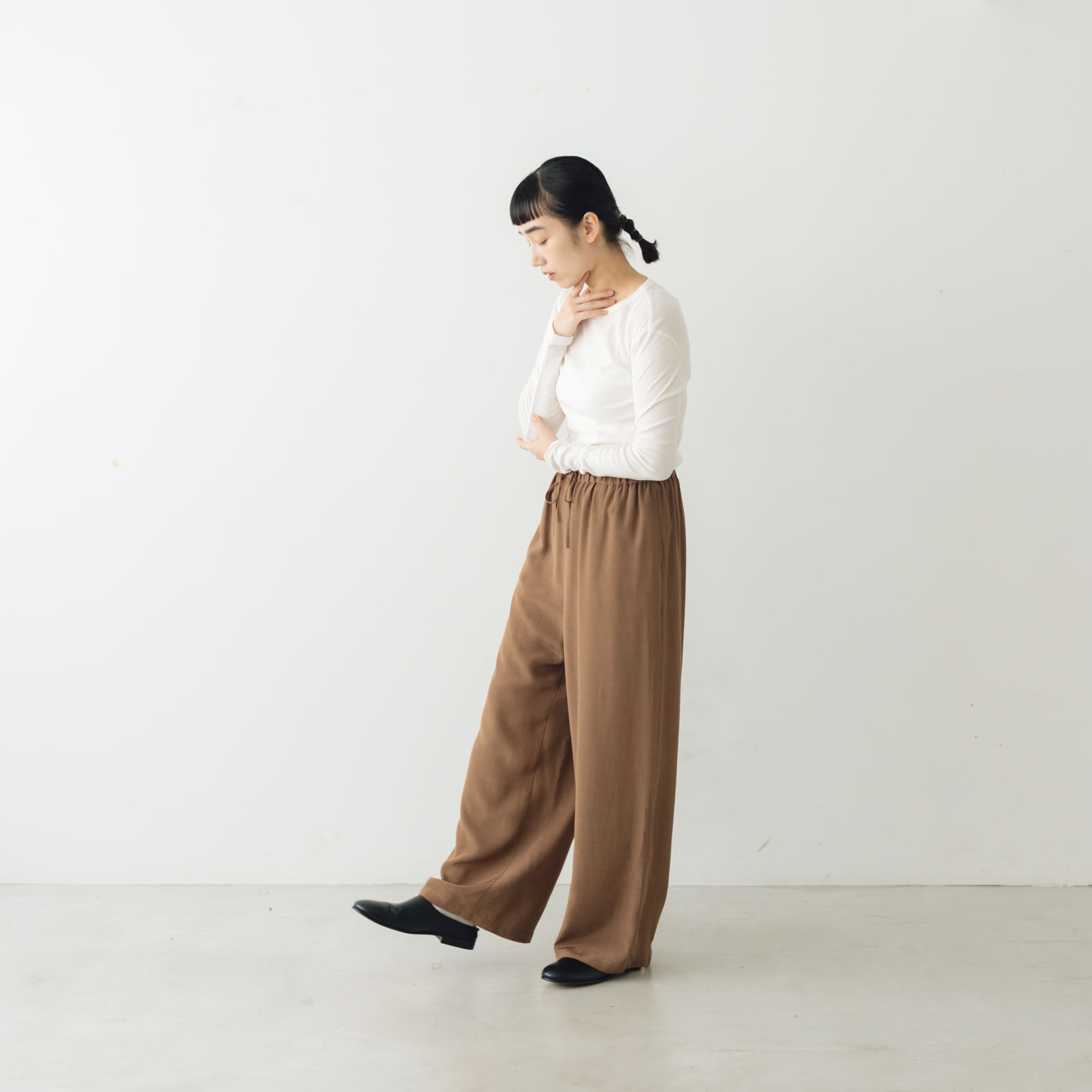 トロンとした落ち感のある素材で、大人っぽく履けるパンツ。