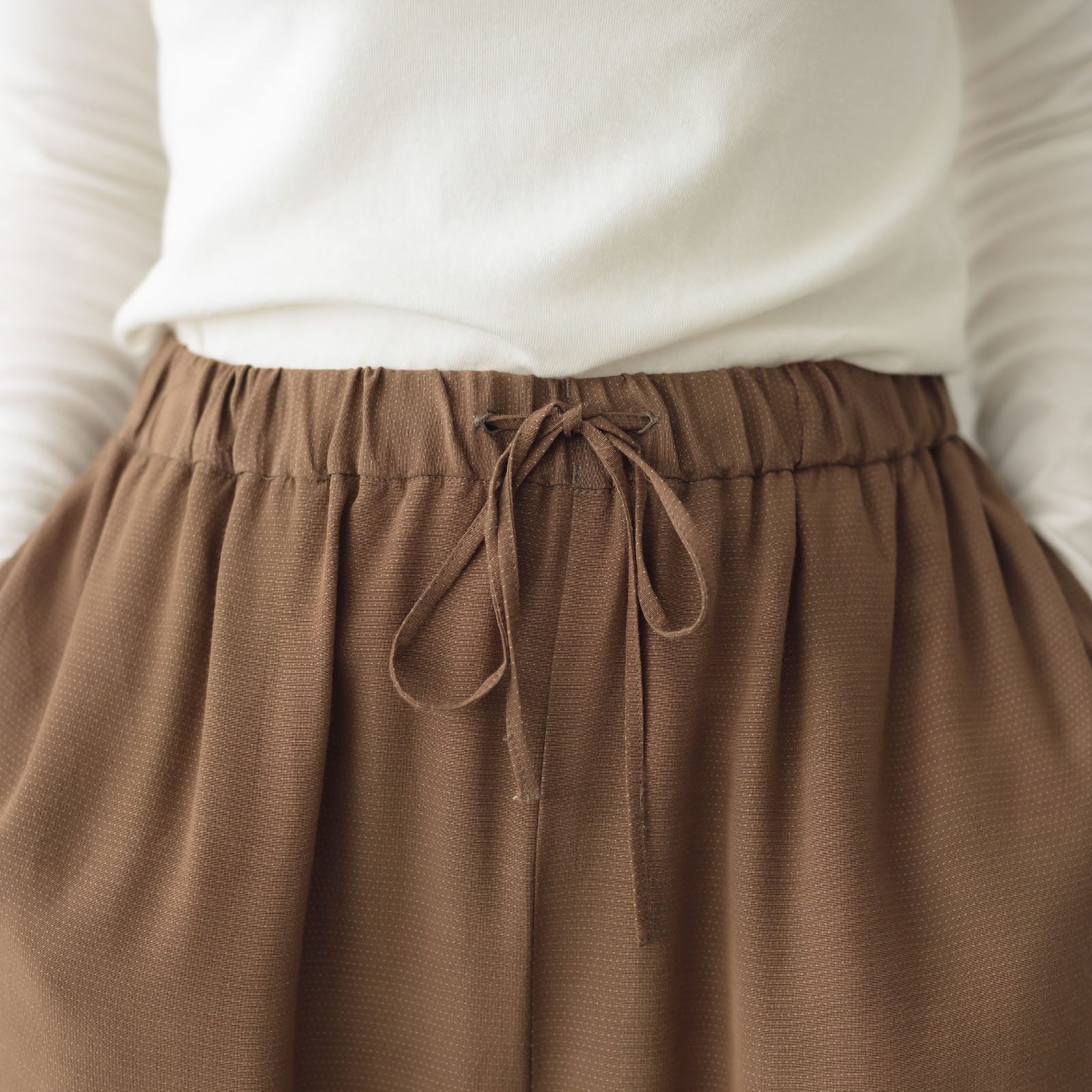 サイズの微調整ができる紐付きで、トップスをインする時はこの紐がアクセントに。