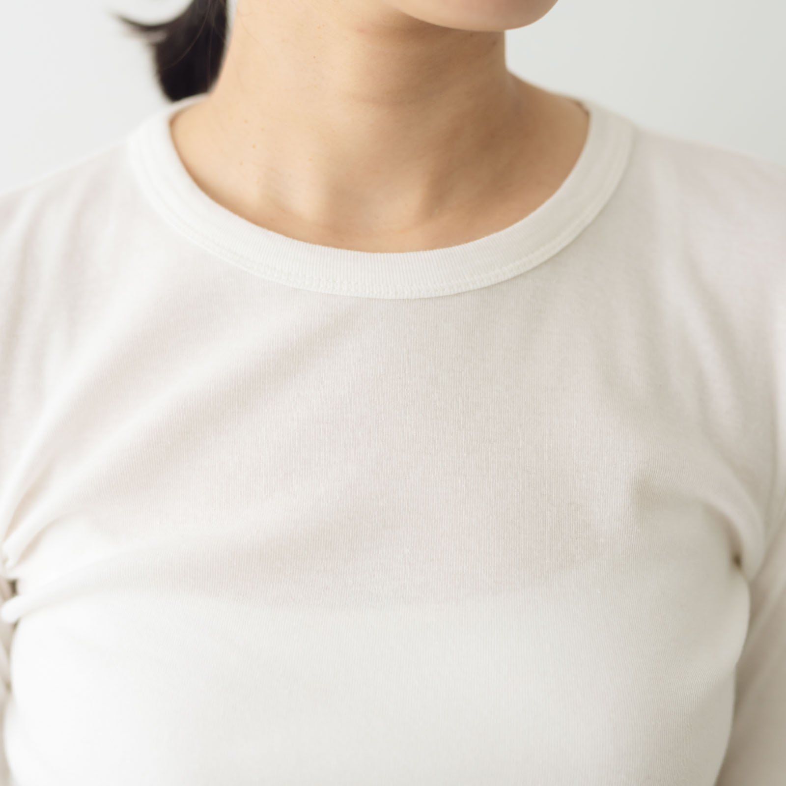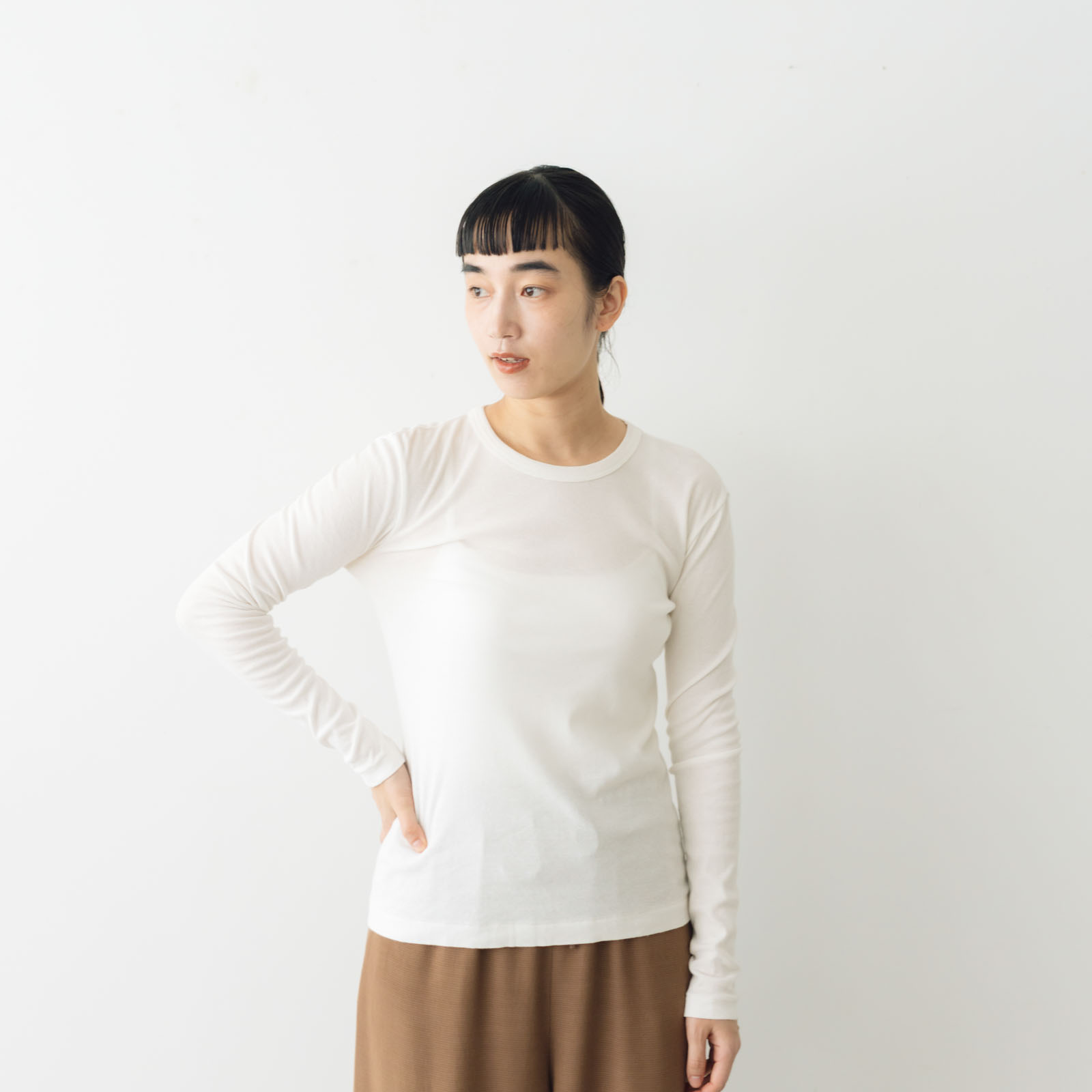 薄手で形がきれいなのでインナーとしてはもちろん、1枚でトップスとしてもお使いいただけます。ハイゲージの薄手のニットやスウェットの下に着ても、上の服に響かない薄さです。