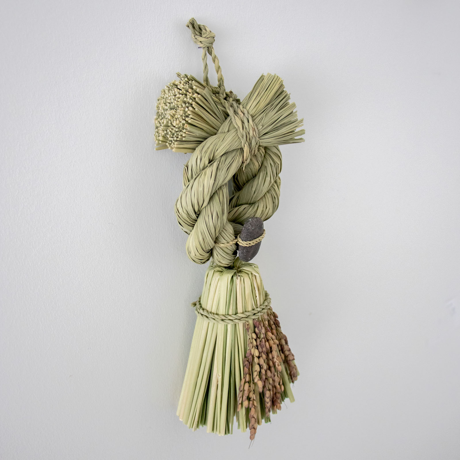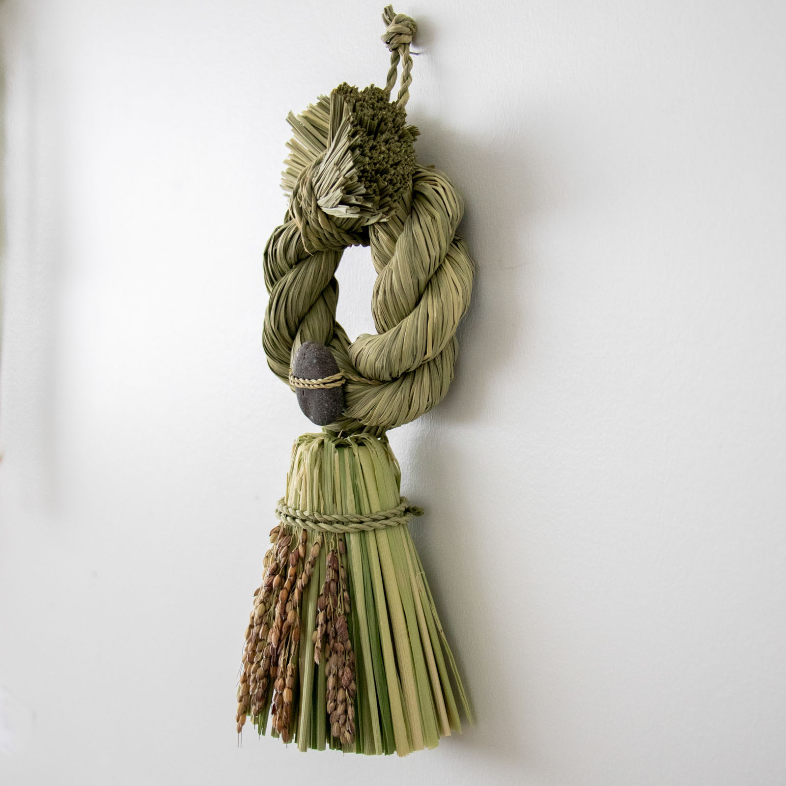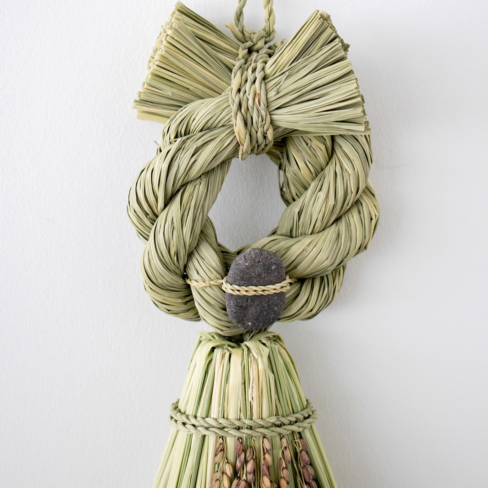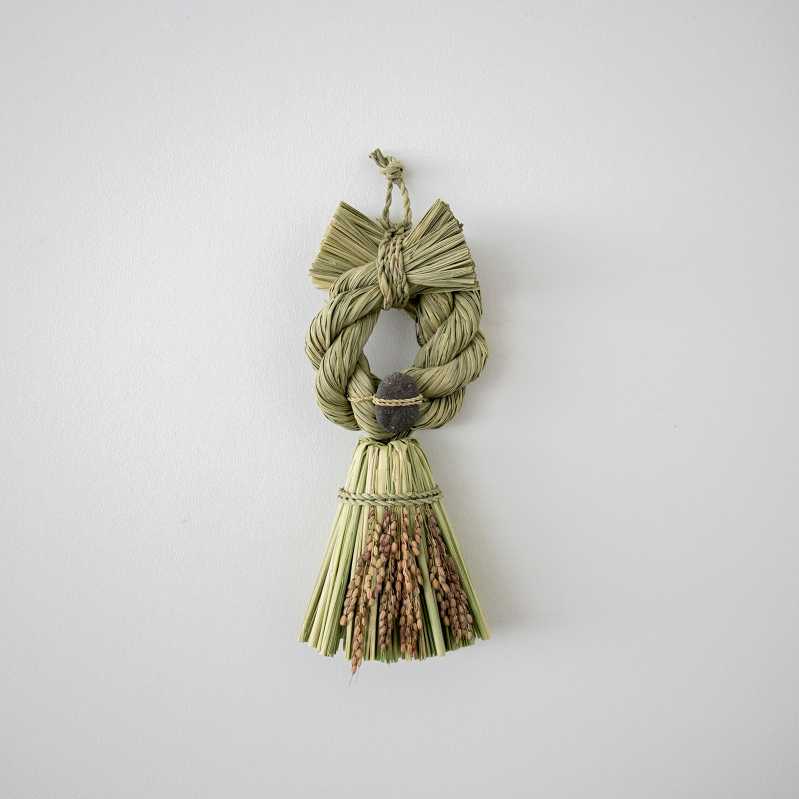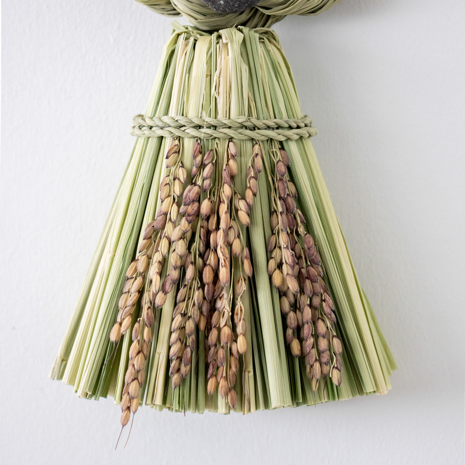 輪をかたどった、お守りのような草飾り。力強さも感じる藁のつくりに、古代米の稲穂と石のあしらいが加えられています。石好きな方にも心ときめく、自然の素材が織りなす一点です。