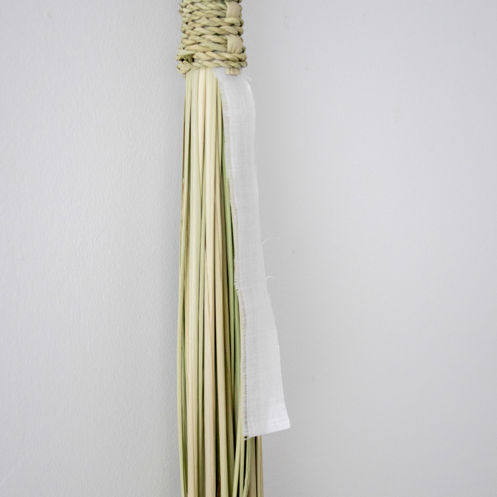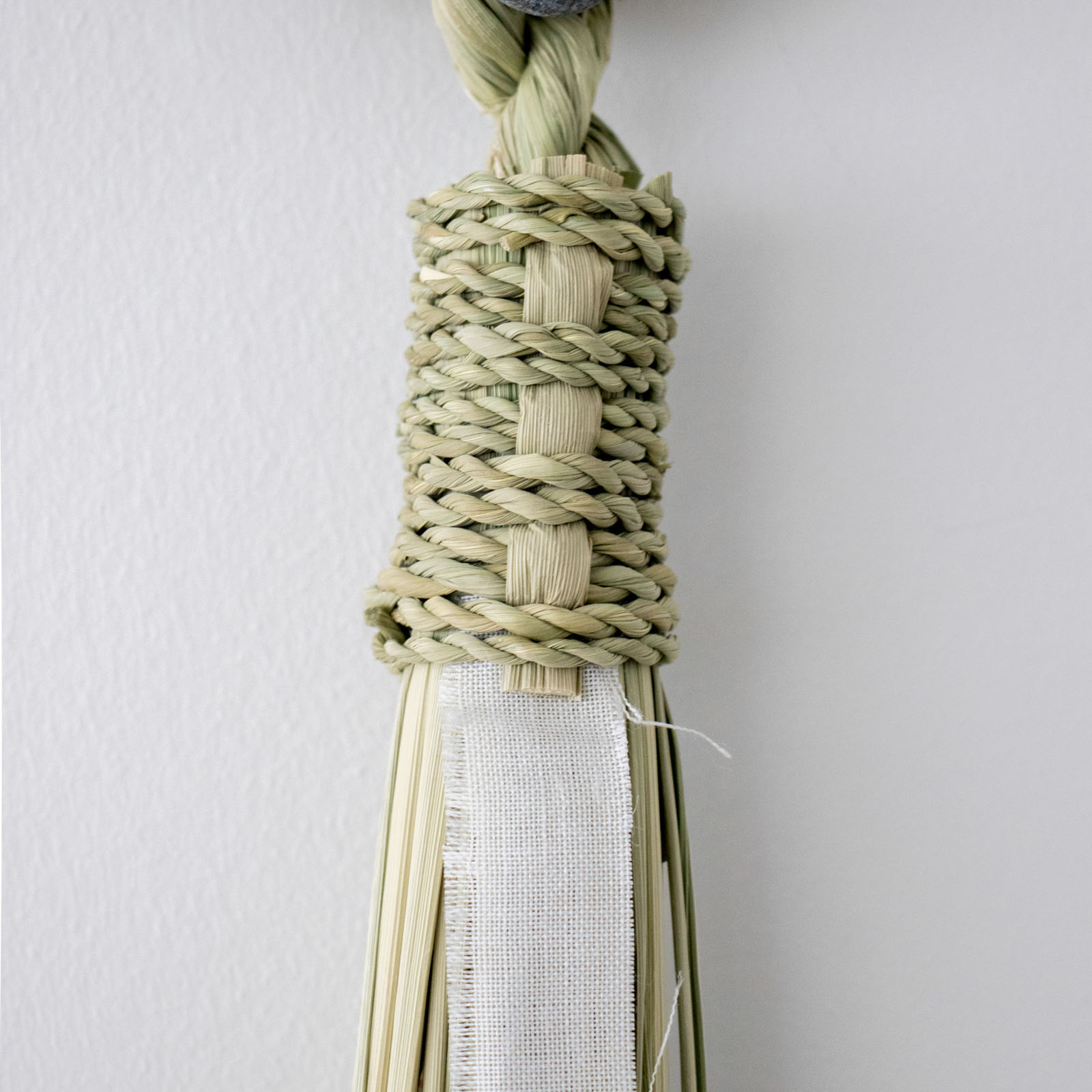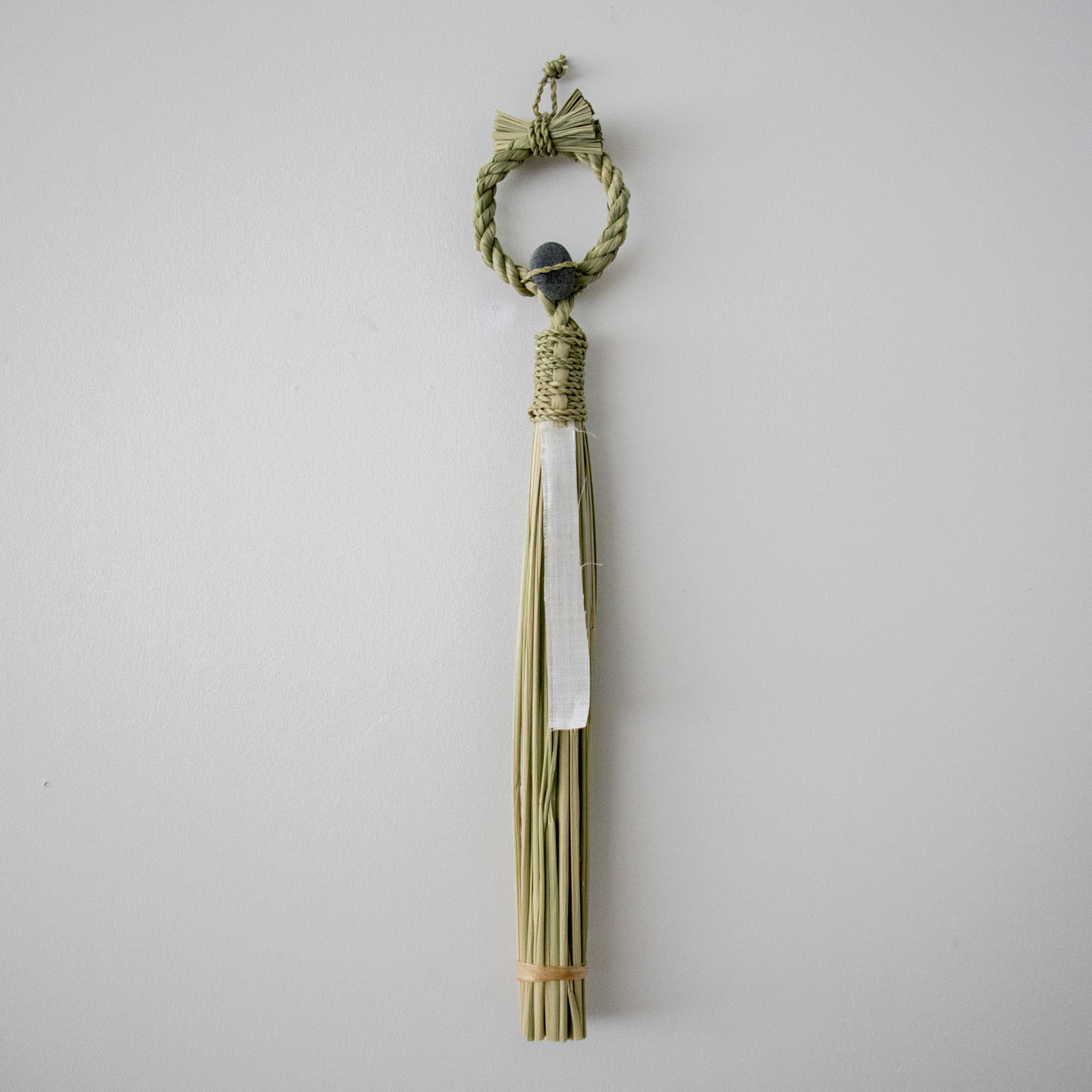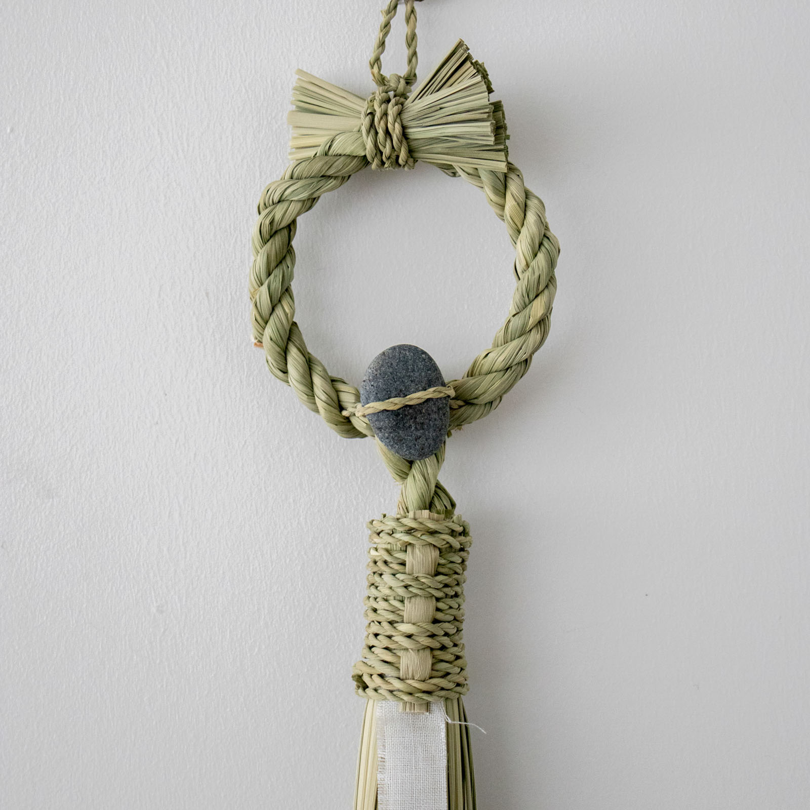 縦長く、すっとした印象の草飾りは、ひとつひとつ撚ってつくられた細縄による繊細な編み目に注目。古来より邪気を祓い清める力を持つとされてき麻布もあしらわれています。石好きな方にも心ときめく、自然の素材が織りなす一点です。