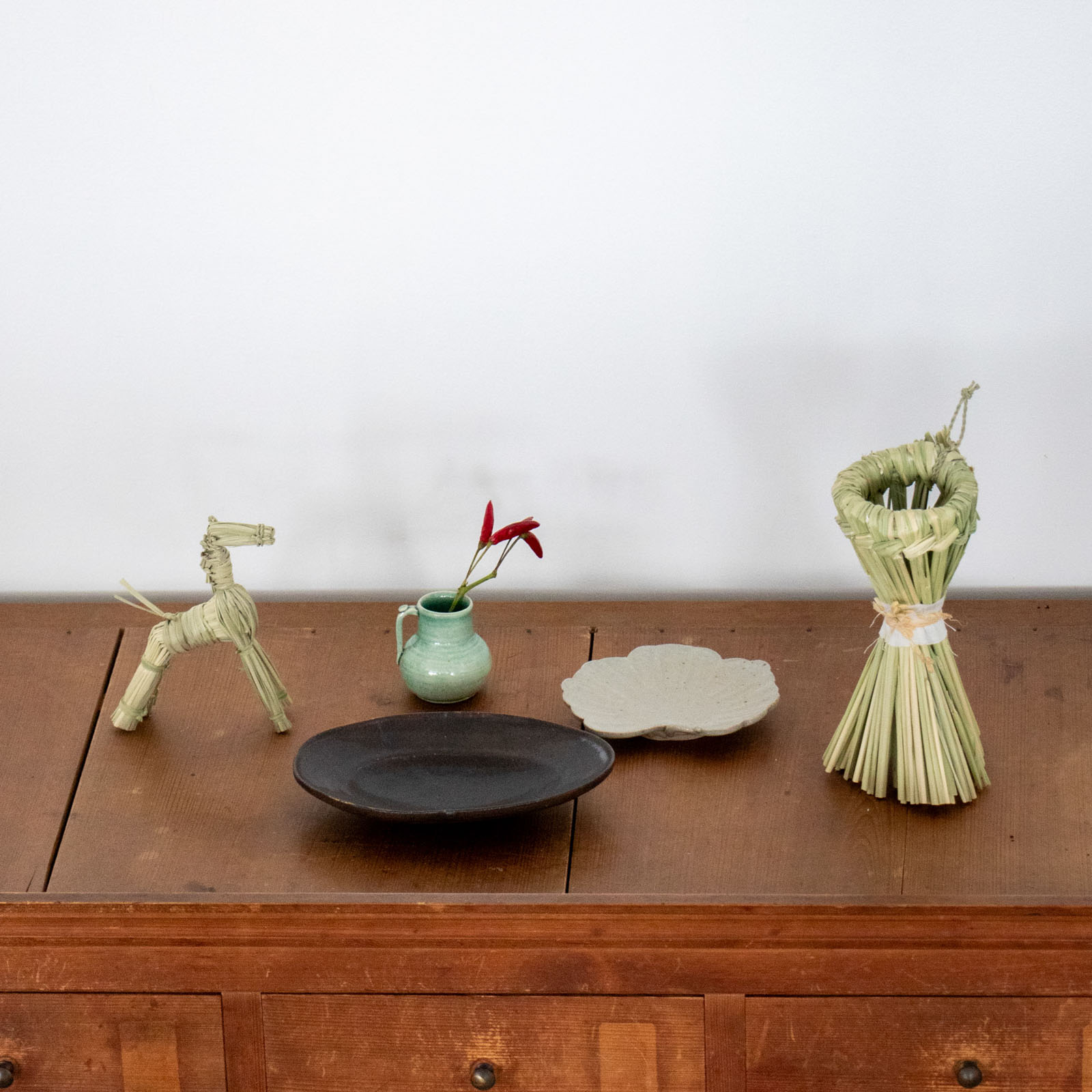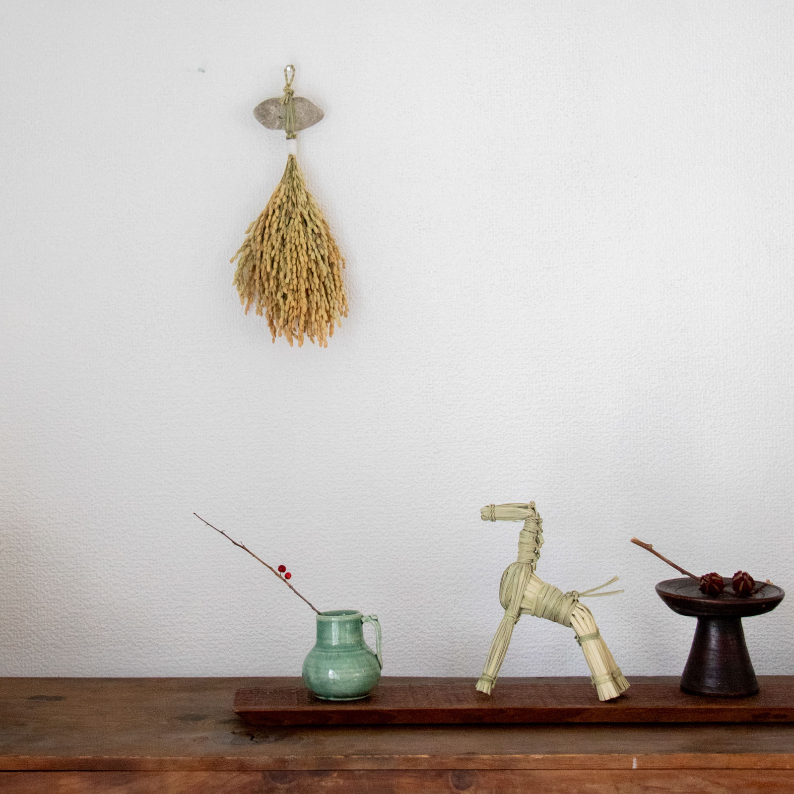 ・藁・稲穂などの天然素材を使用しているため、湿気・高温などにより変色・変形・虫食いが起こる場合があります。ご使用・保管の際は風通しの良い場所で、湿度の高い場所を避けてください。