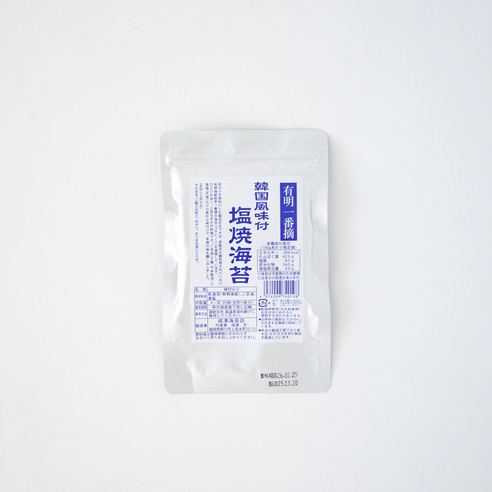 こちらは、有明海産秋芽一番摘みの焼海苔に、ごま油と塩のみで味付けした韓国風の味付のり。