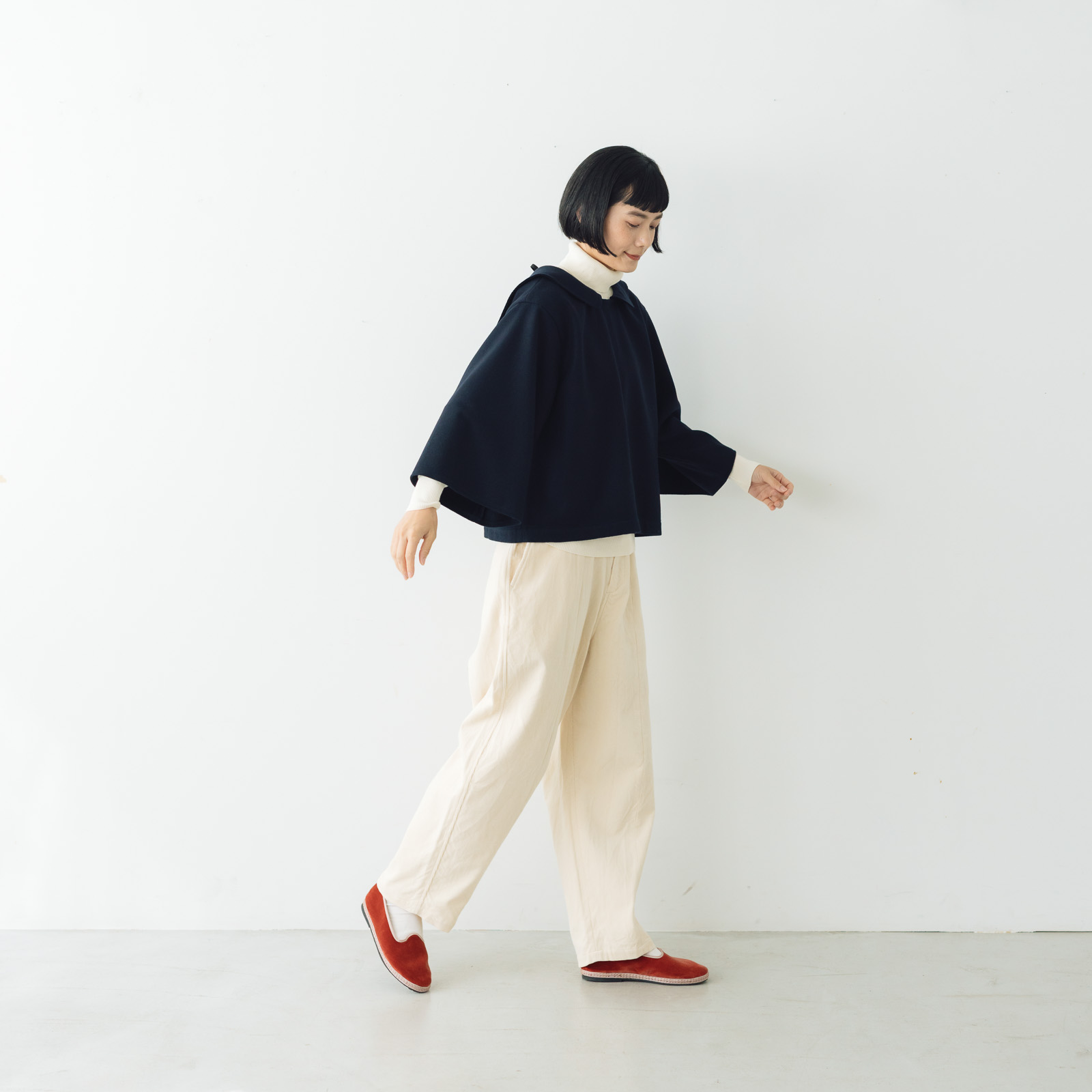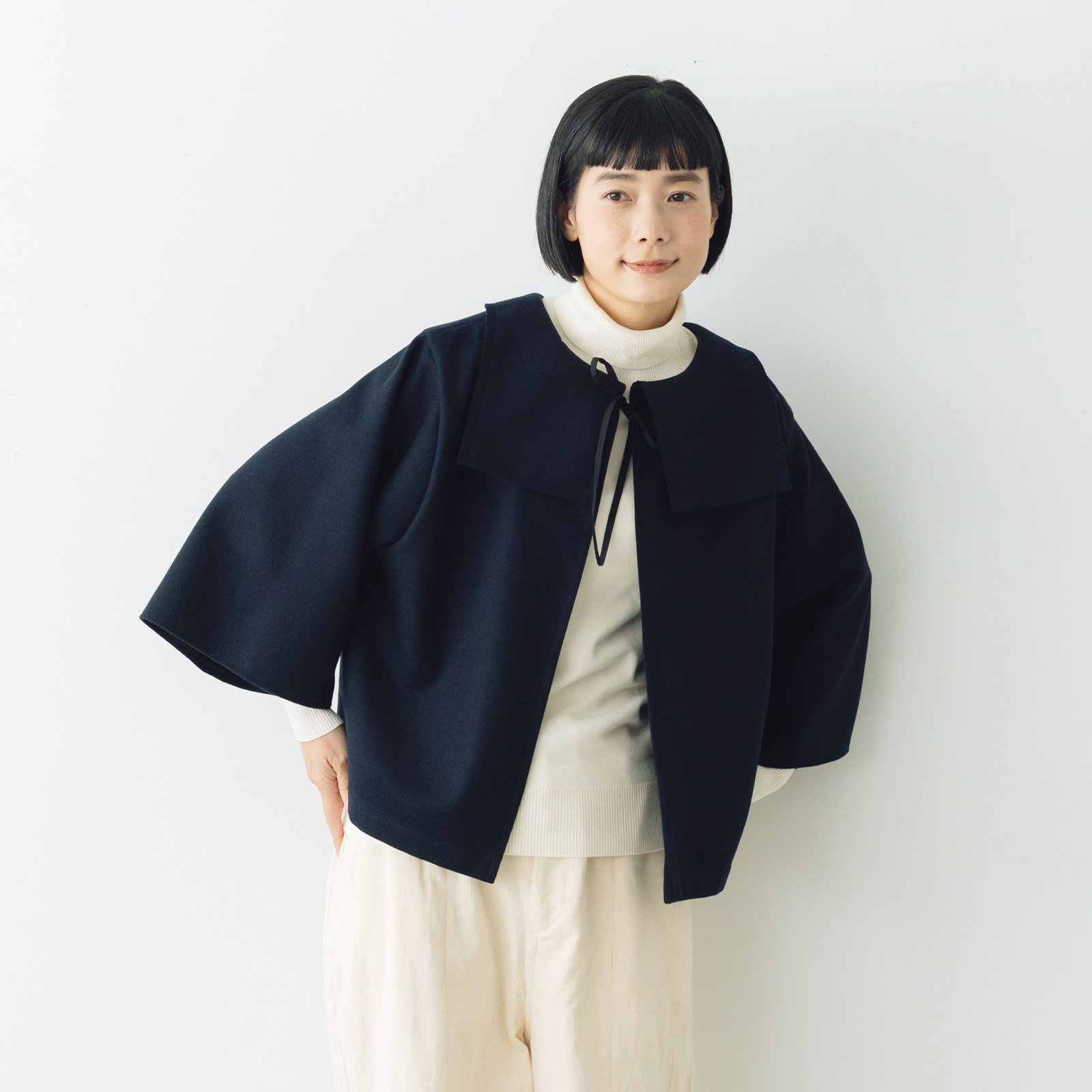 ゆとりがあるので、中にタートルやボーダーを合わせても窮屈になりません。